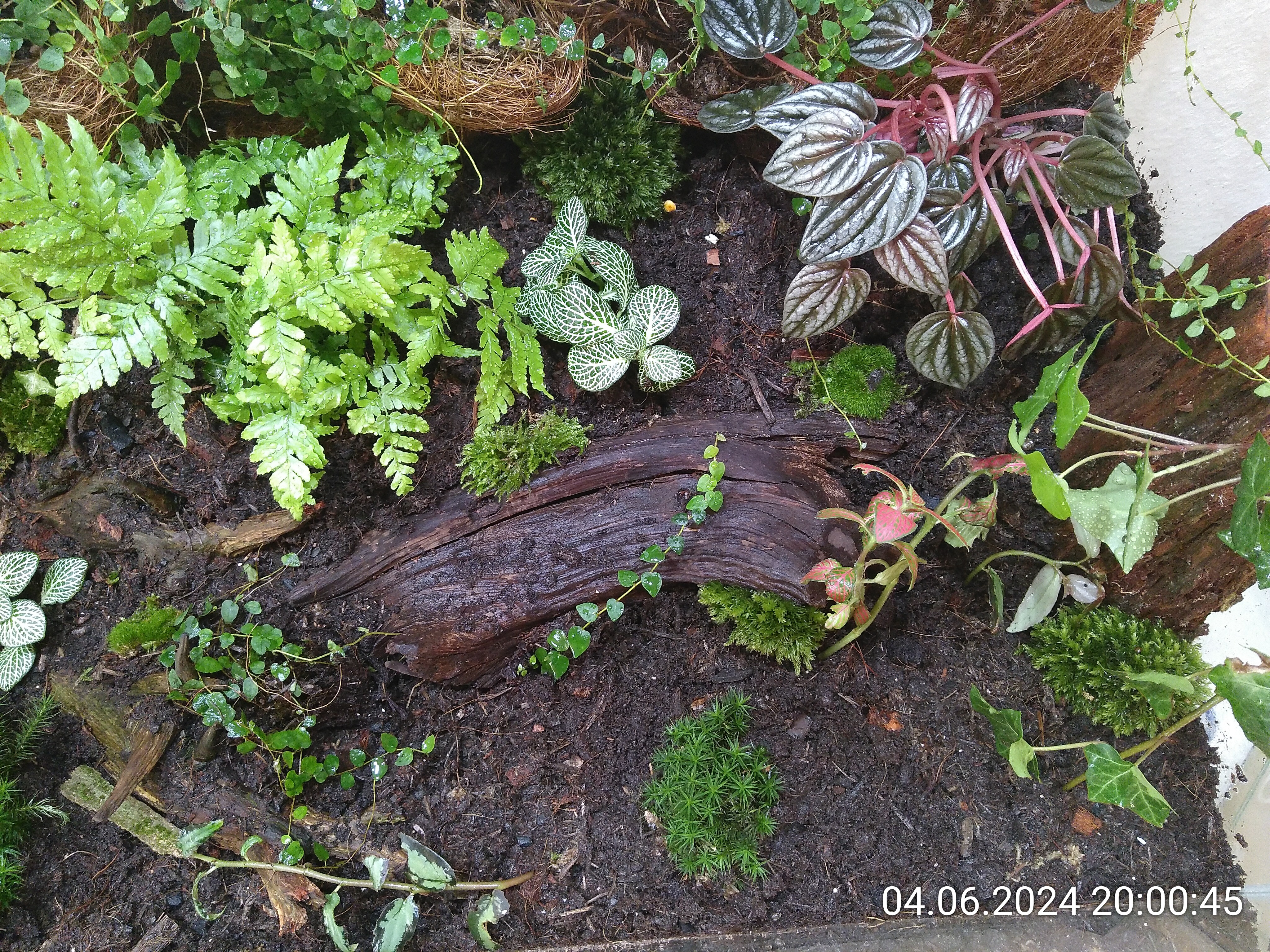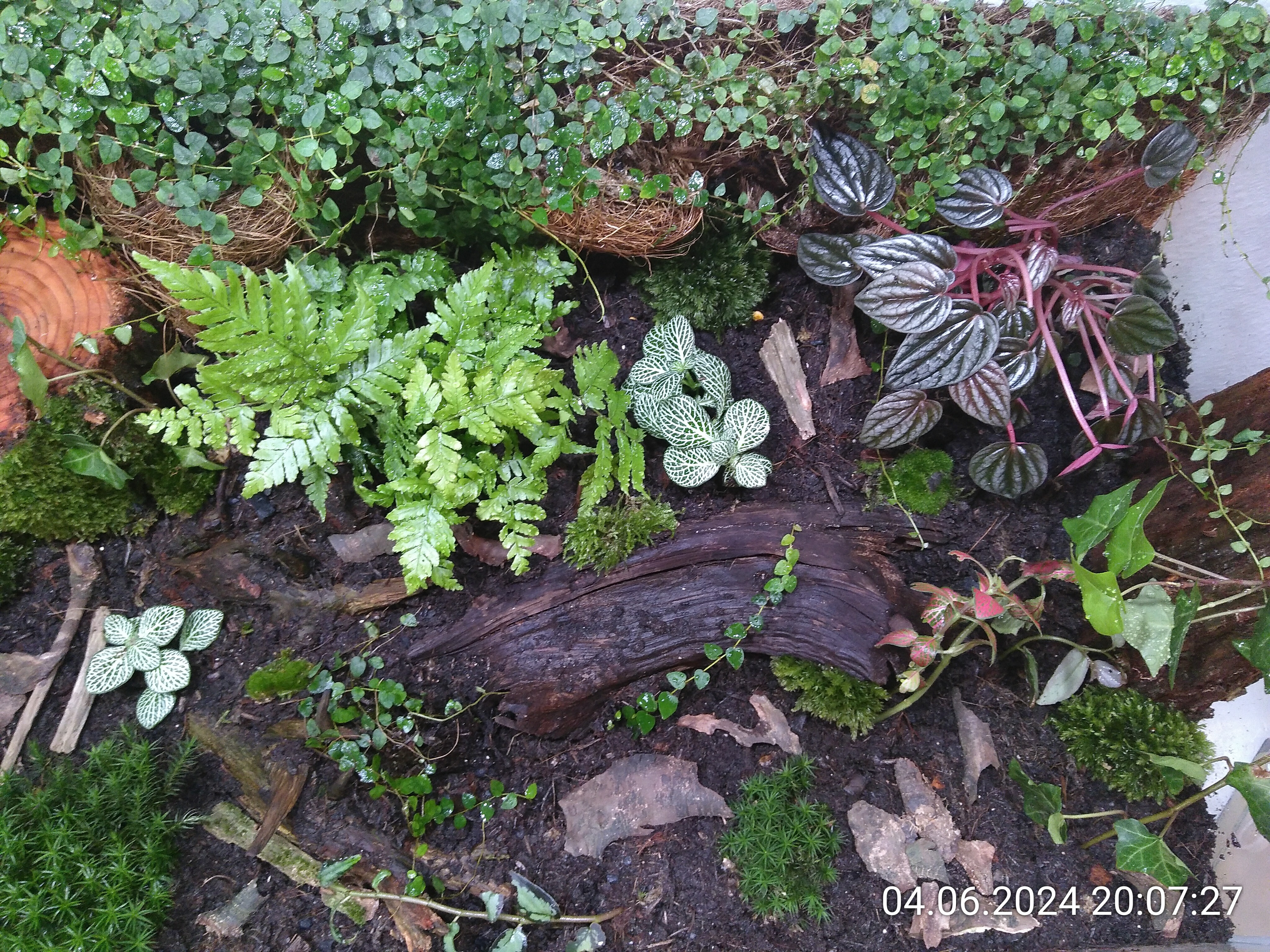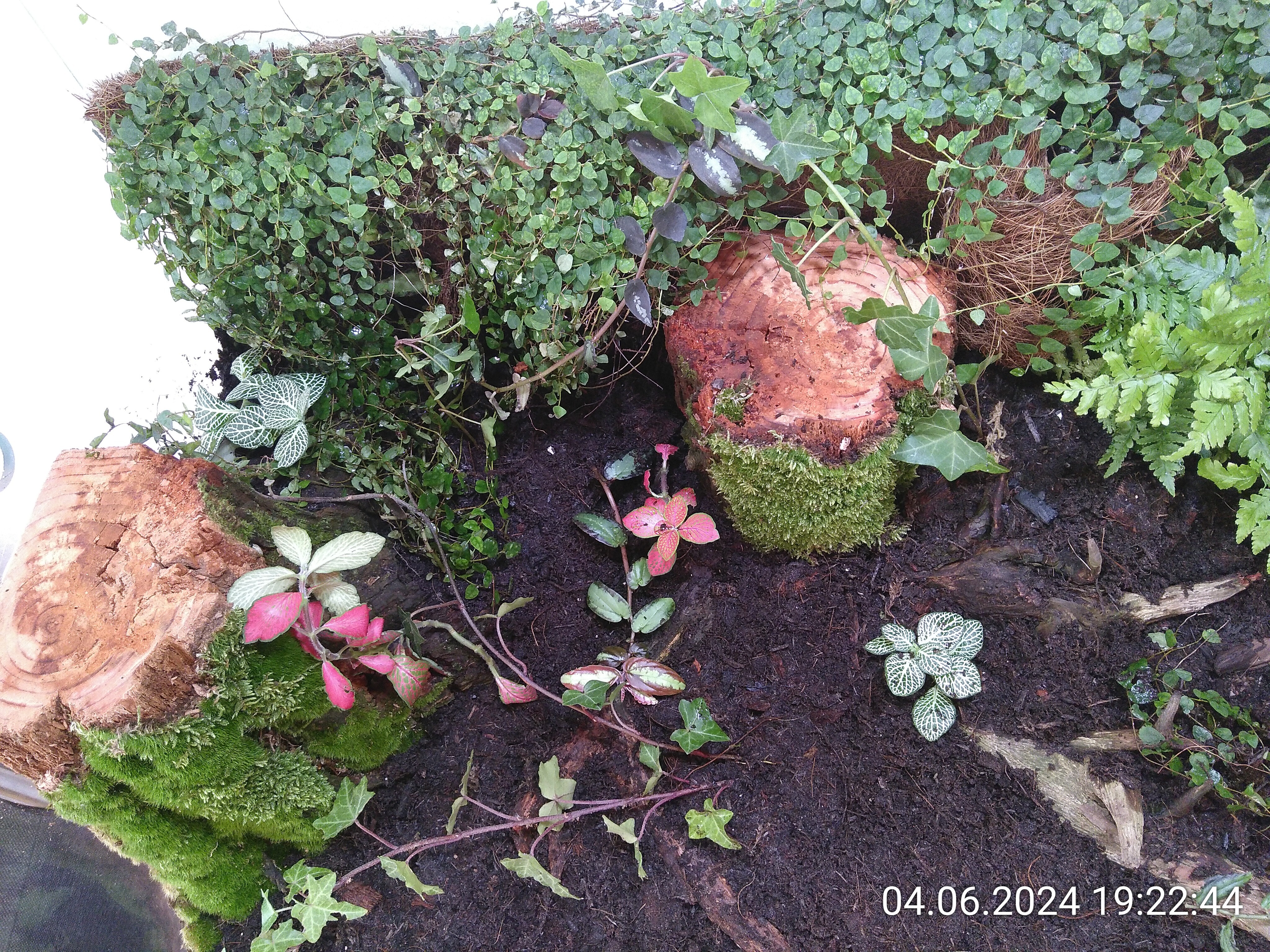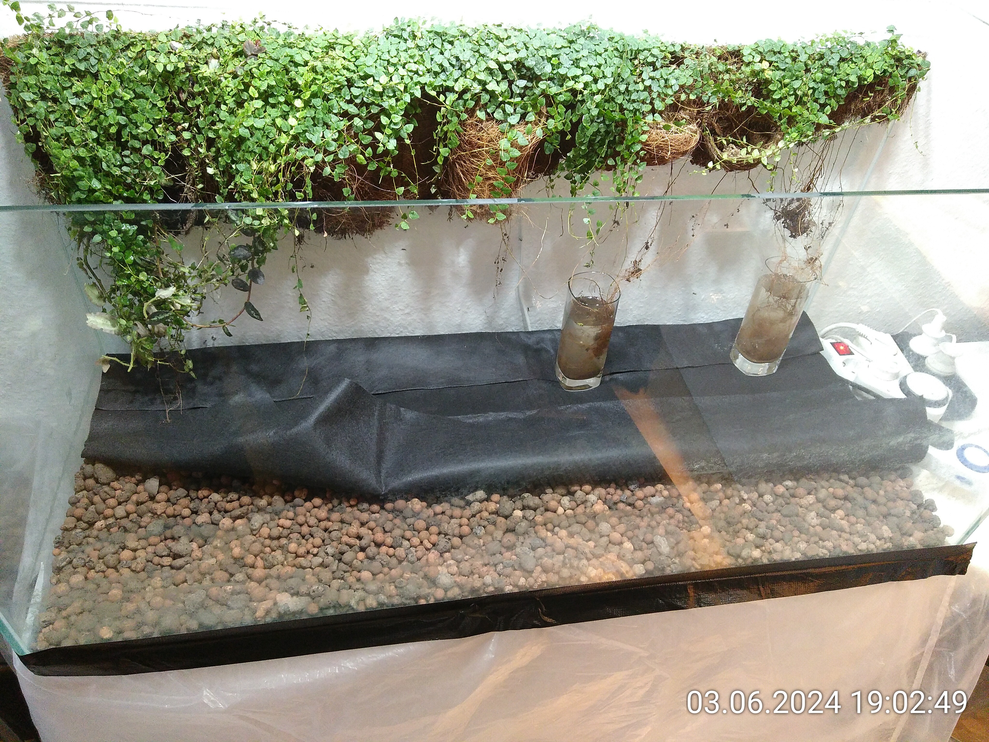 Schritt eins war einfach. Eine Drainageschicht aus Seramis und ein Vlies oben drauf, damit die Erde sich nicht dazwischen mischt. Mit den Ranken an der Rückwand starten zu können, war ein riesiger Vorteil für die anschließende Gestaltung. Meine Lebenserhaltungsbemühungen waren zum Glück größtenteils erfolgreich, wie ich wohl mittlerweile sagen kann.
