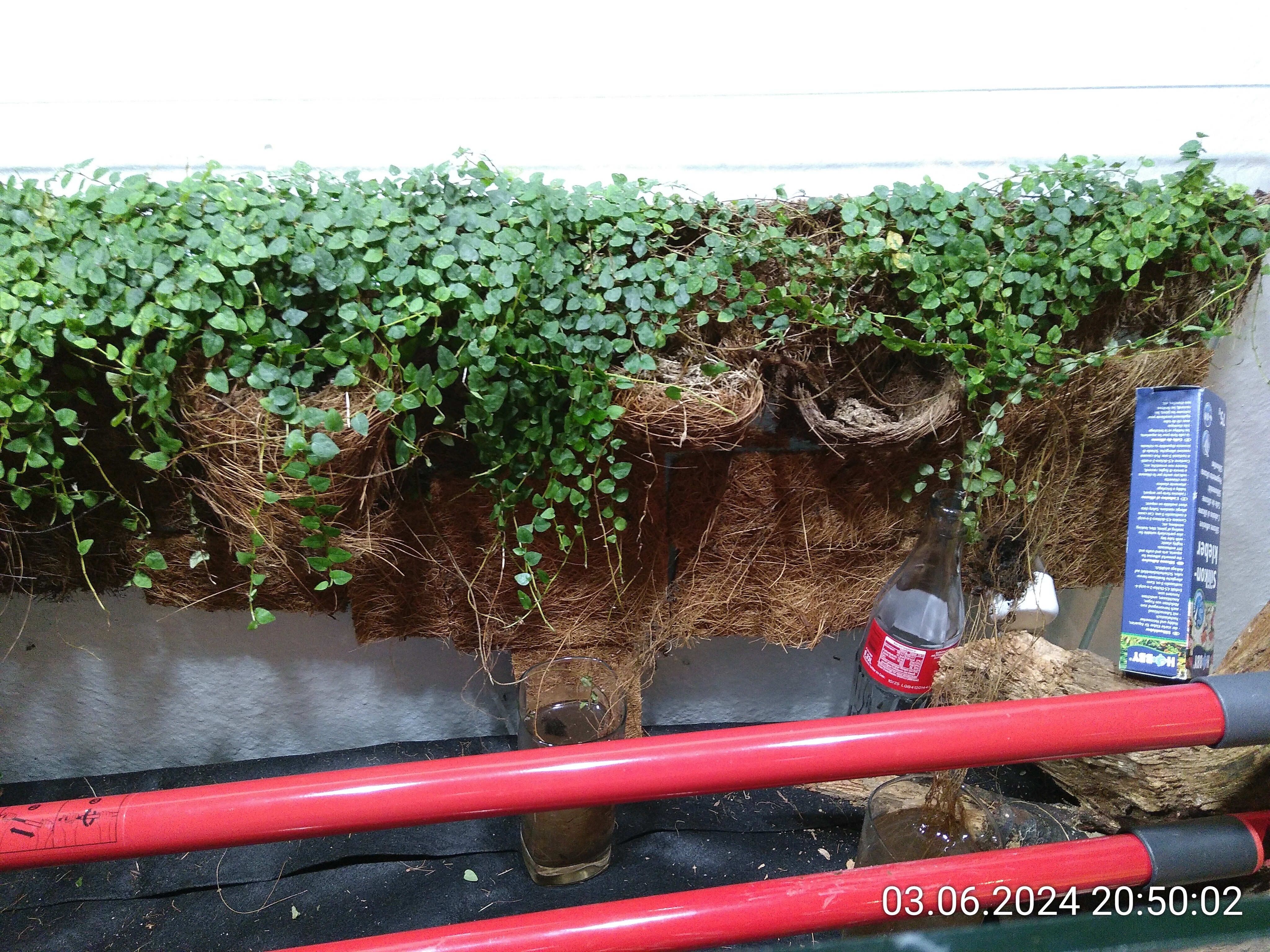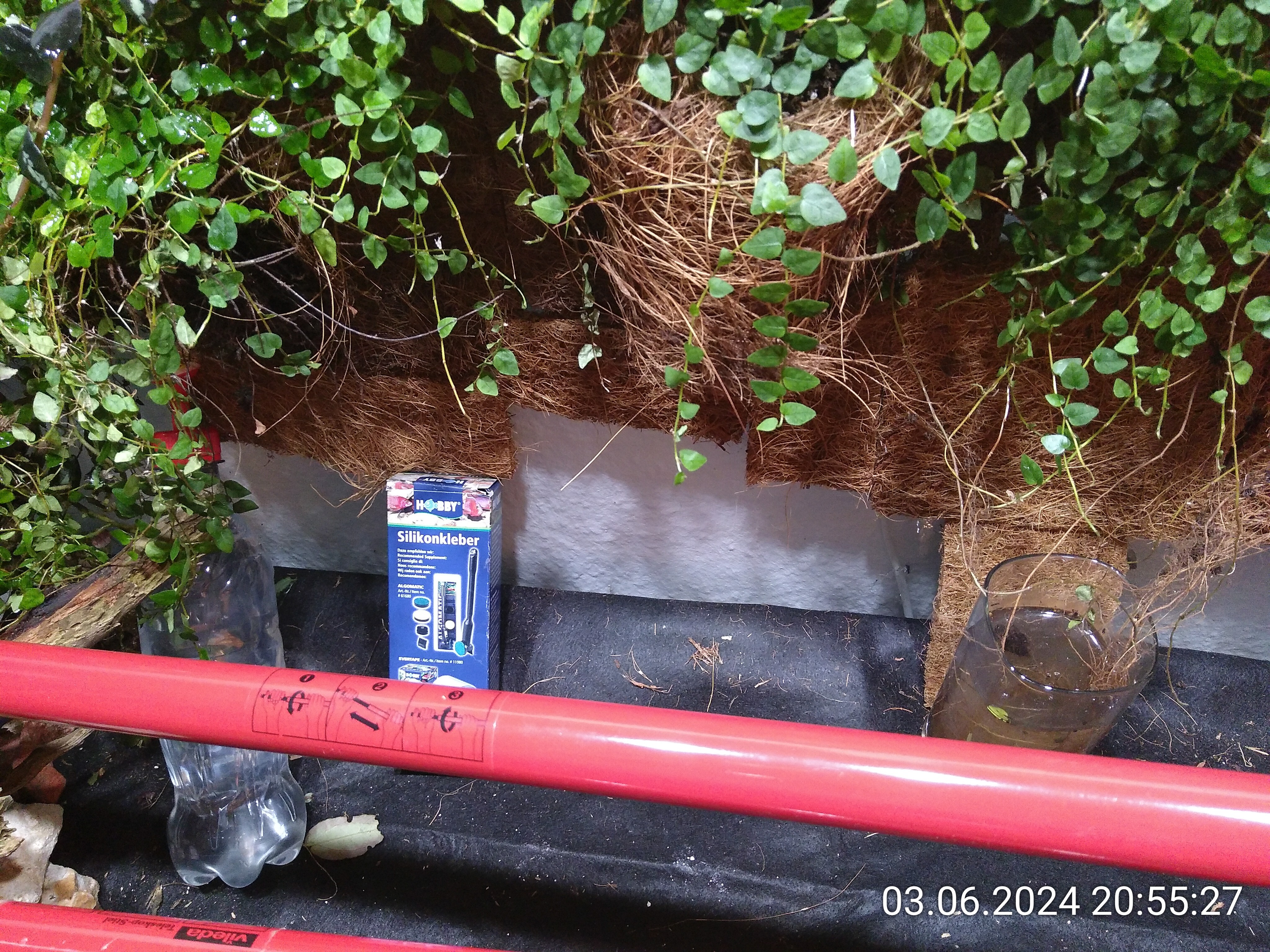 Da ich das Silikon schon in der Hand hatte, habe ich noch schnell mit den Resten ein paar Kokosmattenreste vom letzten Mal unten an die Rückwand geklebt und sie mit allem, was ich gerade finden konnte, abgestützt. Das musste nicht perfekt sein und ist es auch nicht geworden.