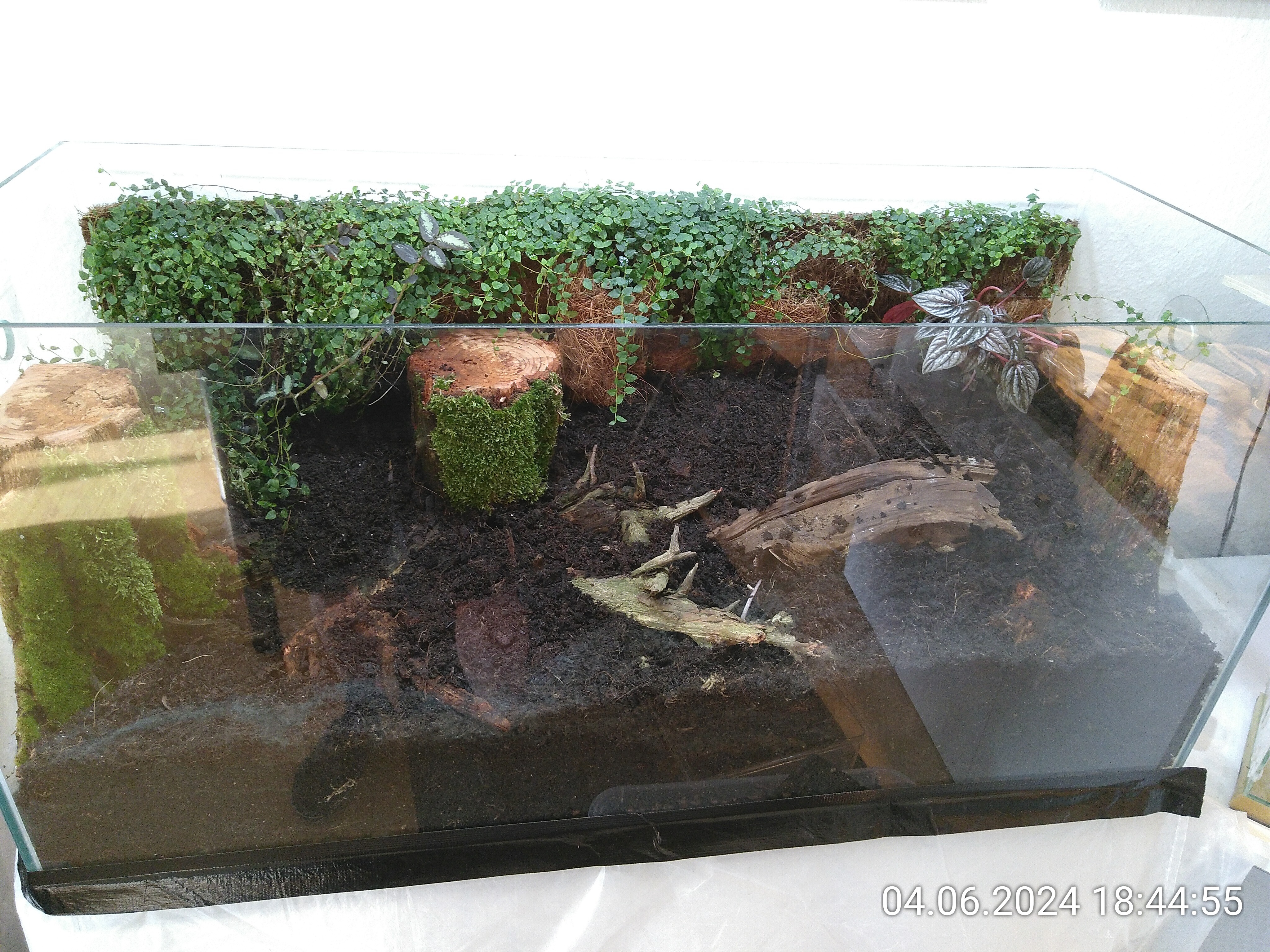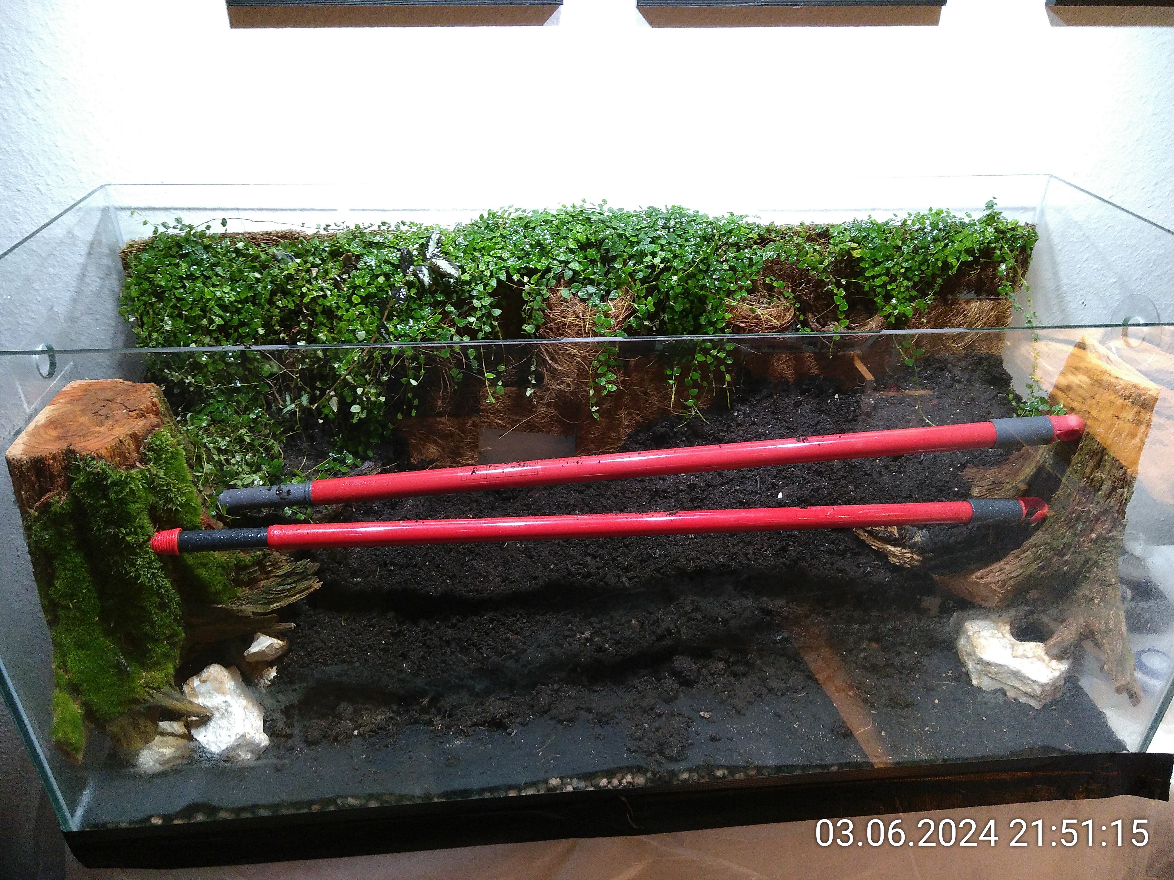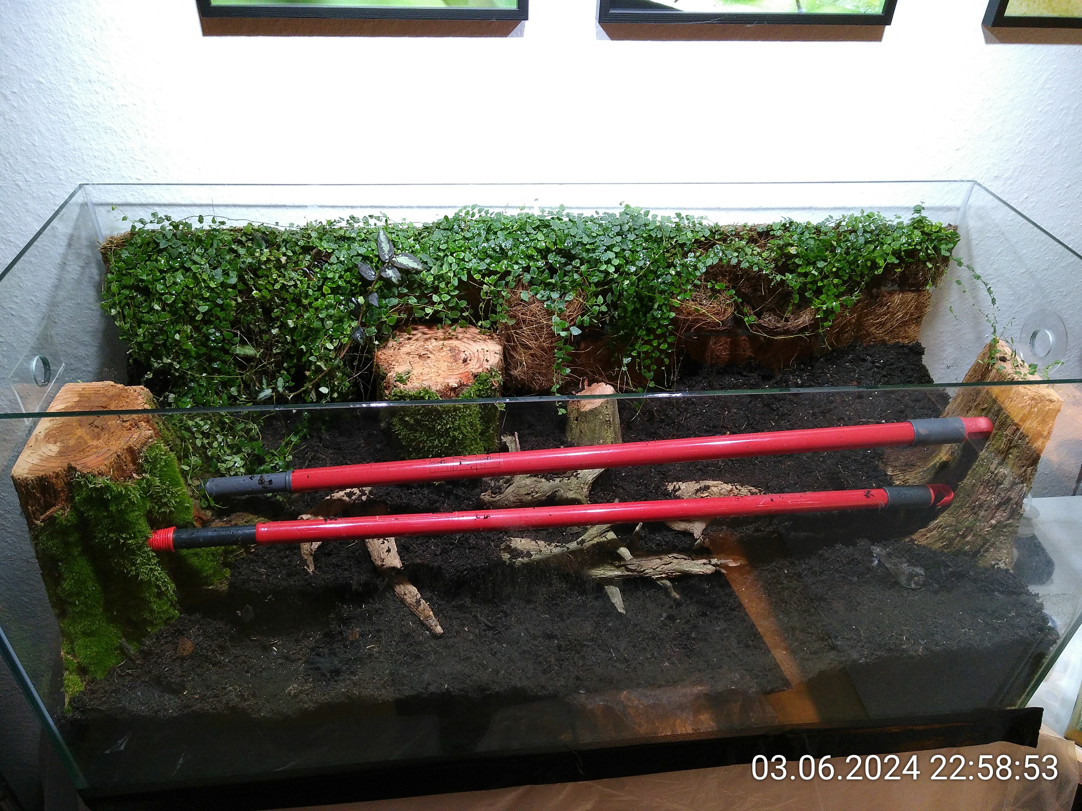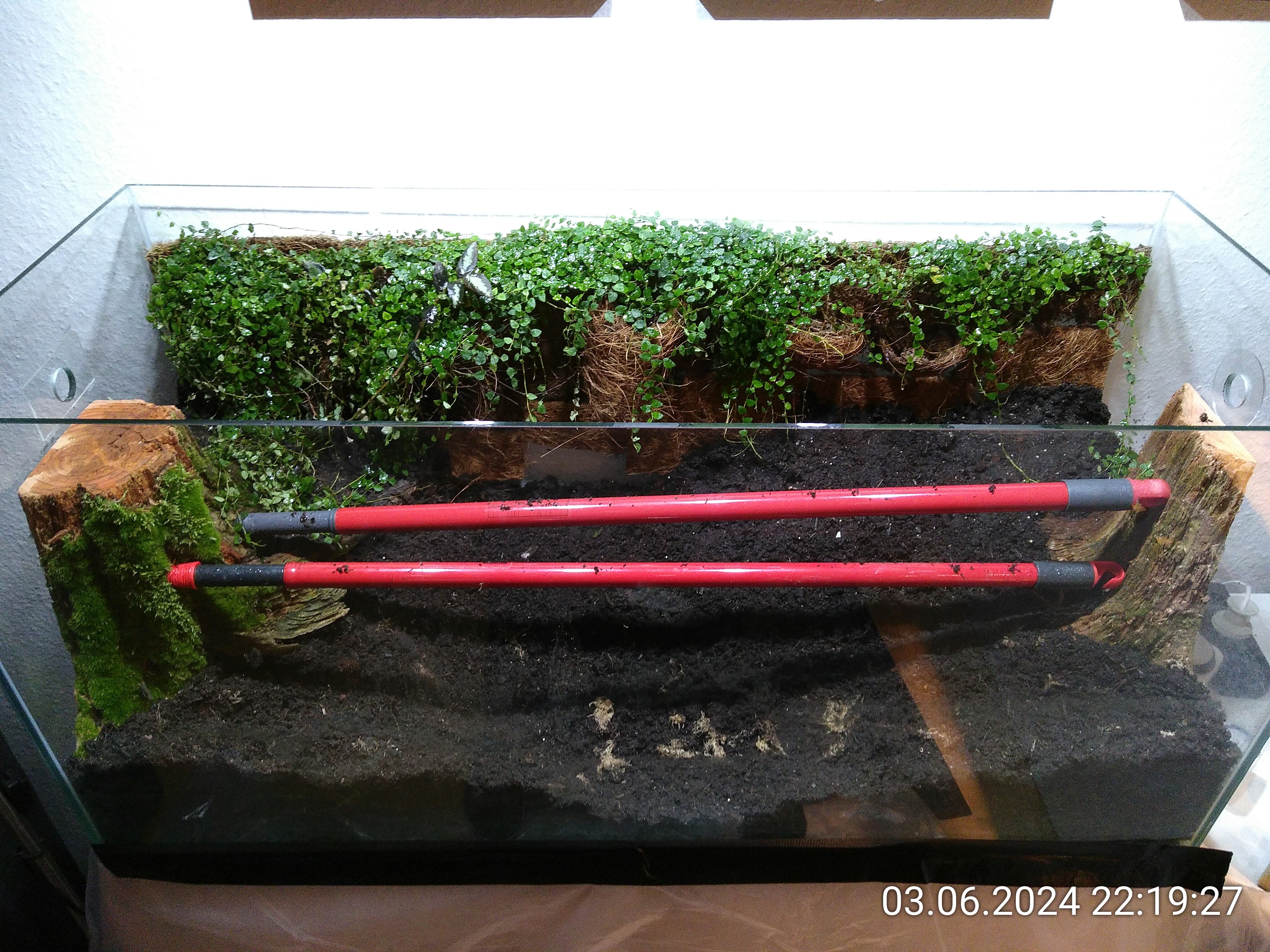 Nachdem ich die Besenstiele entfernt hatte, habe ich noch ein wenig Erde eingefüllt und dann die grobe Struktur mit ein paar Wurzelstücken vorgegeben. Auch wenn man davon später nicht viel sehen würde. Dadurch konnte ich aber leichter mehrere Ebenen im Becken schaffen und es sieht einfach natürlicher aus, auch wenn man nur ein kleines Stück davon sieht. Kleiner Tipp: Nach hinten immer ansteigend. Rechts liegt das Wurzelstück, das schon im Dschungel zum Einsatz kam. Von unten, da gibt einen Hohlraum, ist es mit Schnecken und Asseln geimpft. Es lag die letzten beiden Tage im Asselarium.