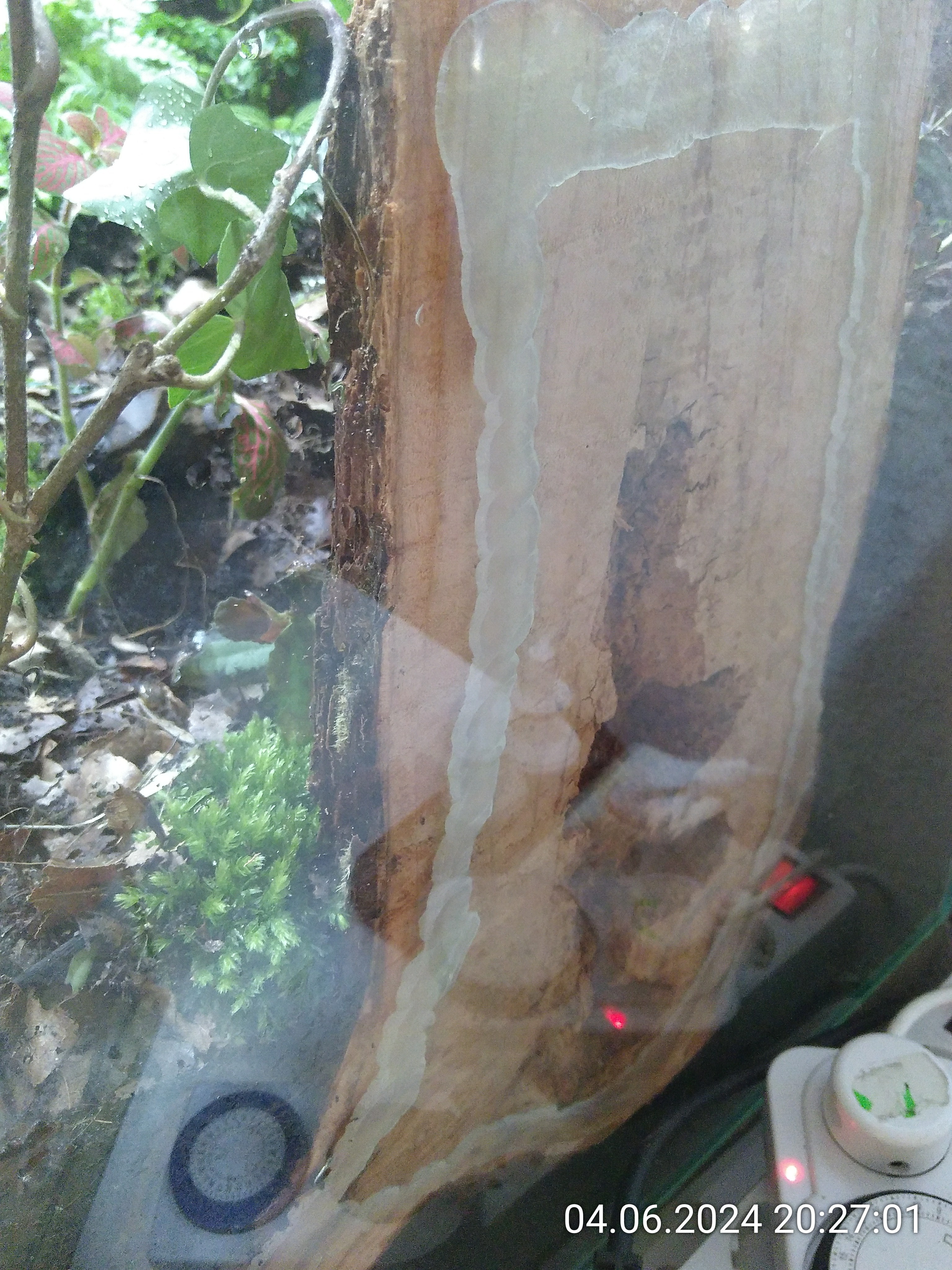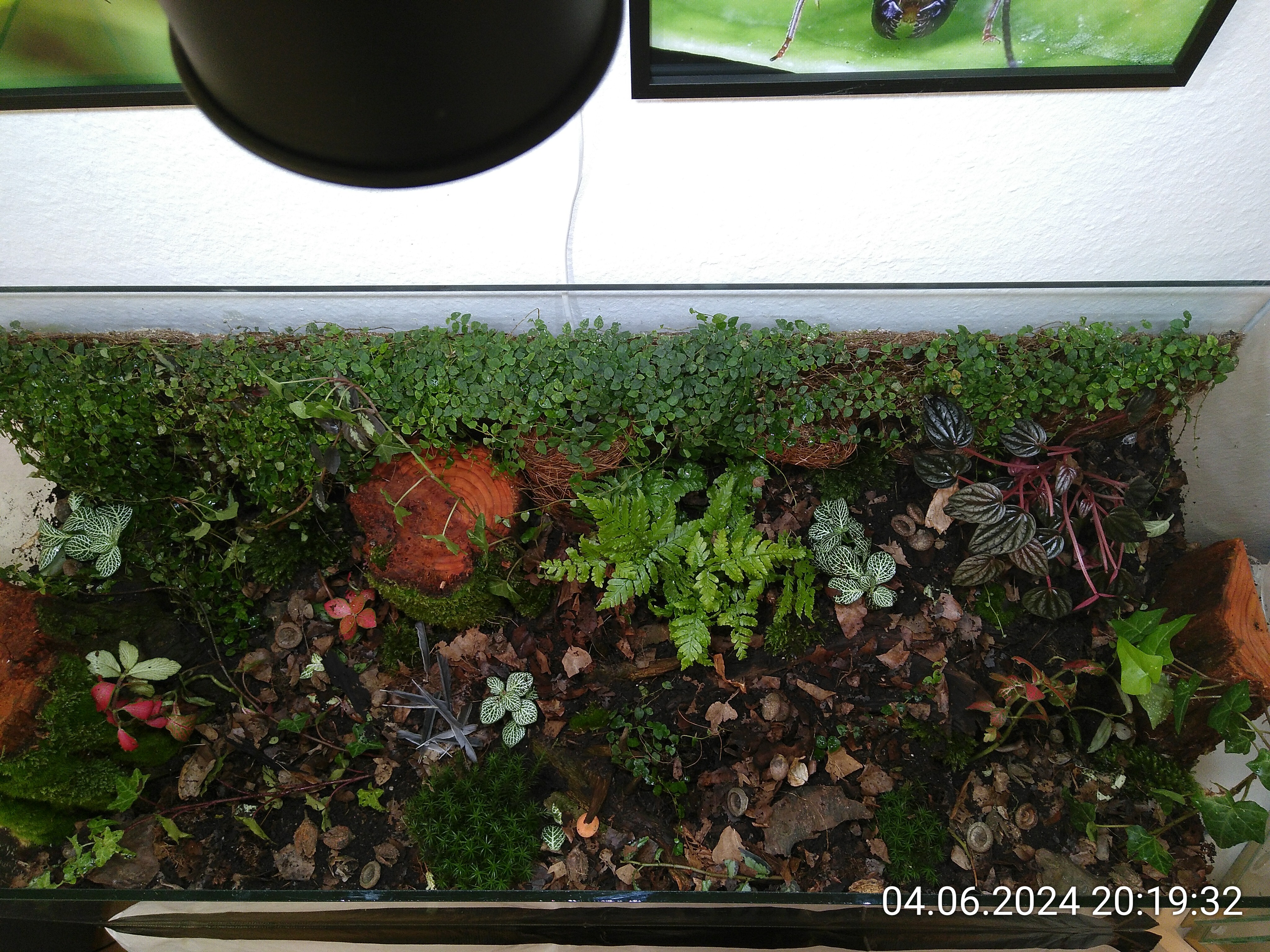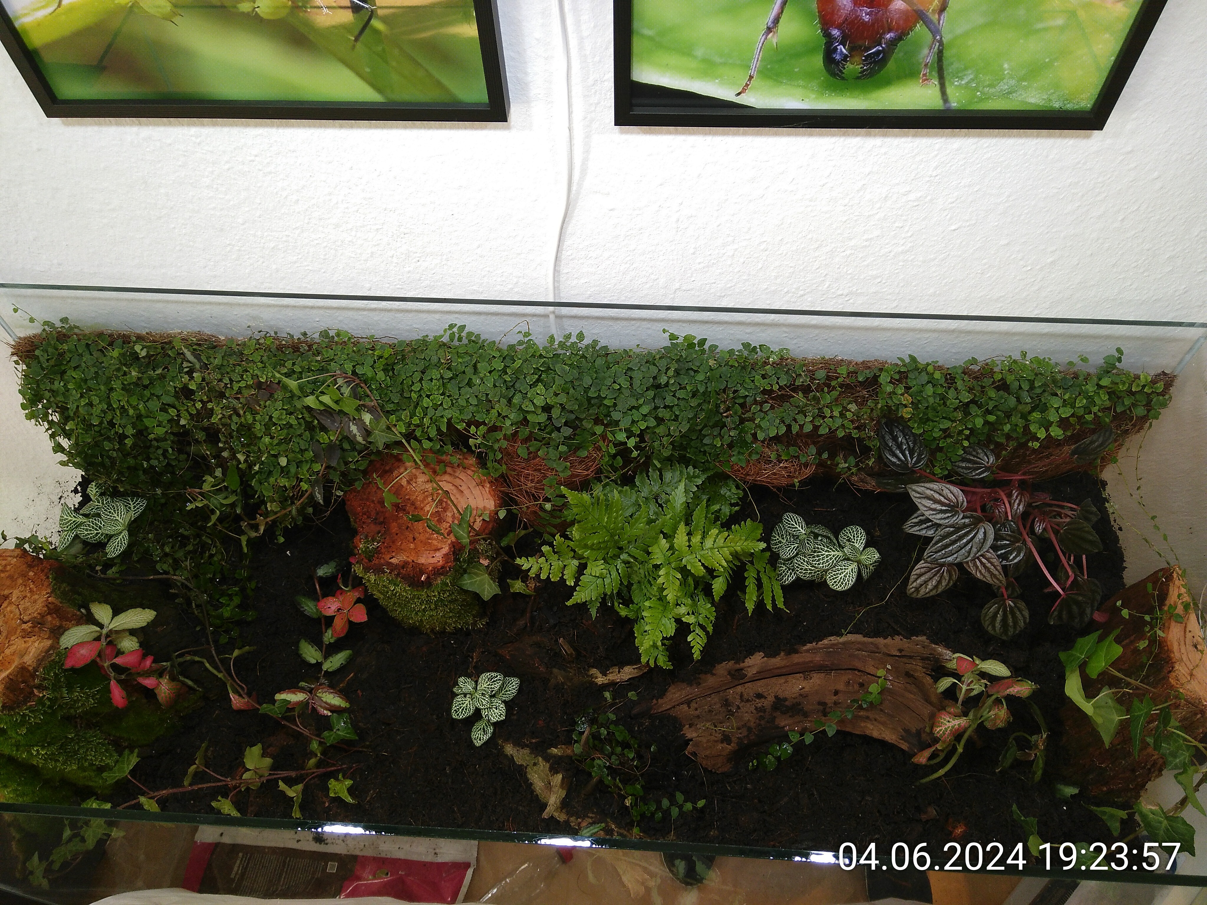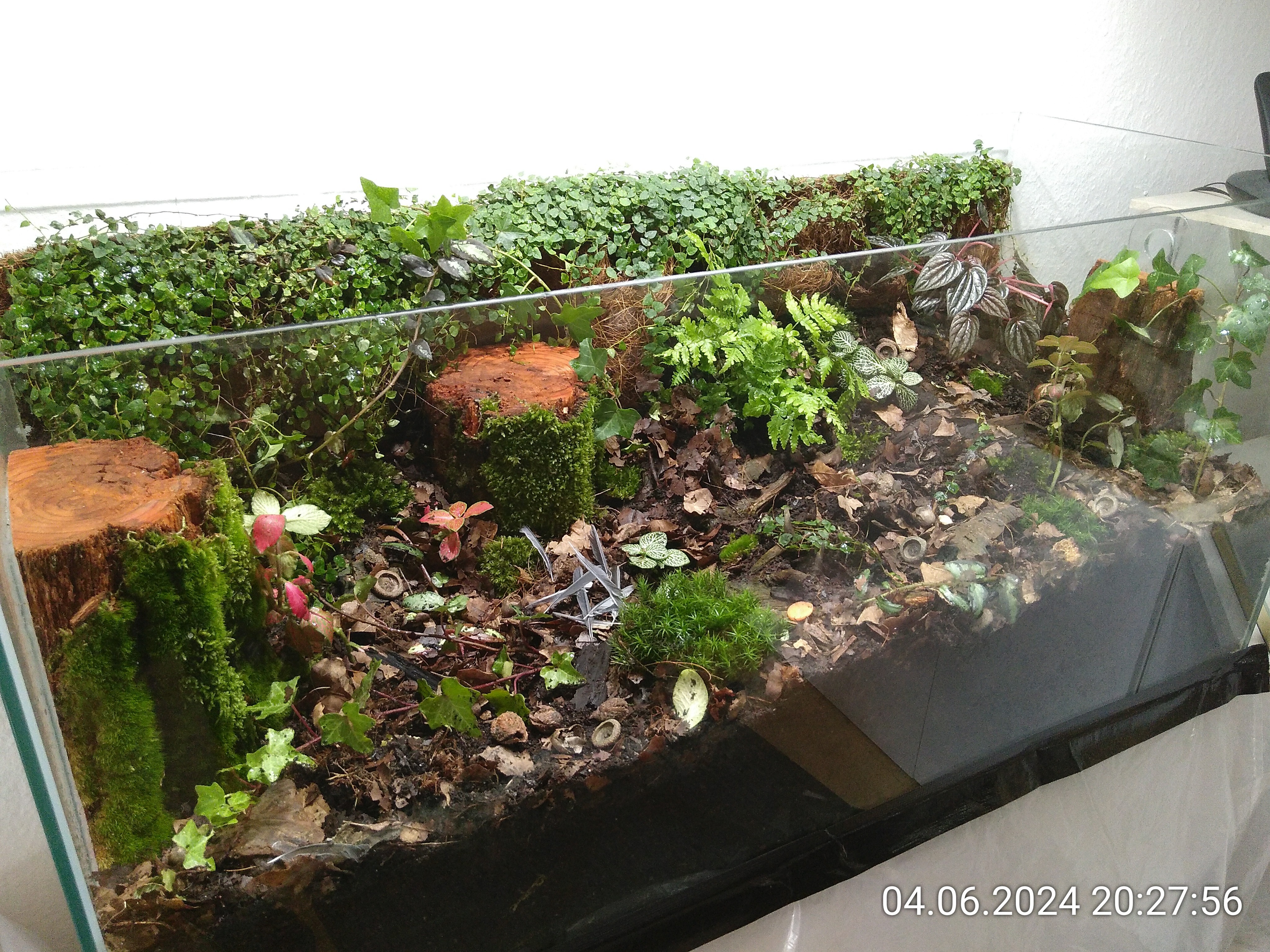 Nachdem ich die Besenstiele entfernt hatte, habe ich noch ein wenig Erde eingefüllt und dann die grobe Struktur mit ein paar Wurzelstücken vorgegeben. Auch wenn man davon später nicht viel sehen würde. Dadurch konnte ich aber leichter mehrere Ebenen im Becken schaffen und es sieht einfach natürlicher aus, auch wenn man nur ein kleines Stück davon sieht. Kleiner Tipp: Nach hinten immer ansteigend. Rechts liegt das Wurzelstück, das schon im Dschungel zum Einsatz kam. Von unten, da gibt einen Hohlraum, ist es mit Schnecken und Asseln geimpft. Es lag die letzten beiden Tage im Asselarium.