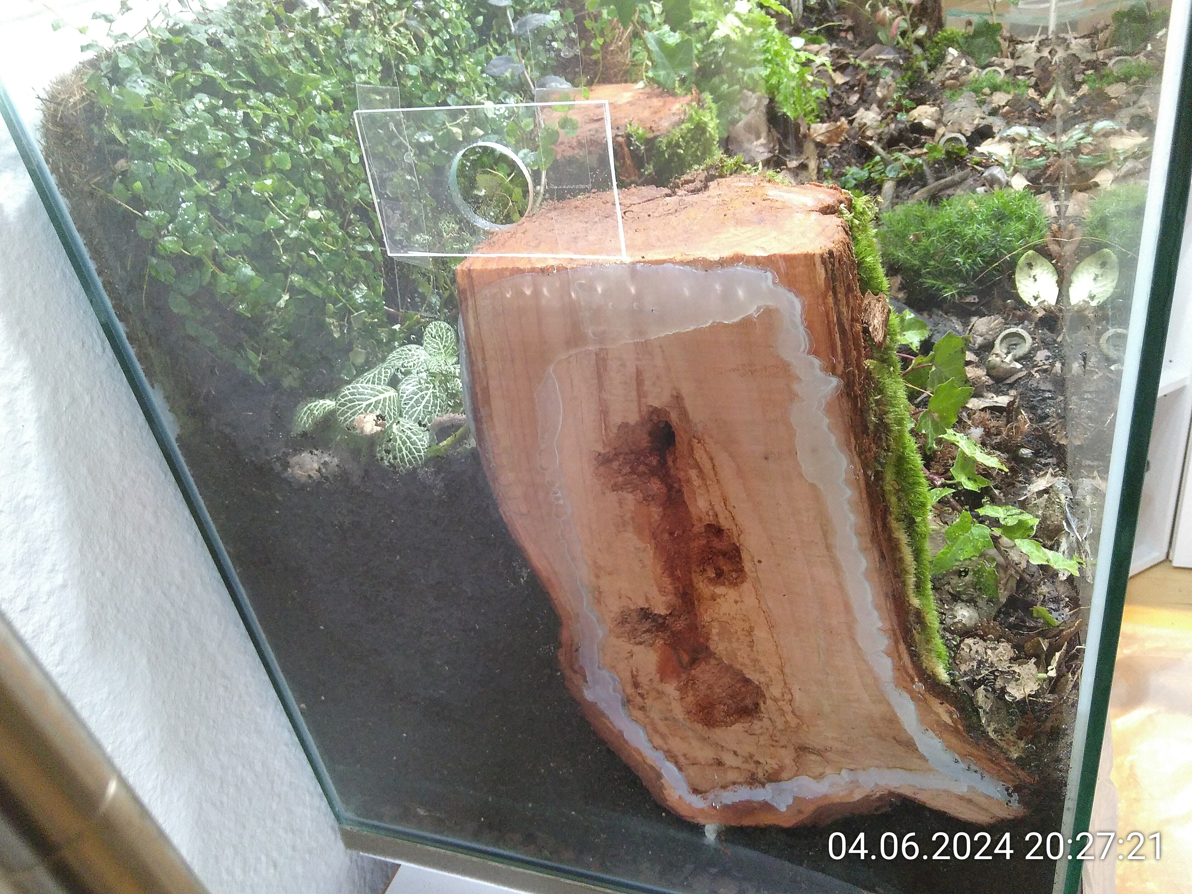 Dann kam der für mich kritischste und anspruchsvollste Job. Die beiden Wurzelhälften mussten per Silikon an die Seitenscheiben geklebt werden. Mit Steinen und zwei Besenstielen habe ich sie für 24 Stunden an ihrer Position fixiert. Das hat super geklappt. Die Schnitte waren zwar nicht ganz gerade (Handsäge), aber mit einer etwas dickeren Silikonschicht schließen die Nester dicht an der Scheibe ab.