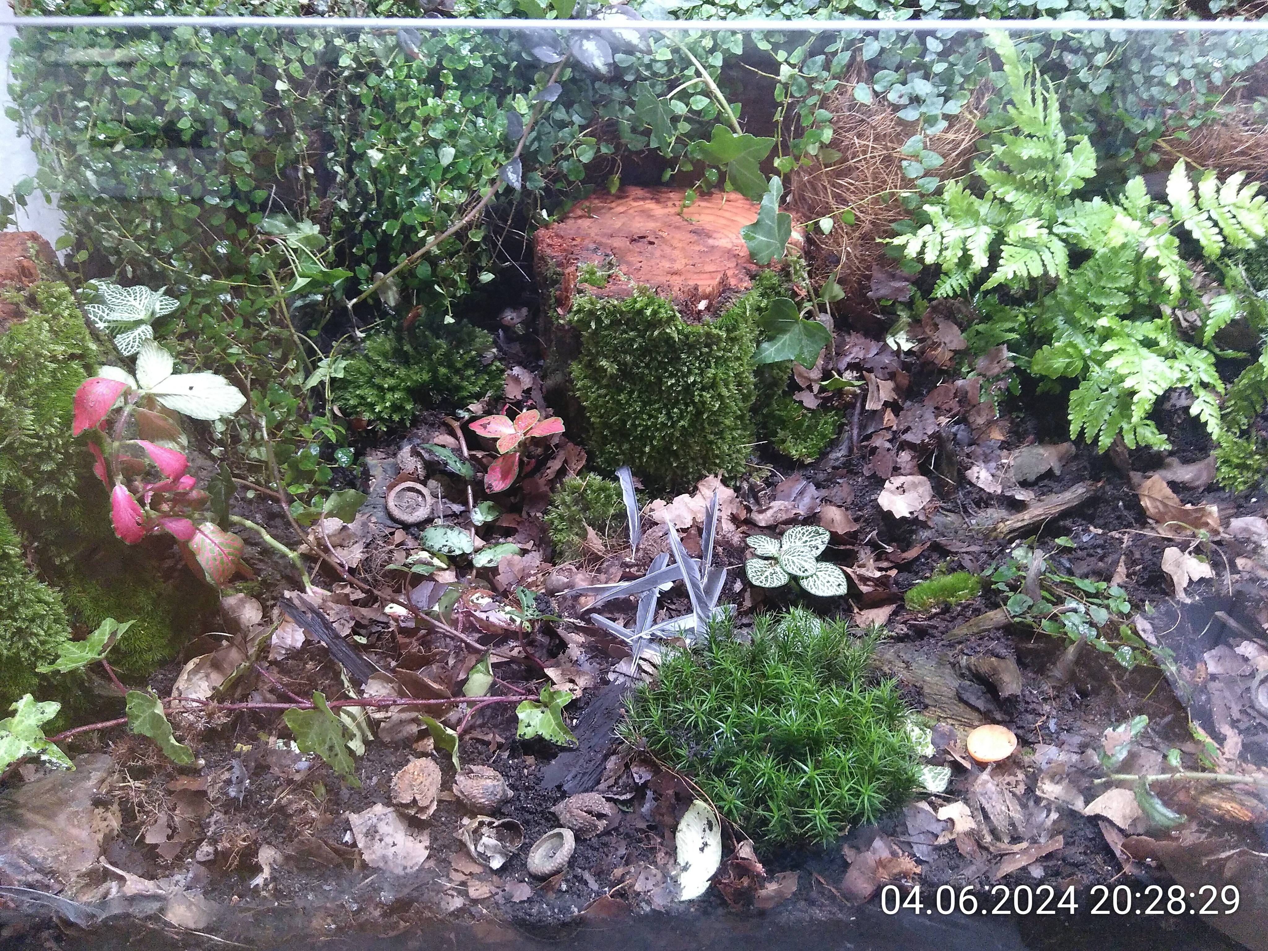 Wieder besser, aber da fehlt noch was. Und das war im Asselarium. Nämlich das komplette Asselarium, inklusive Asseln, Laub, Mossresten und unidentifierbarer Biomasse. Und ganz zum Schluss habe ich noch ein wenig Waldbodendeko verteilt. Da ich das Holz in einem Buchen-Eichenwald gefunden habe, gibt es Bucheckern und Eicheln. Und damit war das Bild perfekt. Genauso hatte ich mir das vorgestellt. Wenn das nicht nach einem natürlichen Waldboden aussieht