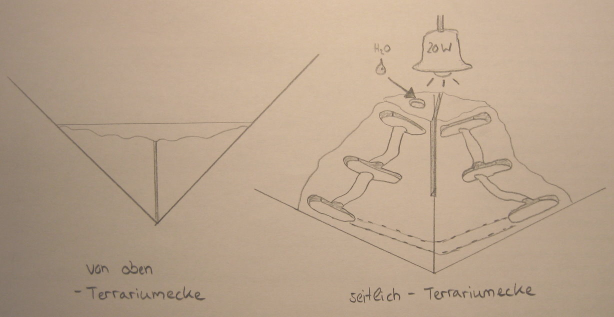 Ein weiterer wichtiger Punkt sind die jeweils beiden oben liegenden Kammern mit einer dünnen Ytongdecke von bis zu 5 mm. Die linke wird befeuchtet, die rechte trocken gehalten, beide aber mit einer Lampe erwärmt, bzw., da die Lampe flexibel ist (und ich auch), kann man sie auch mehr auf die trockene richten.