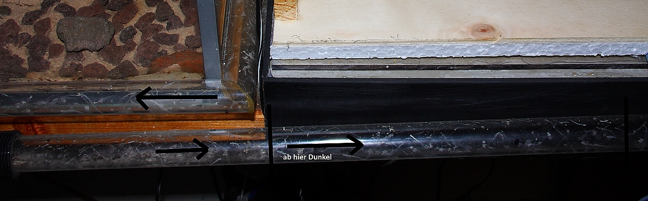 Das letzte Drittel der Parallelröhre verlÀuft vor dem Nest, wo dass Lampenlicht nicht mehr hin scheint.