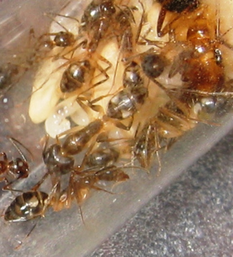 Auch waren 3 Arbeiterinnen am Eigelb und haben mal etwas probiert und scheinen jetzt auch mit den Larven beschäftigt zu sein.