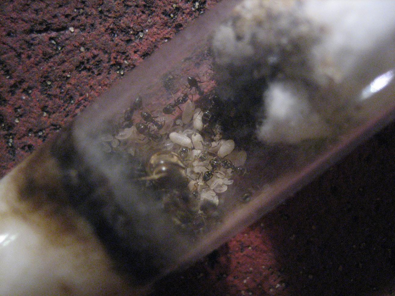 Man erkennt wie unscharf die Königin und Watte sind. Hätte ich nicht manuell nachgeholfen, wären die Larven (Objekt meiner Begierde) nur kleine weiße Punkte :)