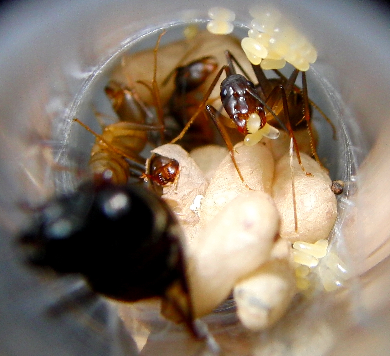 Hier auf dem Foto sieht man eine halb ausgepackte Camponotus, ich habe gestört, also hörten sie erst mal auf. Das in diesem Fall noch ungeschlüpfte Tier würde in der