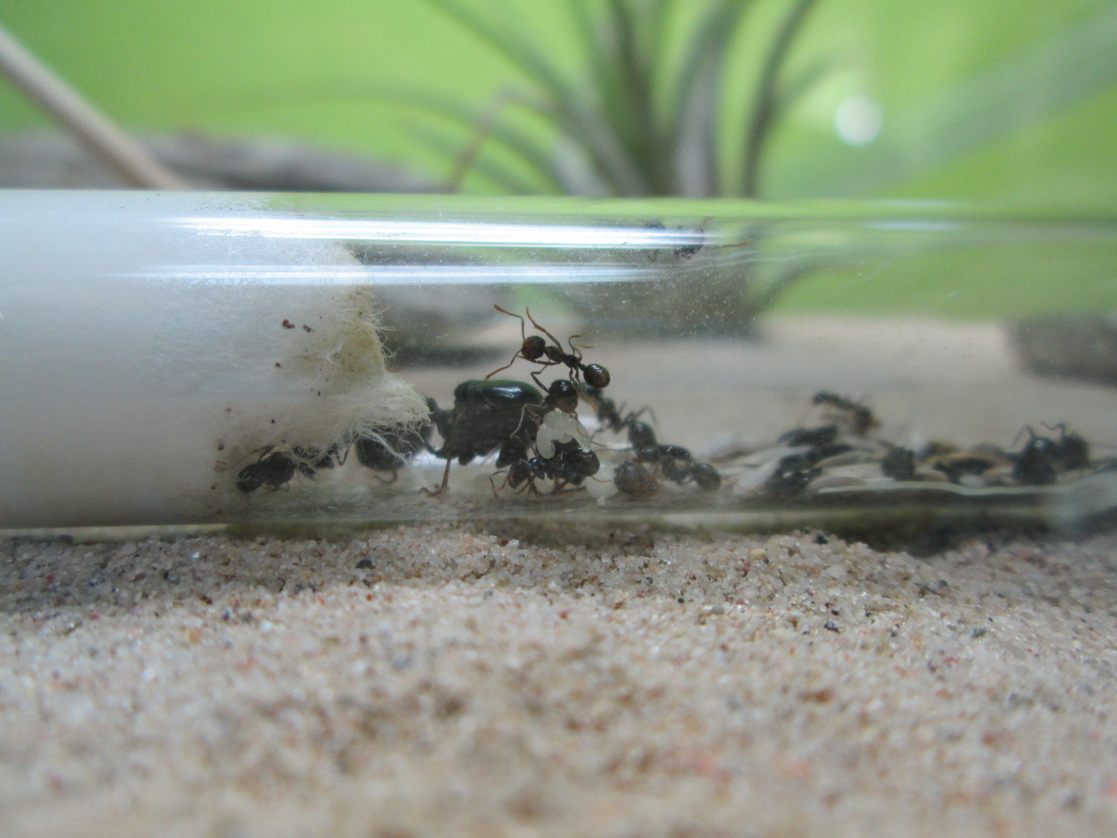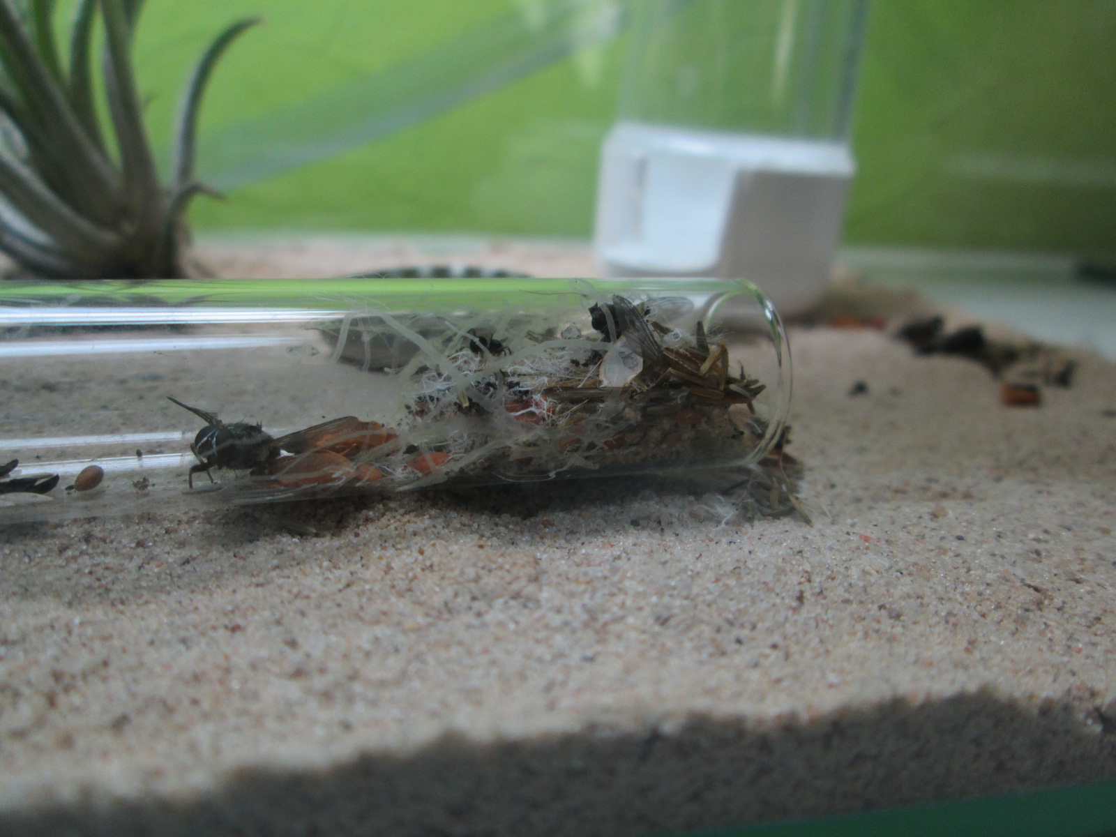 Hab gerade noch ein neues Eierpaket entdeckt :) Die Fressen derart viel, hätte ich nicht gedacht. Hab gestern meinen ausgeblüten Schnittlauch geerntet. Es scheint so als würden die da voll drauf abfahren, den Samen haben sie aus einem Gemisch welches ich im Garten gesammelt hab rausgepickt und alles ins Reagenzglas getragen. Diesen diesmal nicht auf dem Müllplatz zwischengelagert. Zwei Fliegen hab ich noch angeboten, wurden sofort geholt und zwischengelagert. Hier noch zwei Bilder von gerade eben.. Einmal das neue Eierpaket und einmal der Müllplatz/Zwischenlager
