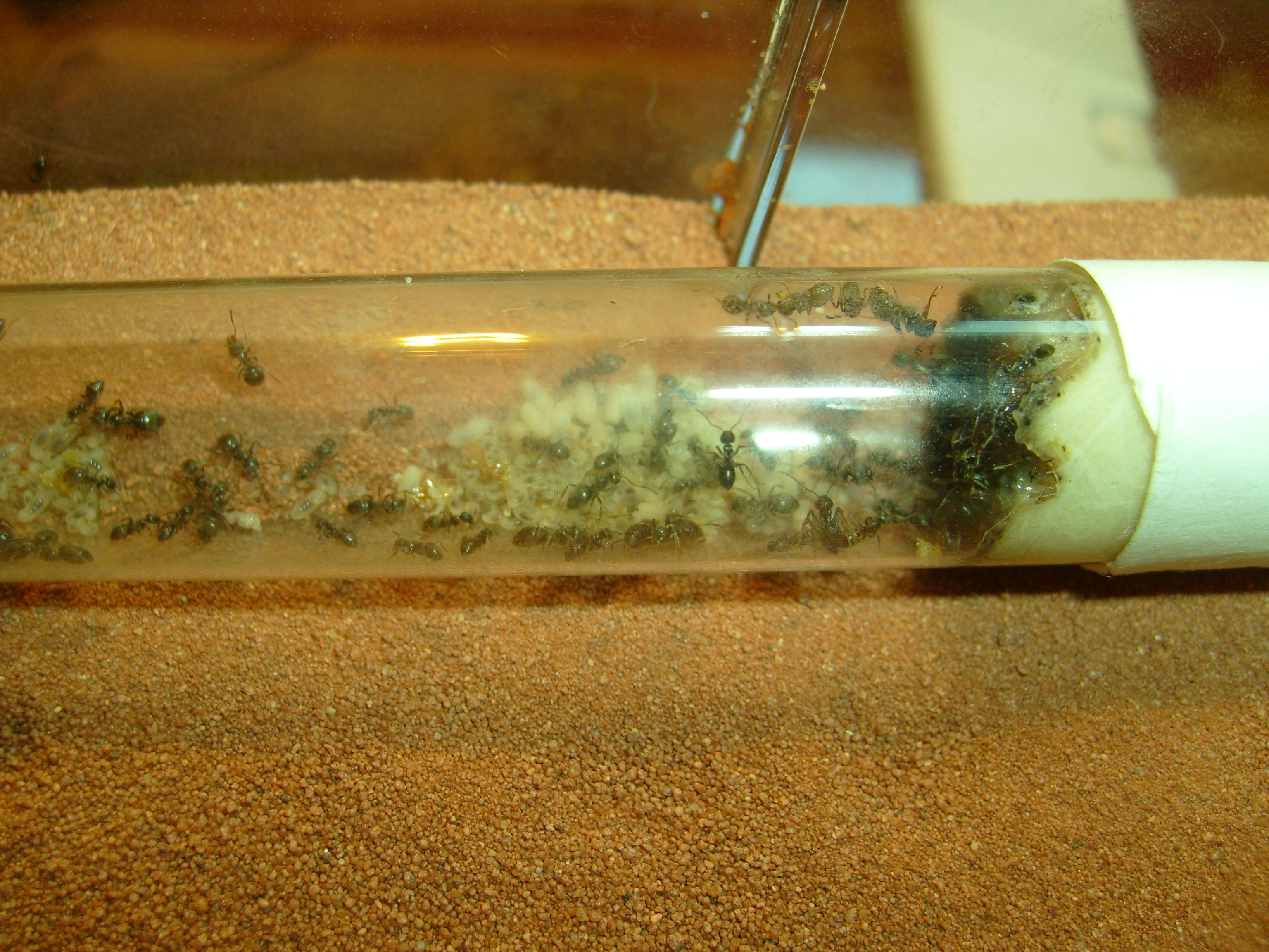 Die Kolonie war glaube ich etwa in der HĂ€lfte ihres ersten Jahres nach der GrĂŒndung(und hatte auffĂ€llig viele PygmĂ€en vor der Winterruhe ). Man sieht auch viele Arbeiterinnen und Brut nicht, weil noch viele rechts im Reagenzglas bei den Puppen und dem Wassertank, die auch nicht mit drauf sind, waren. Nach links ging das Reagenzglas auch noch ein kleines StĂŒck. Das war mir aber damals auch aufgefallen. Ich hatte zwei etwa gleich groĂe und alte Kolonien. Bei der anderen Kolonie sind nicht so groĂe Arbeiterinnen aufgetreten. Ich habe leider nicht wirklich ein Bild wo man einen Eindruck ĂŒber die gesamte Kolonie erhĂ€lt.
