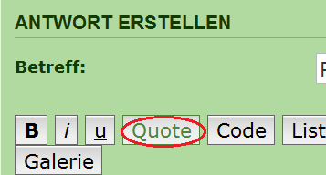 Es erscheint jetzt ein neuer Beitrag, mit dem ganzem zitiertem Text, wiederum mit öffnendem Befehl und einem schließendem Befehl am Anfang und Ende. Bitte nur die gewĂŒnschte Stelle die zitiert werden soll, stehen lassen, alles anderes bitte Löschen.