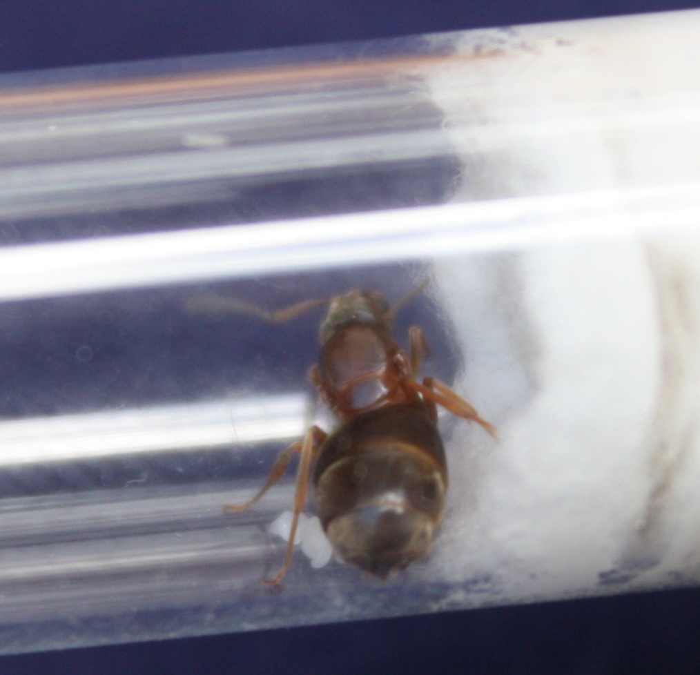 jetzt hat die feine Dame auch schon einige Arbeiterinnen, deren Farbe Schwarz ist und kleiner sind als Lasius niger, ich schätz sie auf nicht mehr als 3mm! Hab allerdings noch nicht genau nachgemessen.