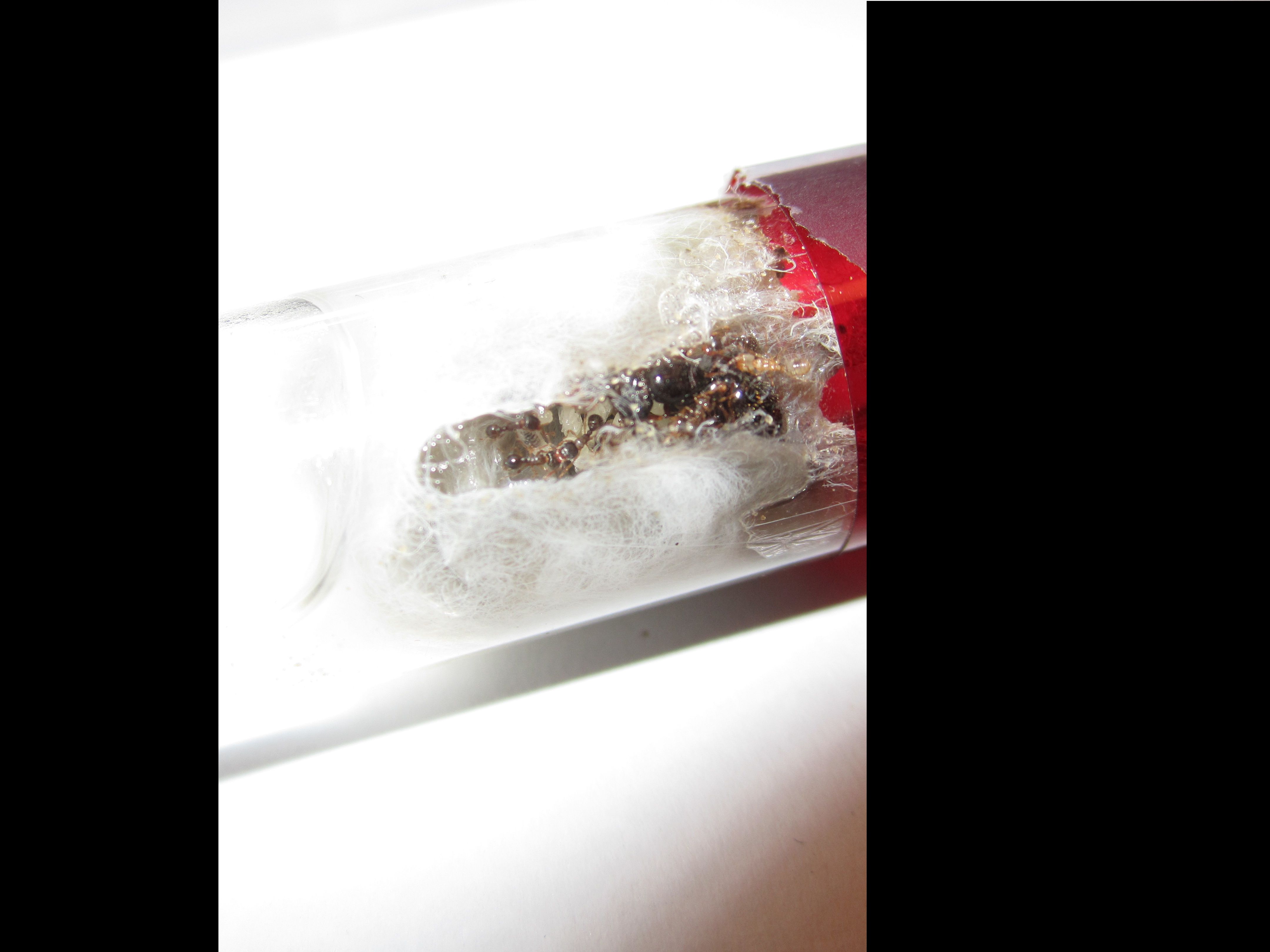Auf dem 2. Bild sieht man wie sich die Kolonie in die Watte gefressen hat,bis fast durch zum Wasser. Ist das normal, hab das noch bei keiner andren Art beobachtet.