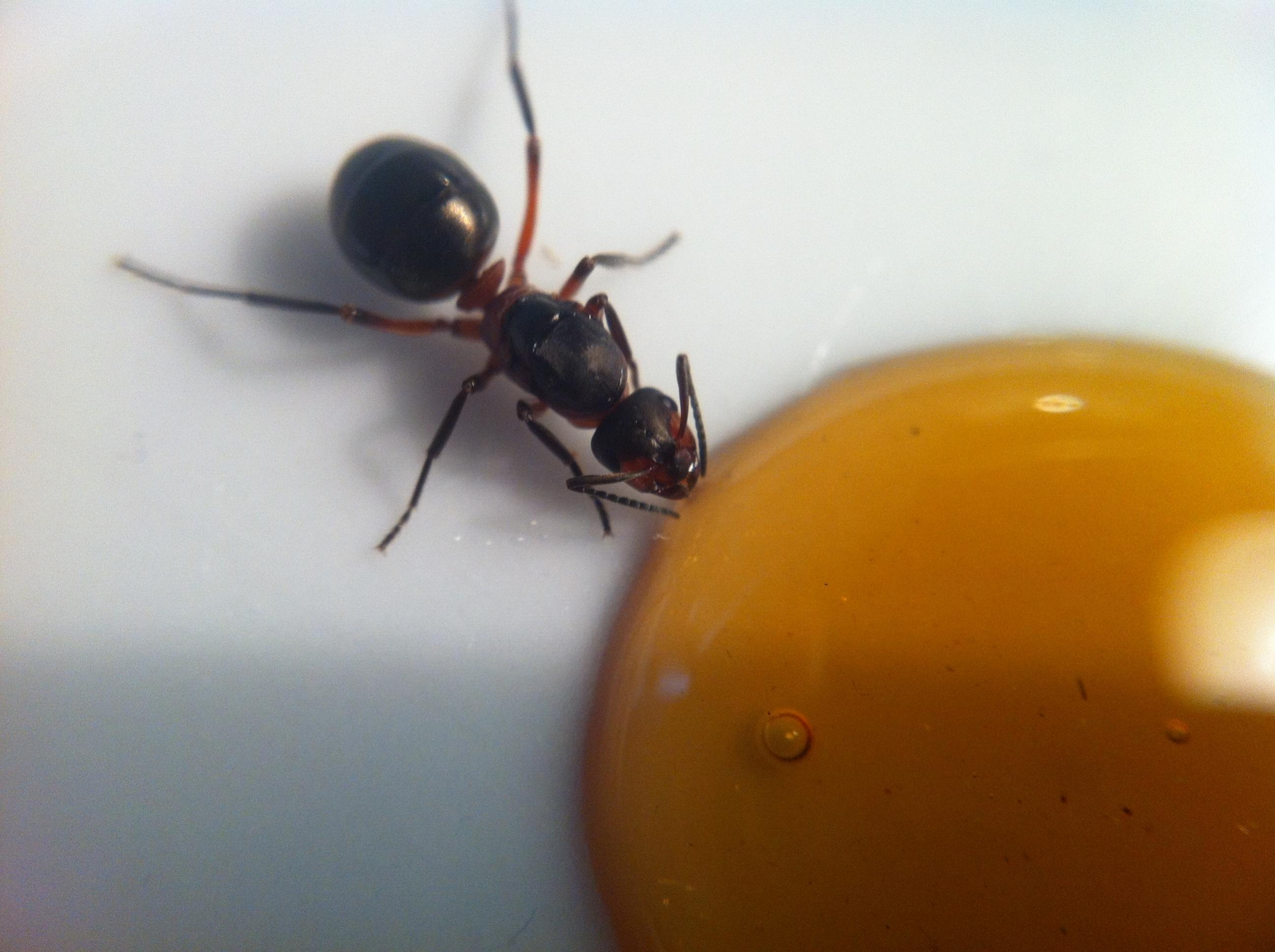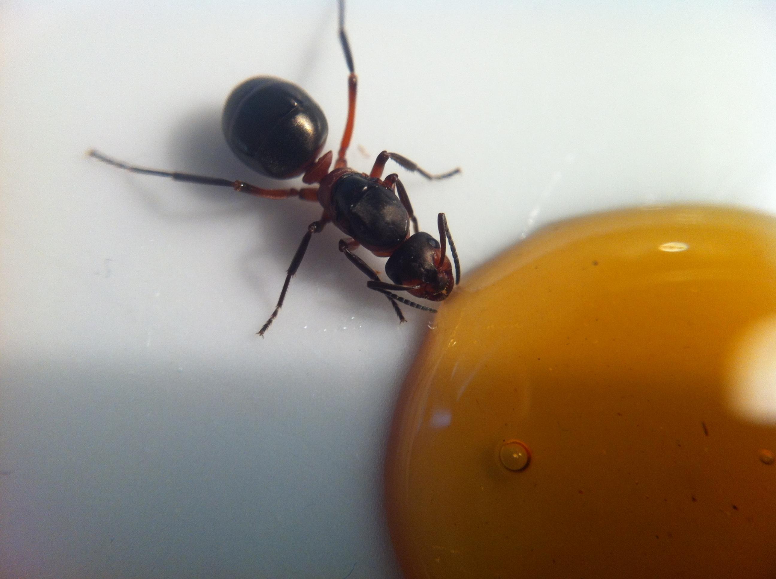 auf dem RĂŒckweg fanden wir auf dem Weg eine einzelne Ameise, ich nehme an das es sich um eine Formica sp. handelt, sie wurde fĂŒr eine kurze Fotosession mit nem Tropfen Waldhonig vom Butterbrot ruhiggestellt, sodass ich in ruhe ein paar Fotos machen konnte.