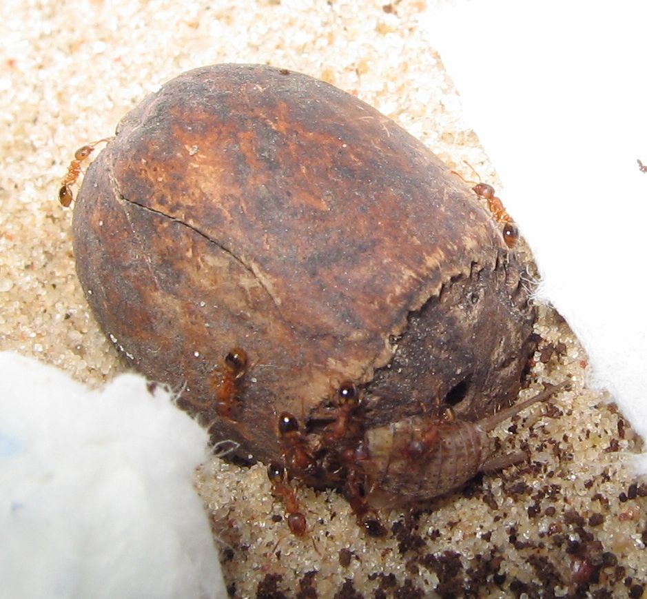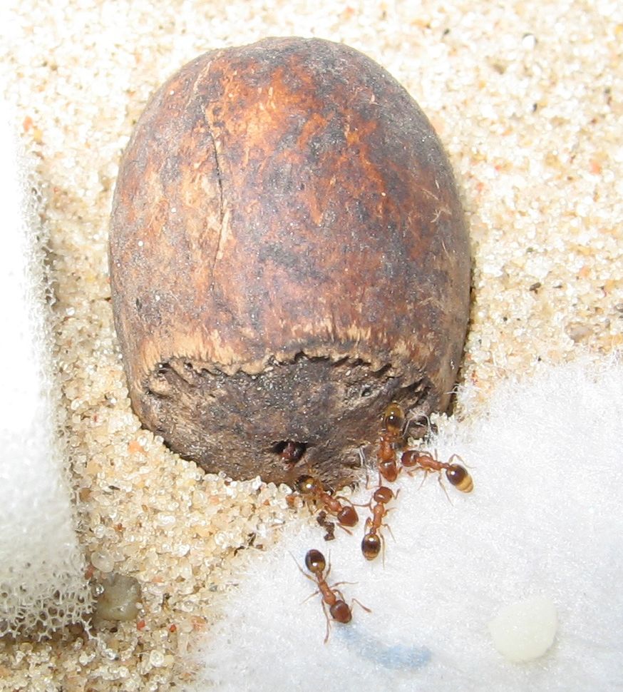 Eine Eichel mit Loch habe ich mitgenommen, da in der nĂ€he eine sehr kleine Ameise herumgelaufen ist. Ich ging also davon aus, dass in der Eichel eine Temnothorax Kolonie wohnt und habe diese mitgenommen. Zuhause angekommen kamen aber plötzlich ganz andere Ameisen als erwartet aus der Eichel, also werde ich diese morgen zurĂŒckbringen.