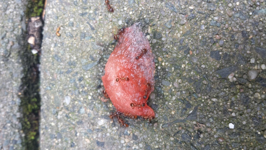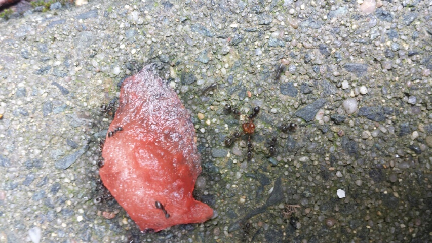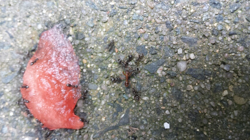 Dabei habe ich mir die Umgebung genauer angesehen und (ich sag es mal so salopp) schwarze und orange-braune Ameisen gesehen. Mehrere Arbeiterinnen von beiden versuchten die Melone zu erobern, es gelang dann den schwarzen, ich tippe bei diesen auf lasius niger. In unmittelbarer NĂ€he konnte ich einen Eingang finden wo eben diese rein gingen bzw raus kamen, davor ein Friedhof von Ameisen. Hinterleiber beider Arten ĂŒberall verstreut.