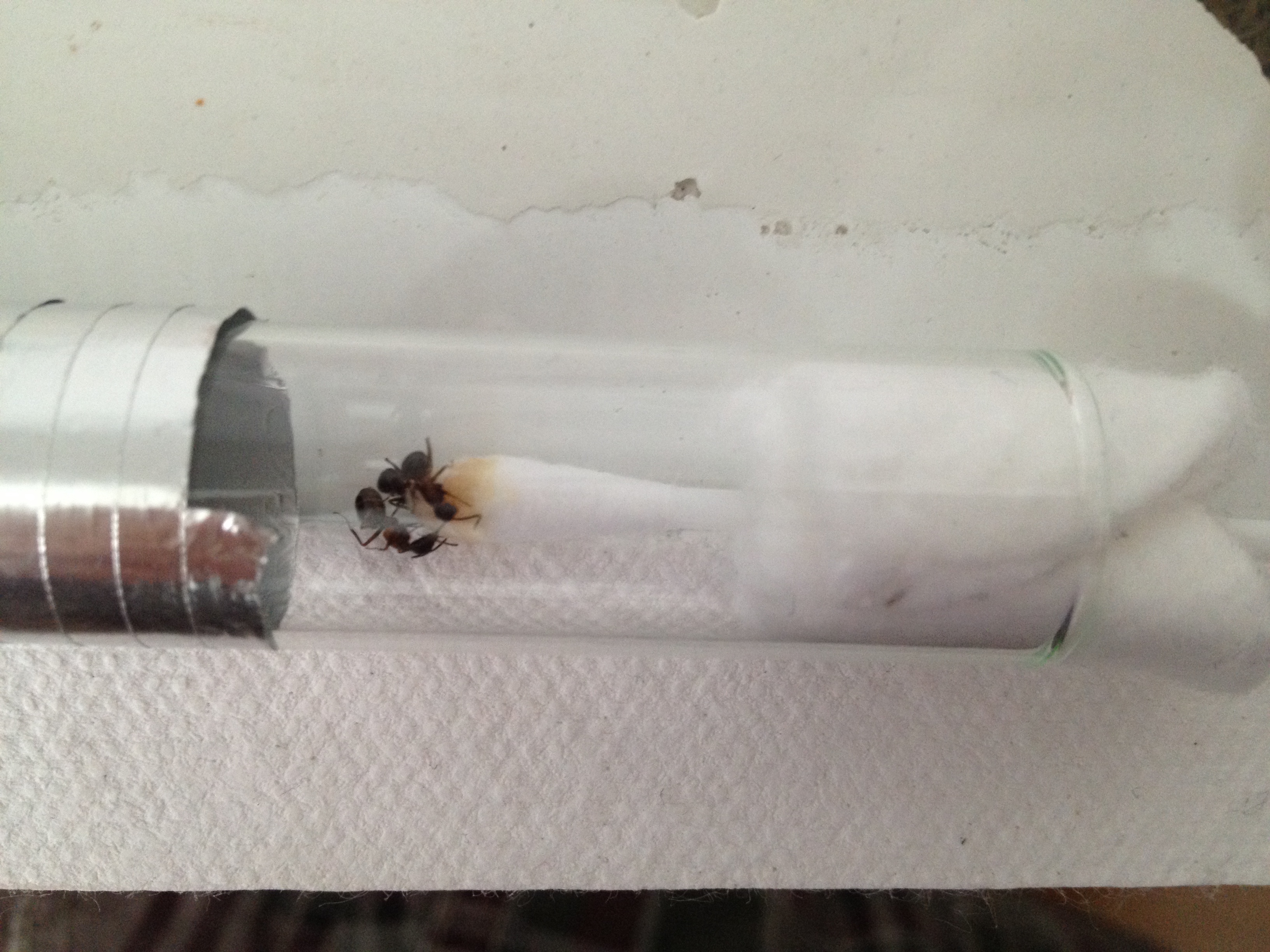 Die Königin ist alleine rübergelaufen. Der Umzug fand nach einem Tag statt, erst nachdem ich das neue Reagenzglas mit Alufolie umwickelt habe. Zuvor war das Reagenzglas mit roter Folie umwickelt. Ob es allein an der Alufolie lag, dass die kleinen umgezogen sind, oder an der Erschütterung, die ich nebenbei verursacht habe, kann ich allerdings nicht sagen.