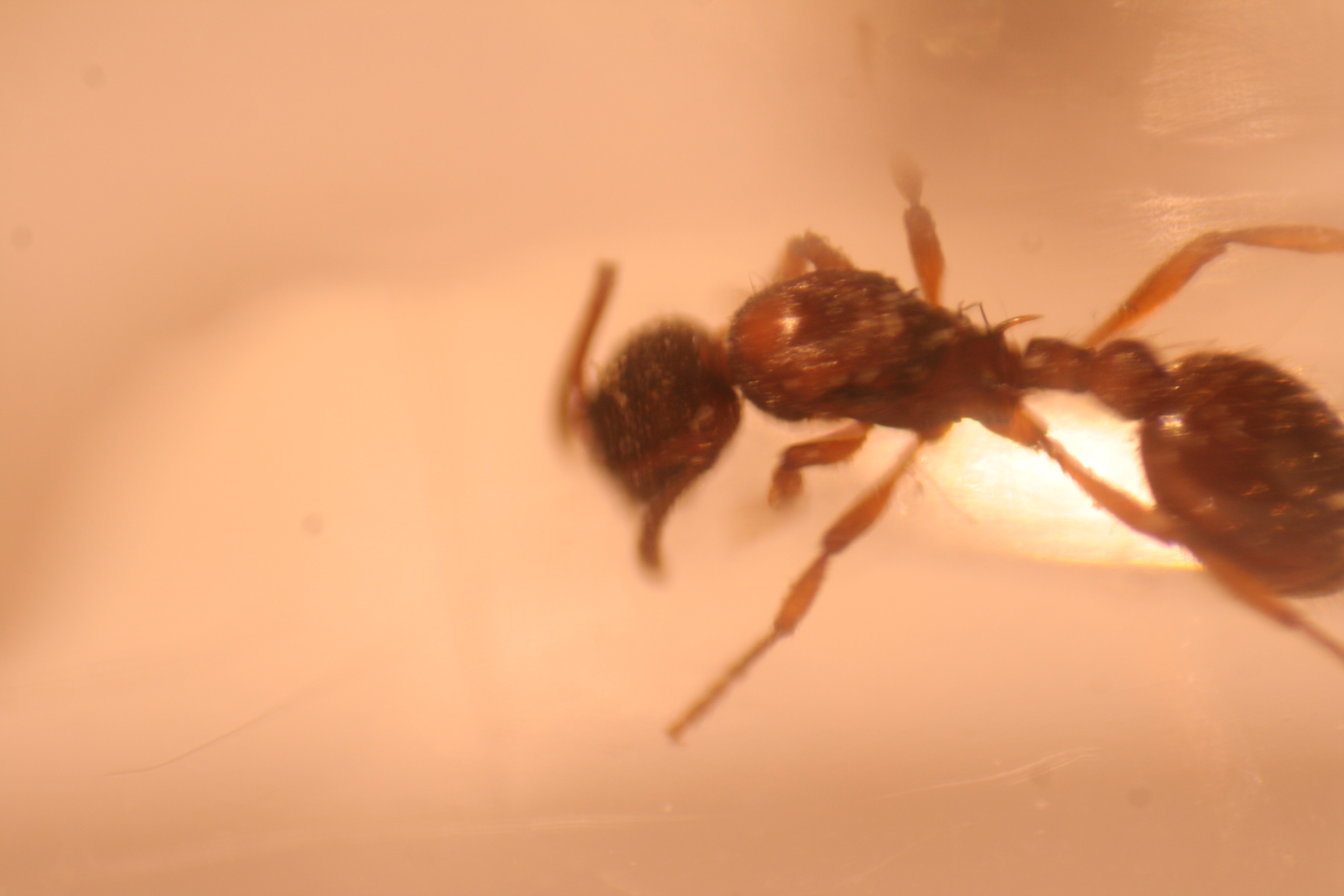Ich tippe auf Myrmica rubra. Größe aussehen und Habitat scheinen laut dem Ameisenwiki ja zu passen.