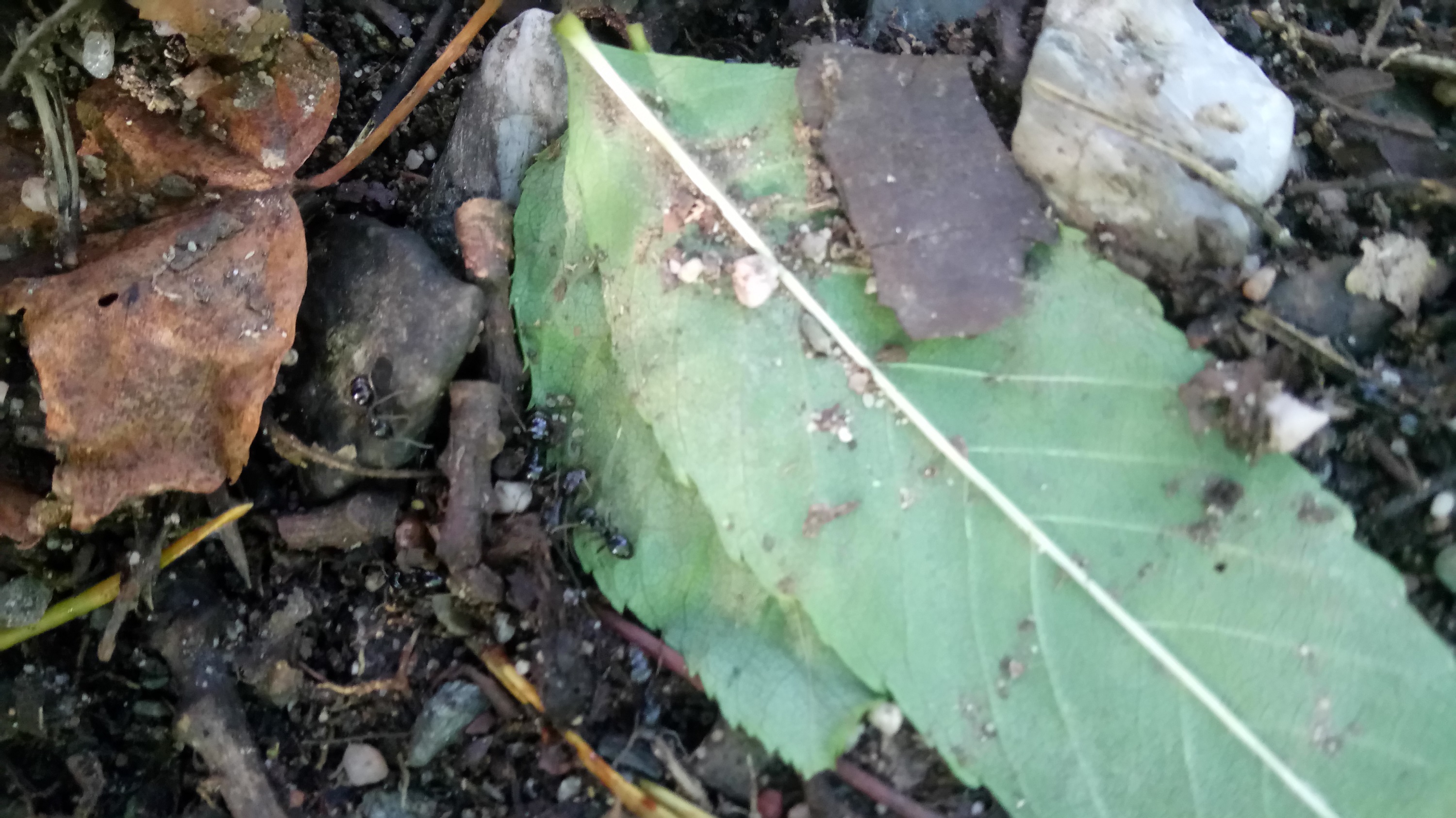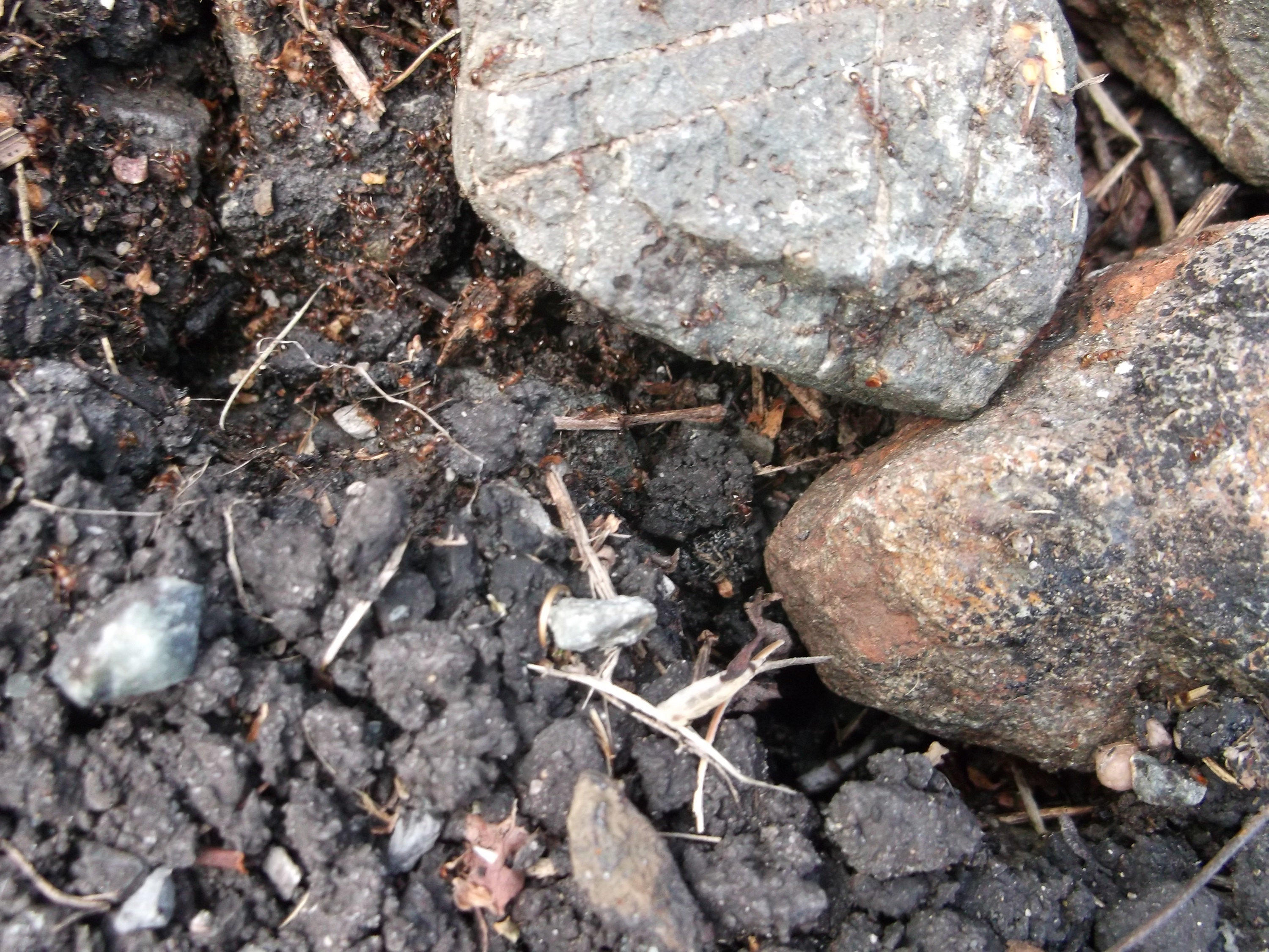 Zu dieser Kolonie kann ich noch sagen, dass ich an einer Stelle mit etwas Einblick in das Nest hatte und Geschlechtstiere sehen konnte. Die Jungköniginnen waren ungefĂ€hr einen Zentimeter groĂ (ich tendiere zu etwas kleiner) und die MĂ€nnchen kaum gröĂer als die Arbeiterinnen, beide Geschlechtstiere waren sehr dunkel (ich wĂŒrde meinen schwarz, aber es war schlecht beleuchtet).