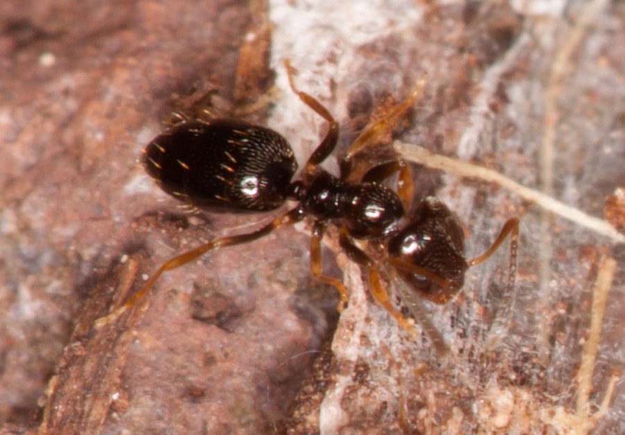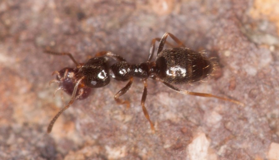gestern fand ich mehrere, einzelne, wieder winzig kleine Ameisen an einem felsigen Trockenhang. Sie waren leider sehr schnell unterwegs, so daß es mit dem Foto eher eine Sache des Glücks war. Ich würde das für Plagiolepis halten wollen. Aufgrund der im Seifert erwähnten Verbreitung käme wohl nur Plagiolepis vindobonensis in Frage, aber eine Artbestimmung erwarte ich natürlich nicht. Die