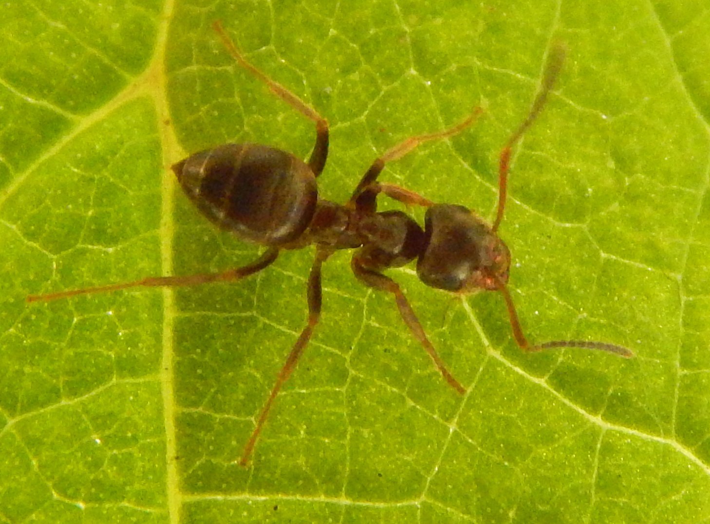 Es ist ein wenig schwer zu erkennen aufgrund der Ausleuchtung, aber das Mittelsegment scheint definitiv eine andere Farbe zu haben als der Rest des Körpers, damit fiele Lasius niger (schwarze Wegameise) raus. Wahrscheinlich handelt es sich um Lasius brunneus (wenn das Mittelsegment bräunlich ist) oder Lasius emarginatus (wenn das Mittelsegment eher rötlich ist) oder eine von deren nahverwandten Arten.
