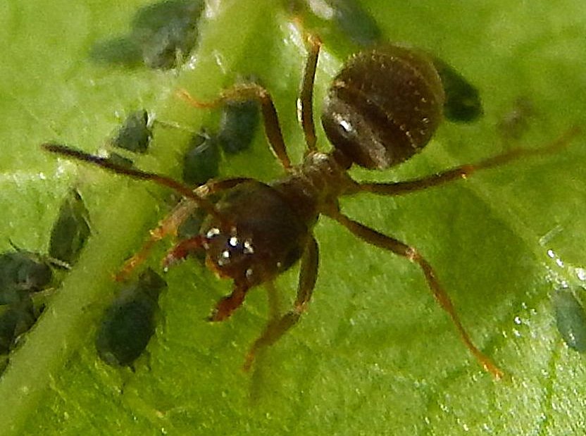 Auf meiner Terrasse 66450 Höchen, direkt am Wald - im Pflanztopf mit Brennessseln sind seit ein paar Wochen einige Ameisen unterwegs... zwischen 5 und 7 mm in etwa, teils sind auch die Blätter zusammen geklebt, allerdings nicht wie im letzten Jahr durch Raupen. Sie kümmern sich um ihre Blattläuse, die meist an den oberen Bereichen sitzen. Könnten es schwarze Wegameisen sein?