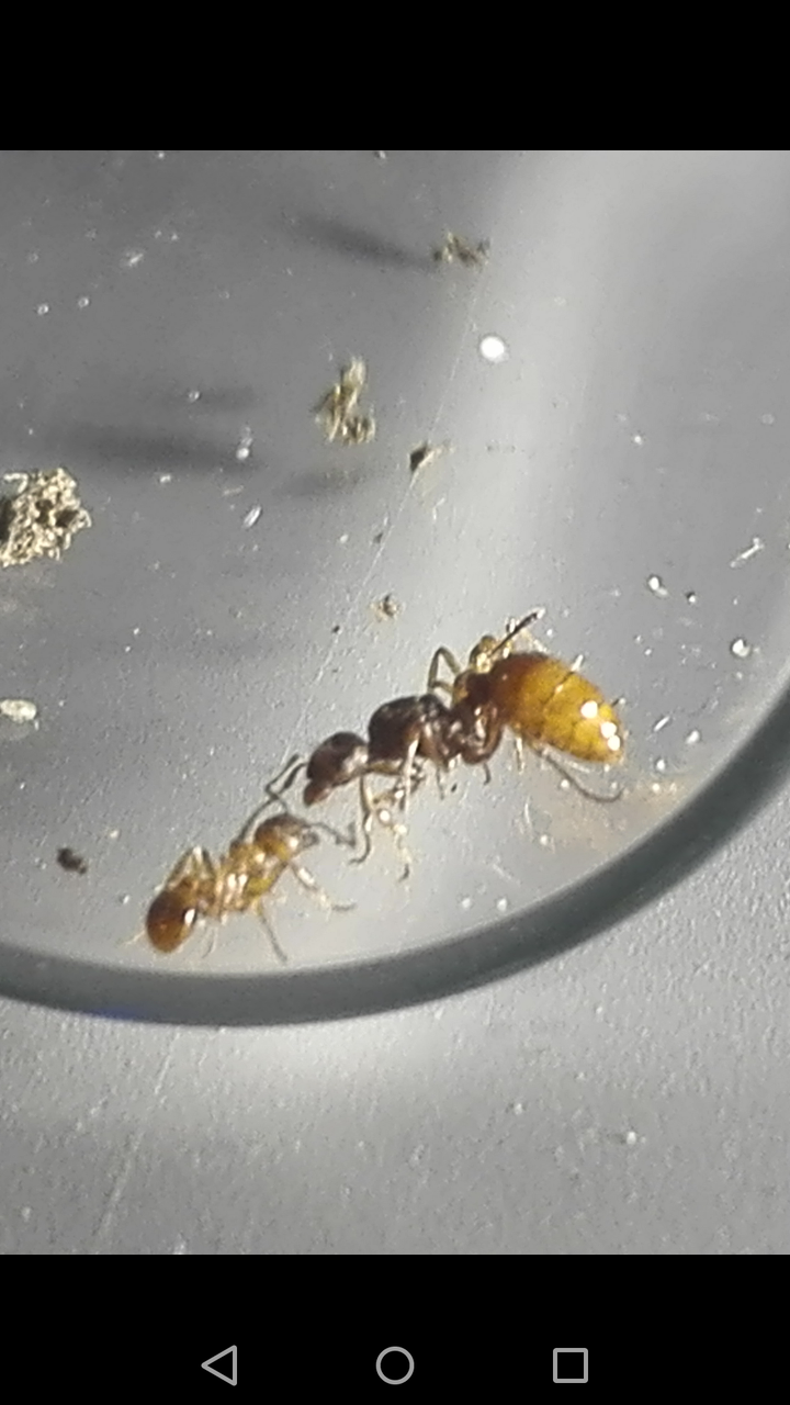 hab heute eine Entdeckung im Garten gemacht...hab die Ameisen hier unter einem Stück Totholz gefunden. Sind gerade mal ein paar mm groß. Ich glaube/hoffe, dass die größere Ameise eine