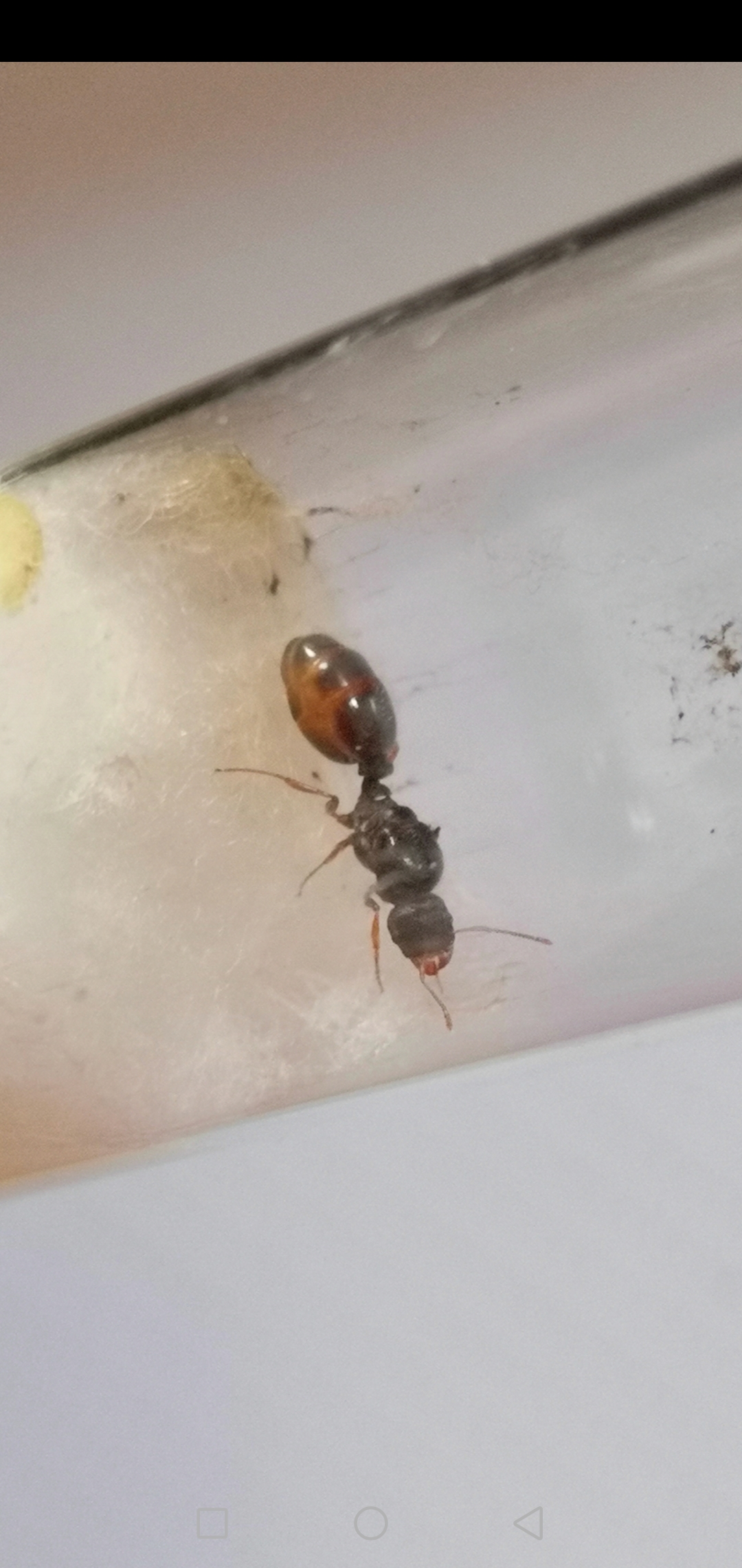 Ich nehme an, es ist eine Art Knotenameise, die vermutlich nicht claustral gründet, nach einem ganzen Monat im Glas hab ich noch kein Ei gefunden. Interessanterweise lebt sie aber noch, obwohl sie keine Nahrung erhalten hat. Ich glaube, ich werde sie demnächst frei lassen und hoffe, dass sie noch überleben kann und ev. in eine passende bestehende Kolonie einwandern kann, die Chancen dafür stehen vermutlich aber nicht gut...