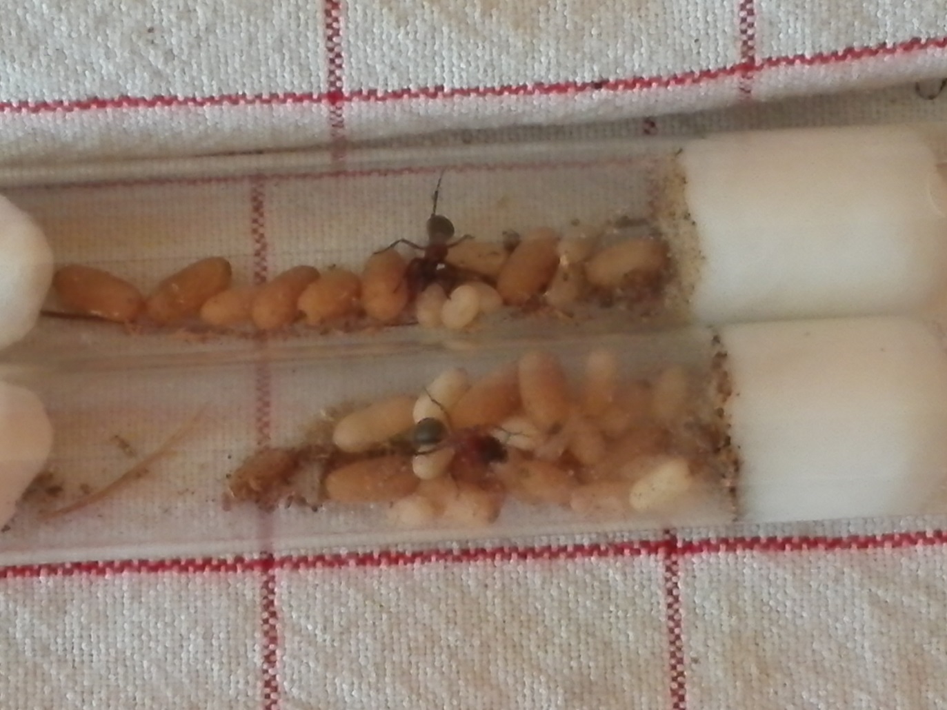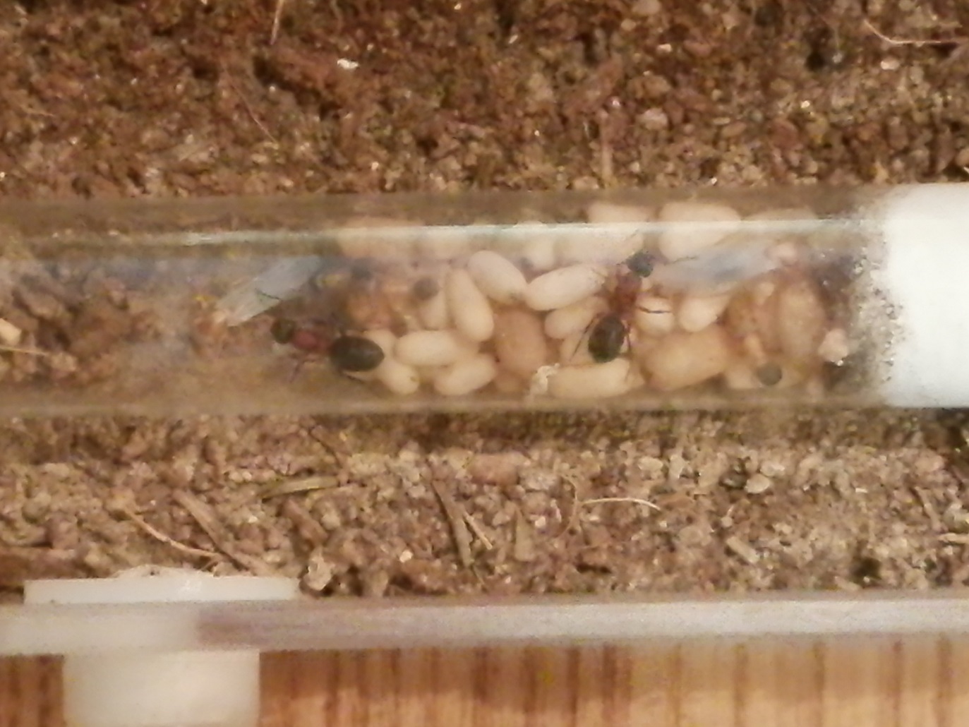 Ich habe die Gynen getrennt und jede sitzt in einem geschlossenen RG auf ihrem eigenen Bruthaufen. In 24 Stunden, wenn sie sich beruhigt haben, werde ich die RGs in getrennte Becken geben und die Stopfen zur semiclaustralen GrĂŒndung öffnen.