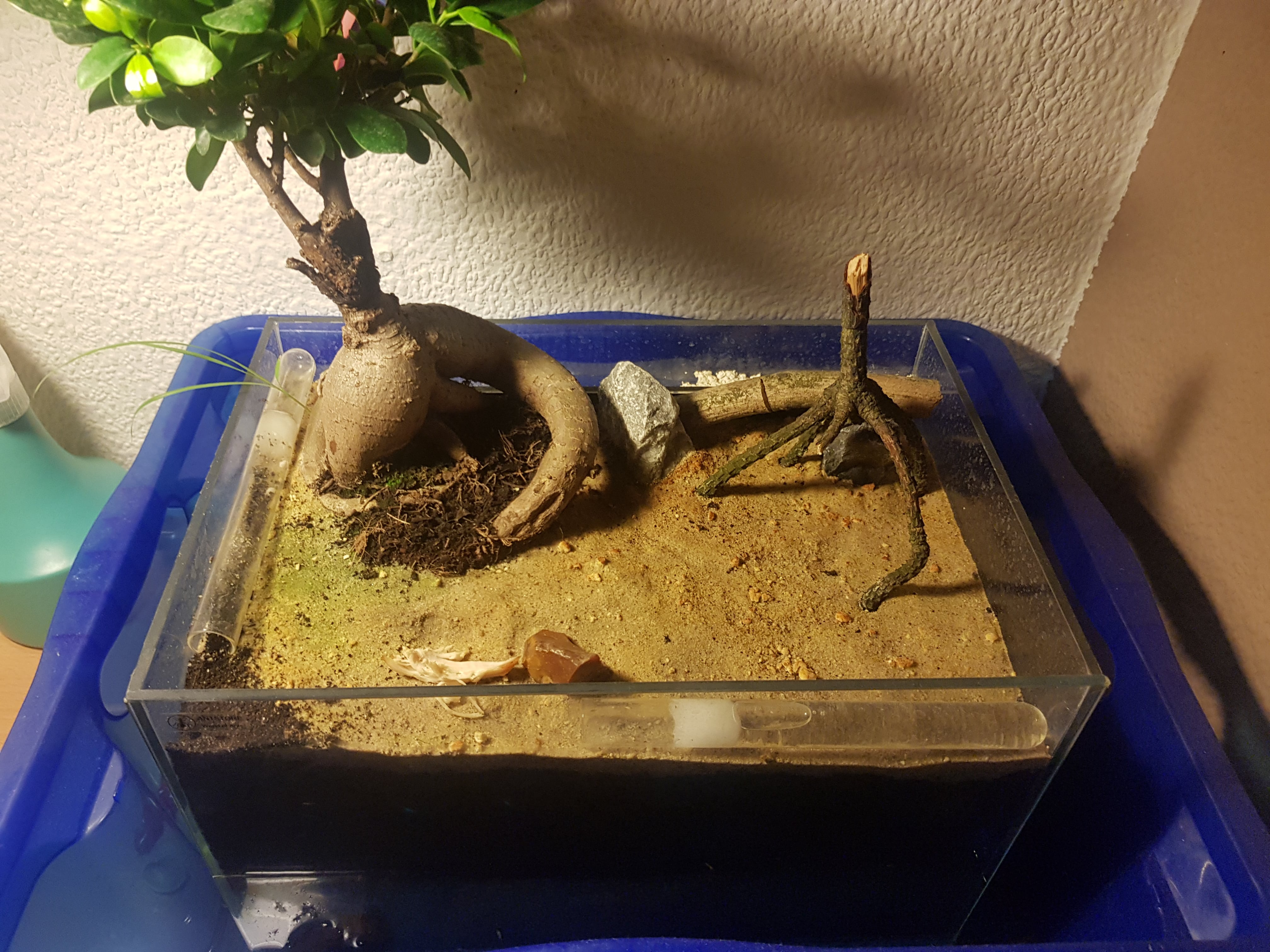 Ziemlich zügig habe ich meiner ersten Kolonie, der Lasius niger, etwas gutes tun wollen und habe ihnen eine freiwillige Möglichkeit gegeben, in ein mit Erde gefülltes Formicarium zu ziehen (Reagenzglas bedeckt mit Erde in das Formicarium gelegt und ihnen die Wahl gelassen). Zur Ausbruchssicherung habe ich einen Wassergraben
