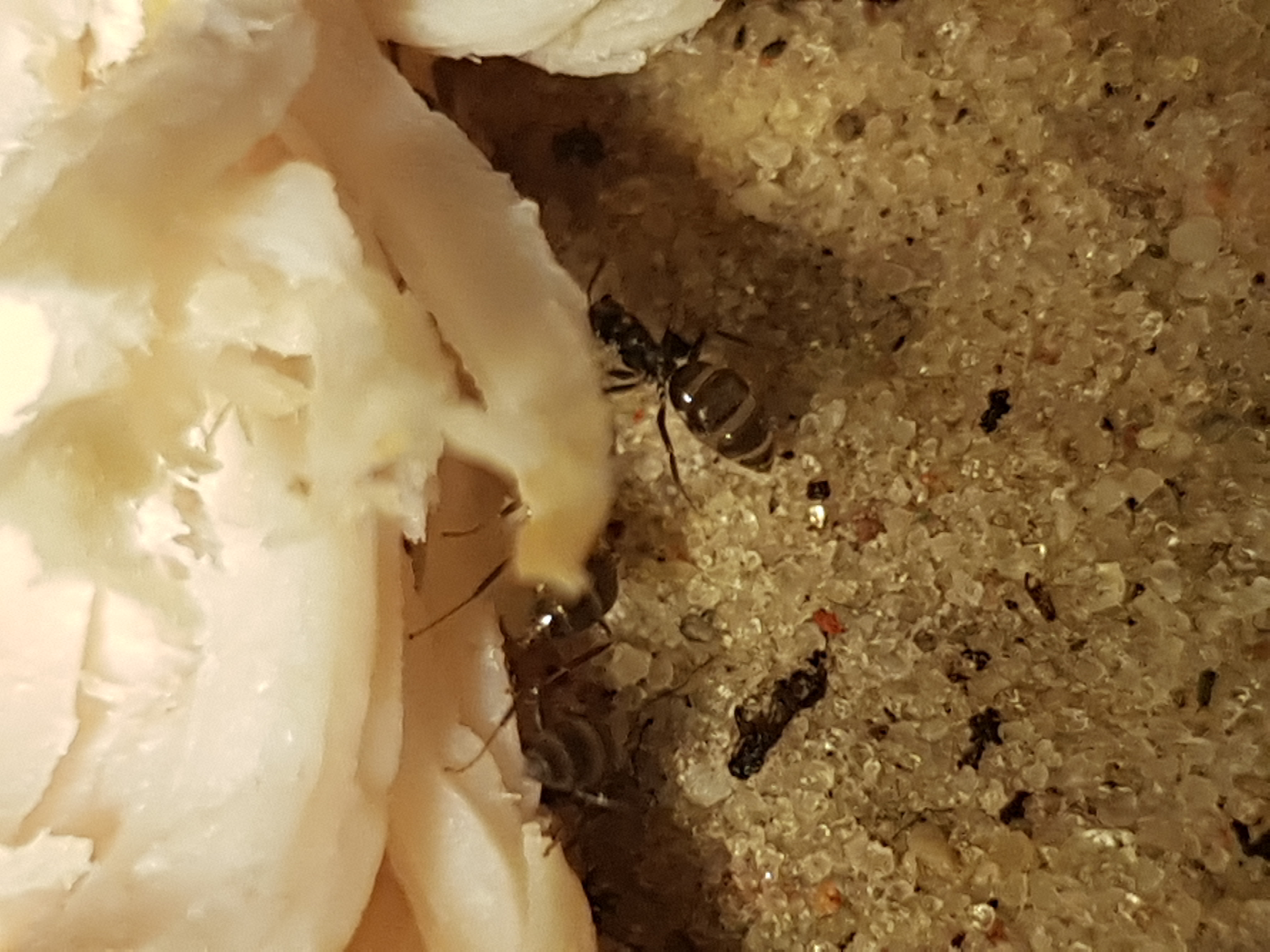 Beobachten konnte ich auch, dass sie von meinen Lasius niger geputzt wurden während sie selbst am Fleisch zugange waren. Fing eine lasius niger Arbeiterin an ebenfalls am Fleisch zu arbeiten, wurde sie direkt von den anderen vertrieben. Komisch finde ich zudem, dass NUR die Ameisen mit den größeren Gastern am Fleisch sind während die anderen brav Erdstücke aus ihrem Loch holen. Erde tragen habe ich von denen noch nicht eine einzige gesehen. Die Stücke Fleisch, die sie abtrennen, werden aber in dasselbe Loch gebracht.