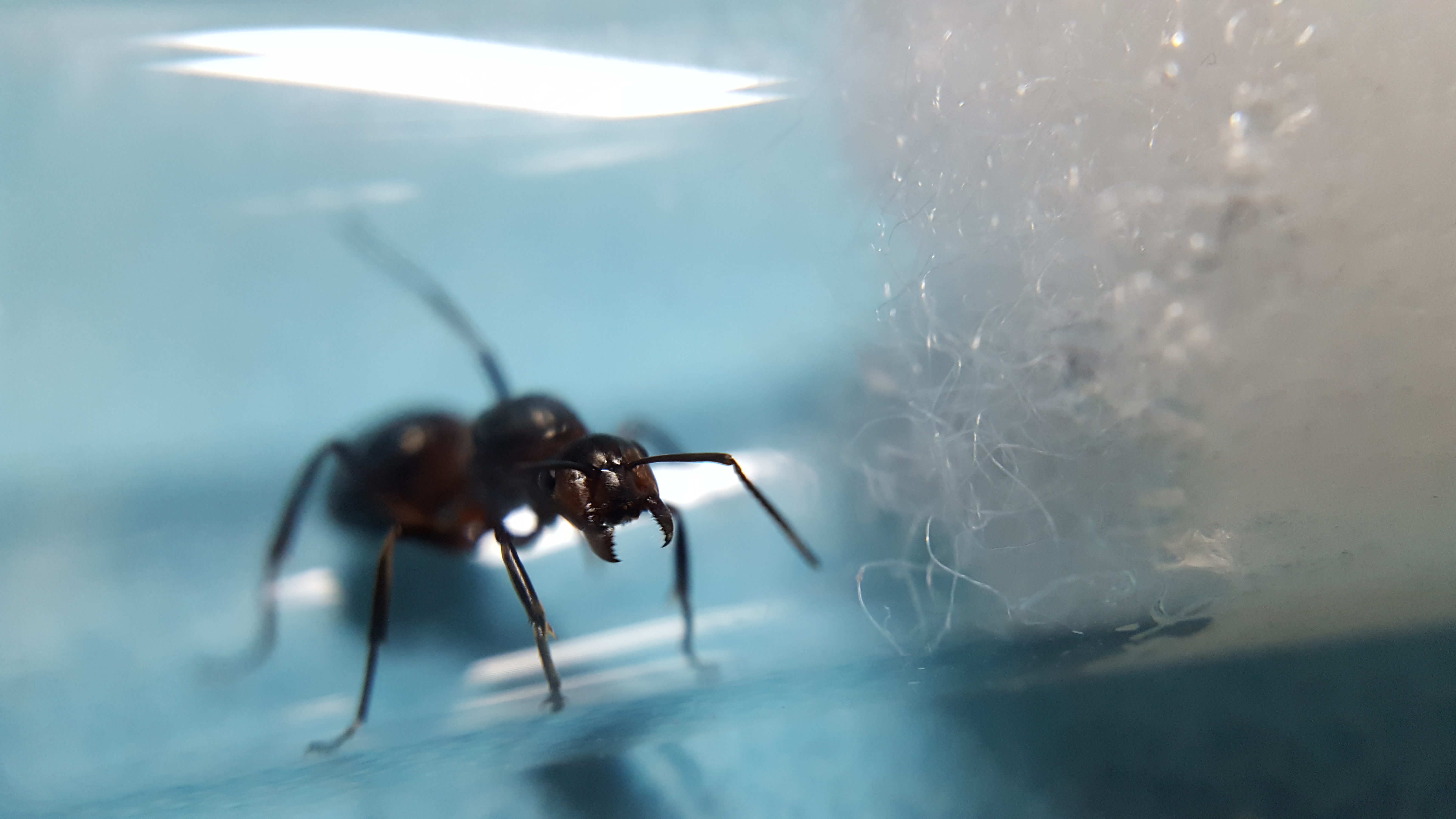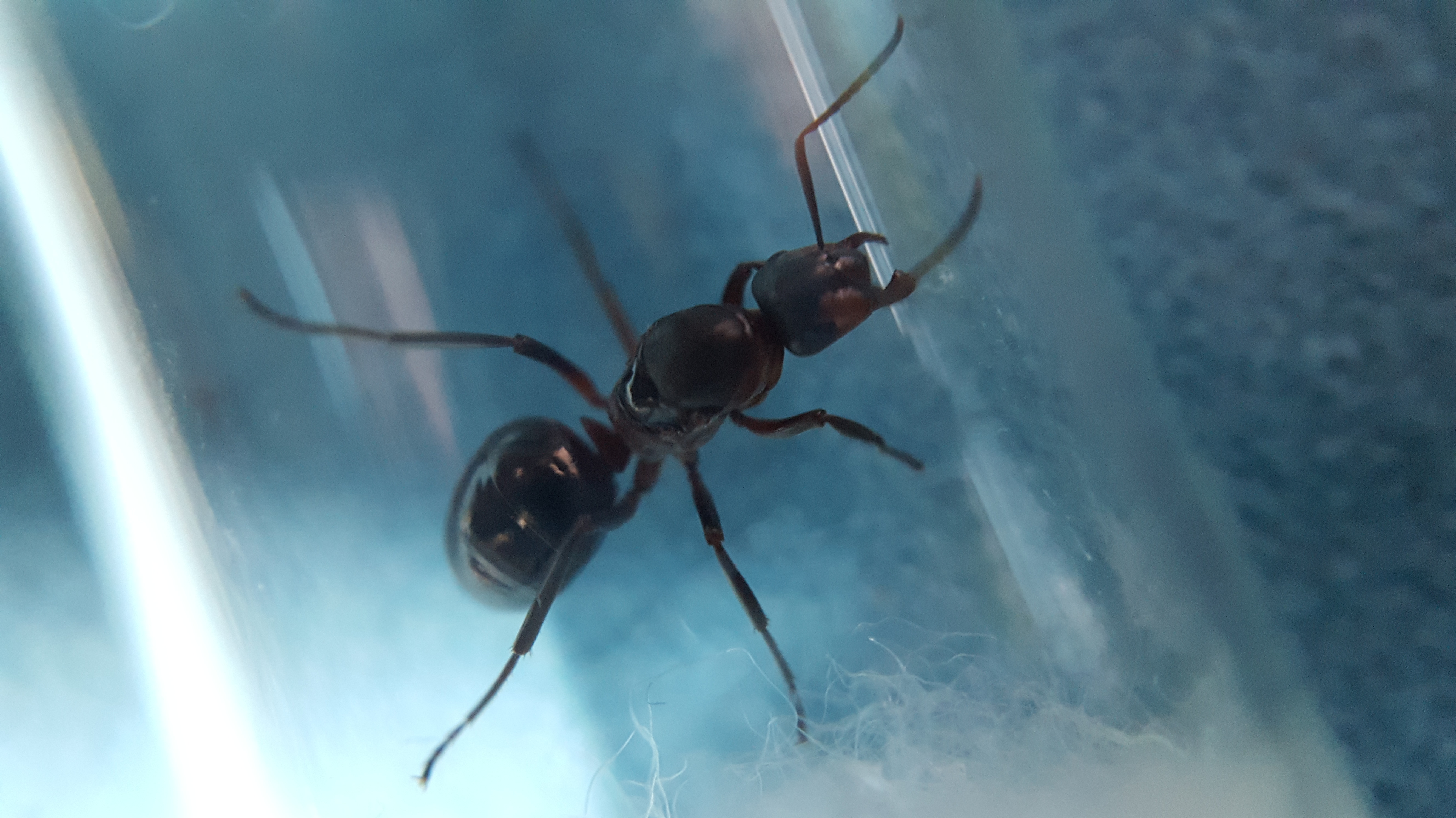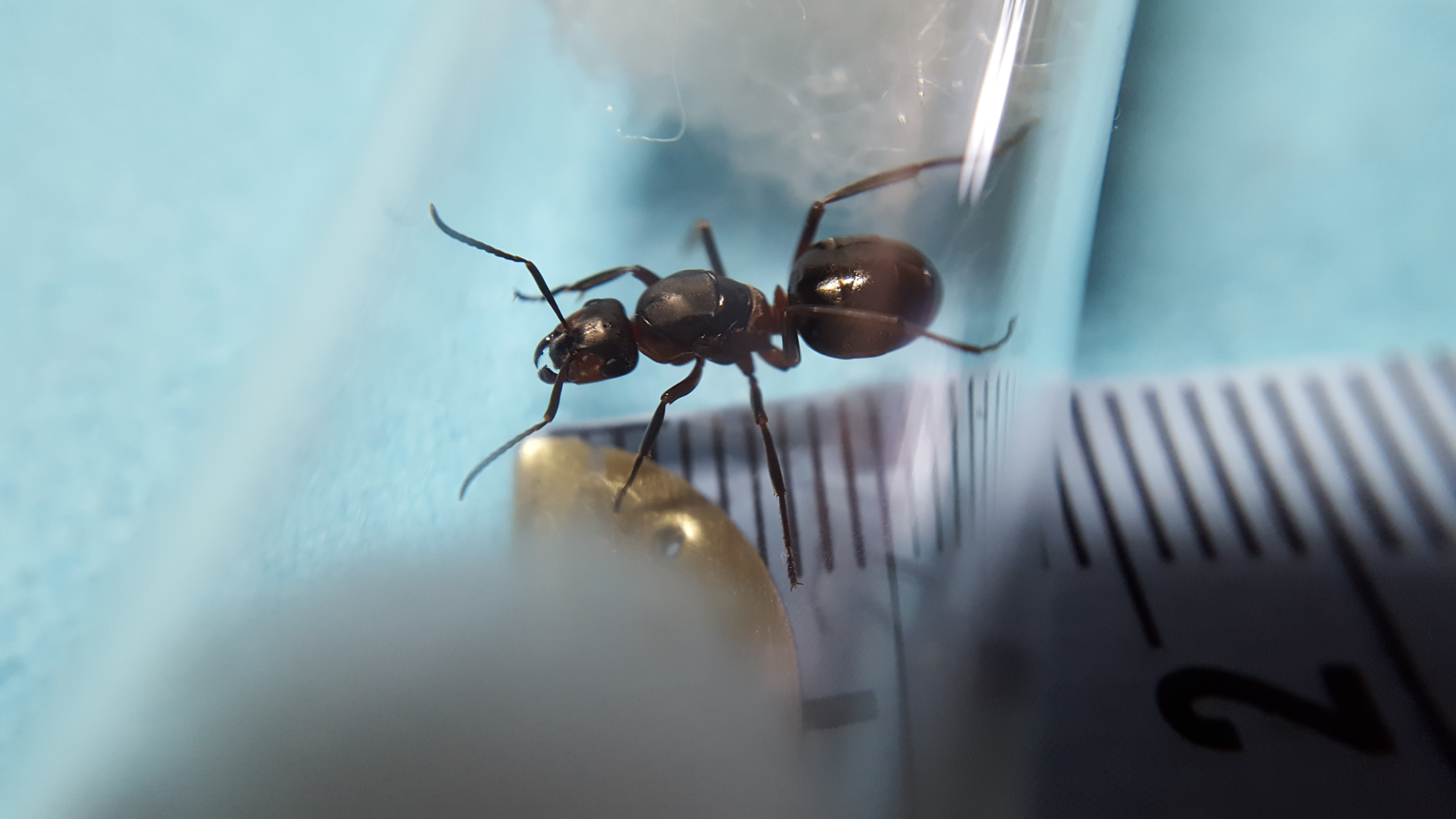 Königin ist ca. 12 mm groß. An der Oberseite schwarz glänzend mit schwarzen matten Stellen und an den Seiten und der Unterseite etwas braun/rötlich. Sie reagiert sehr stark auf Bewegungen, also sie scheint gut sehen können.