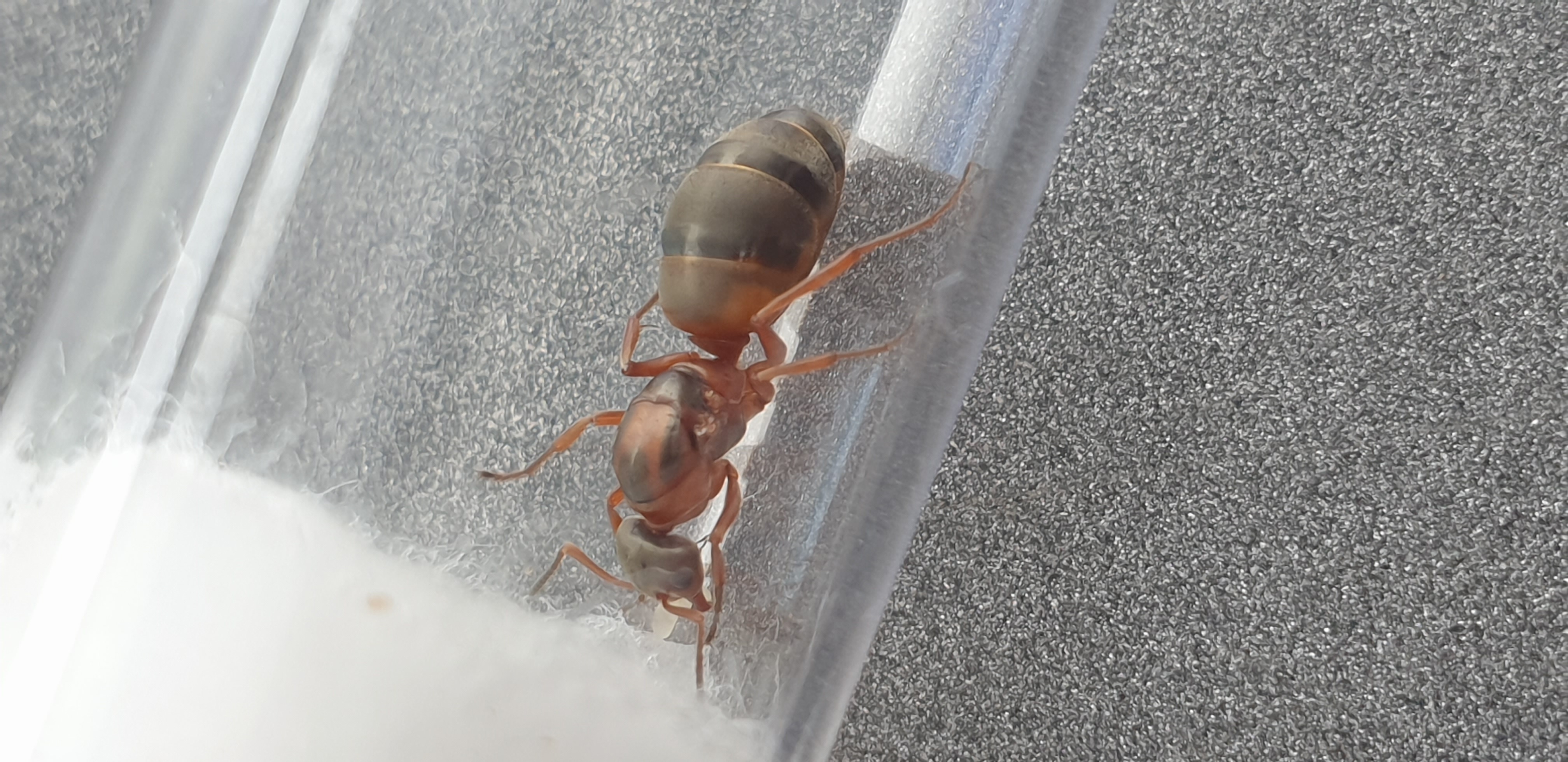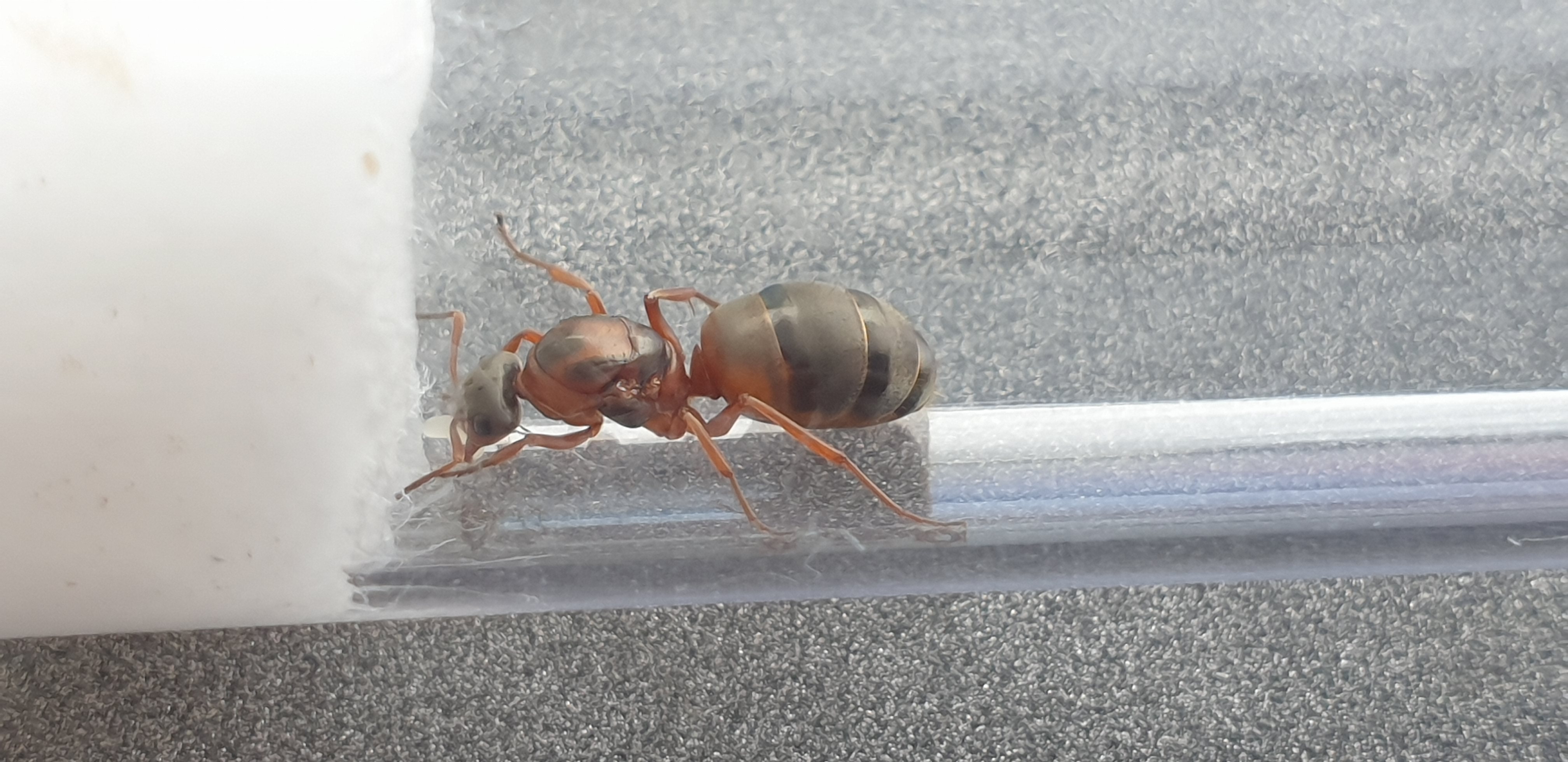 Zumal mir bei Formica rufibarbis auffällt (oder eben clara) dass es individuell starke Unterschiede zu geben scheint.Mal ist,wie bei dieser Gyne hier- das erste Gastersegment sehr hell,fast schon gelb und bei meinen etwa komplett schwarz.