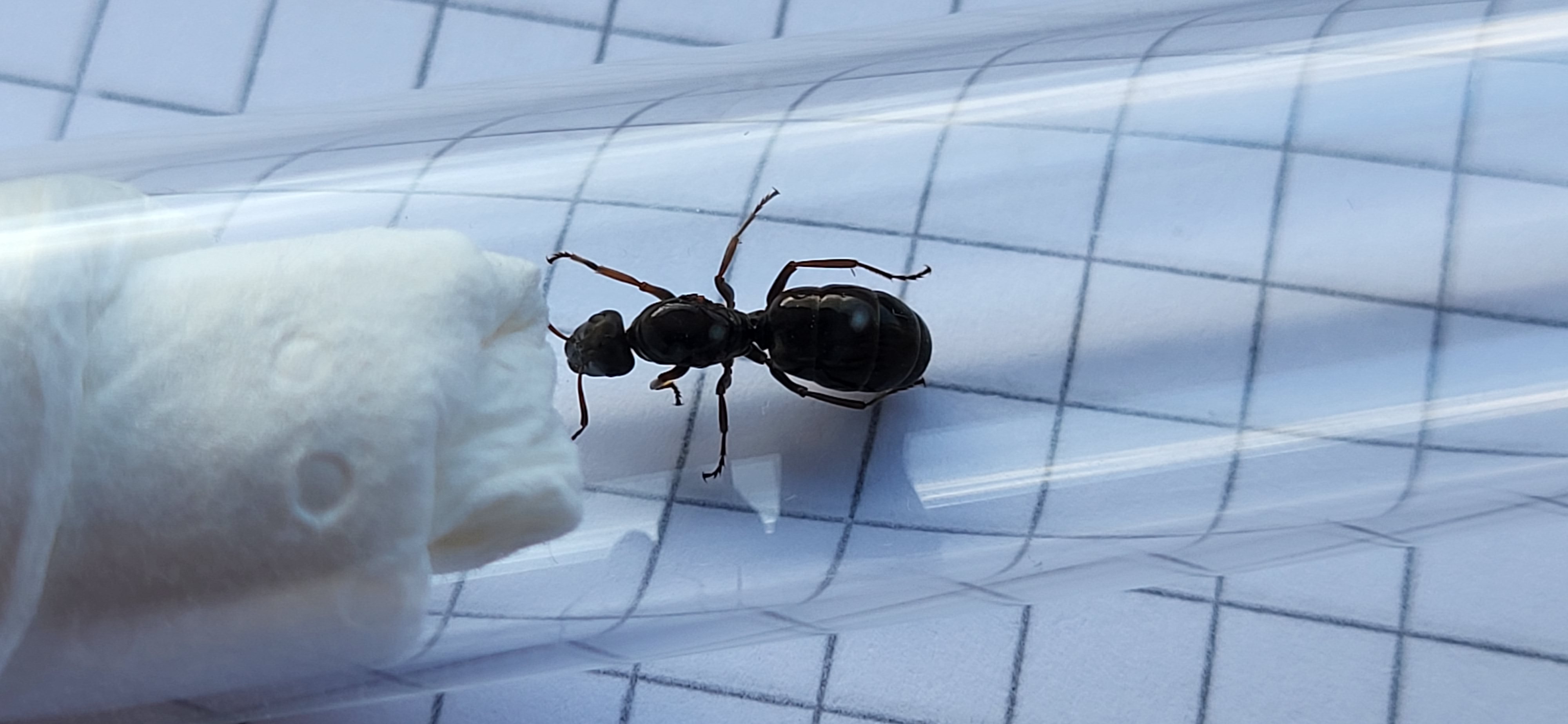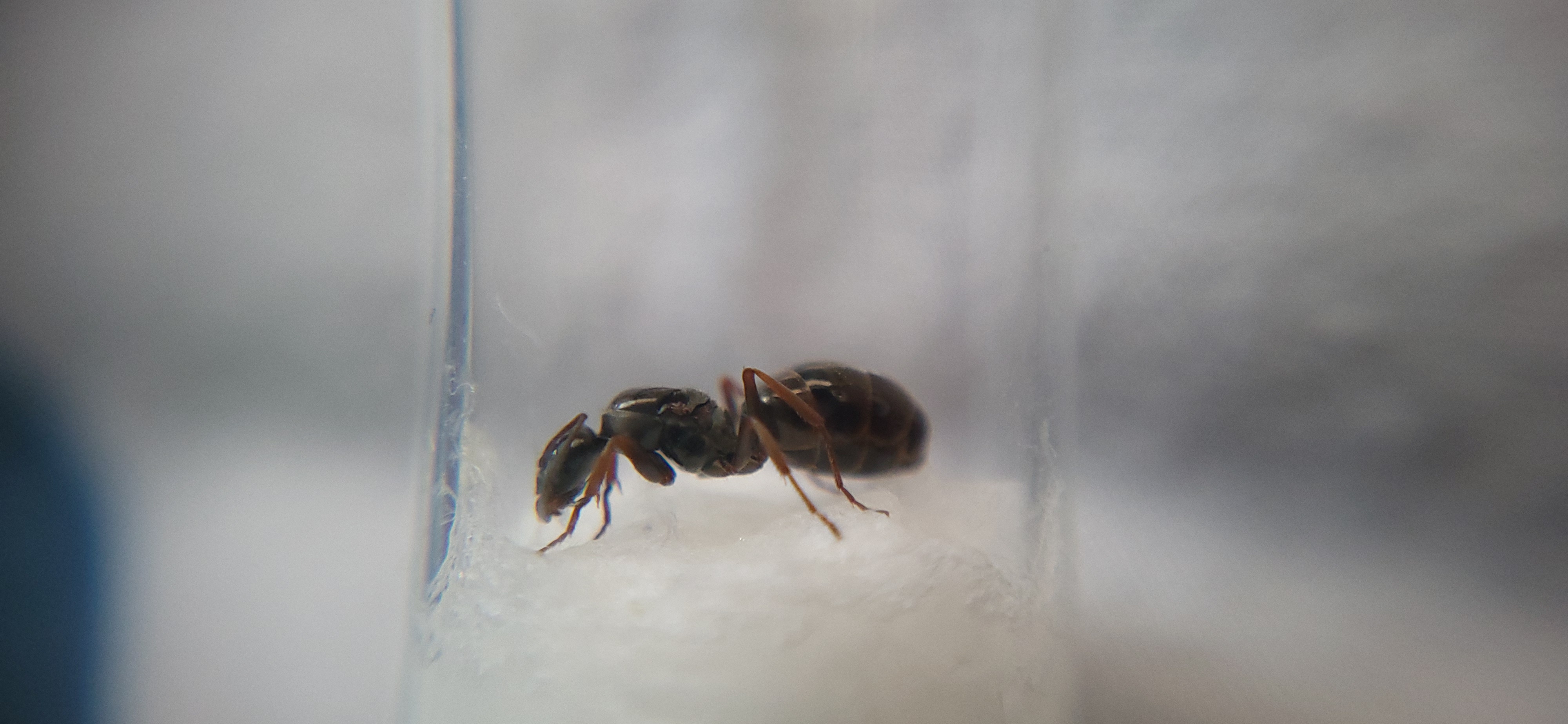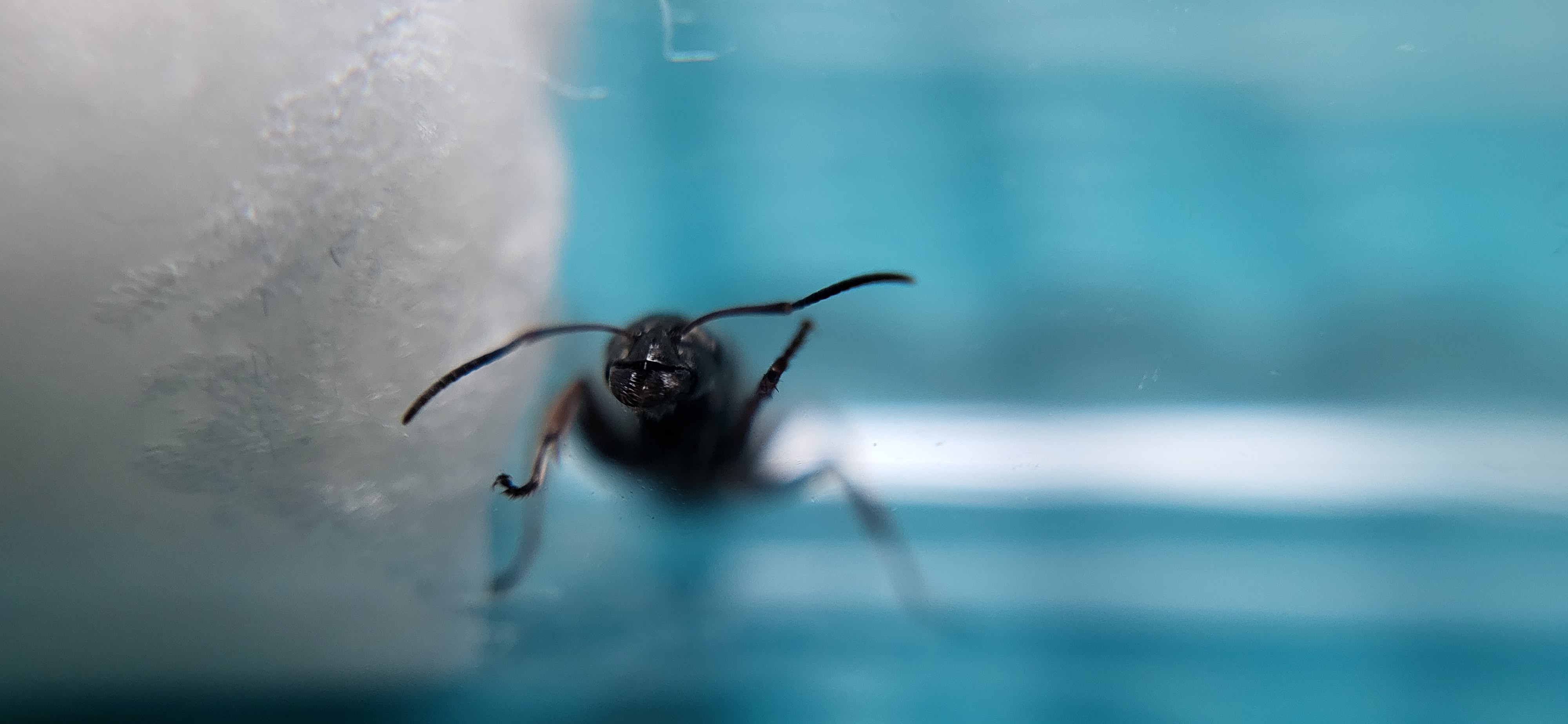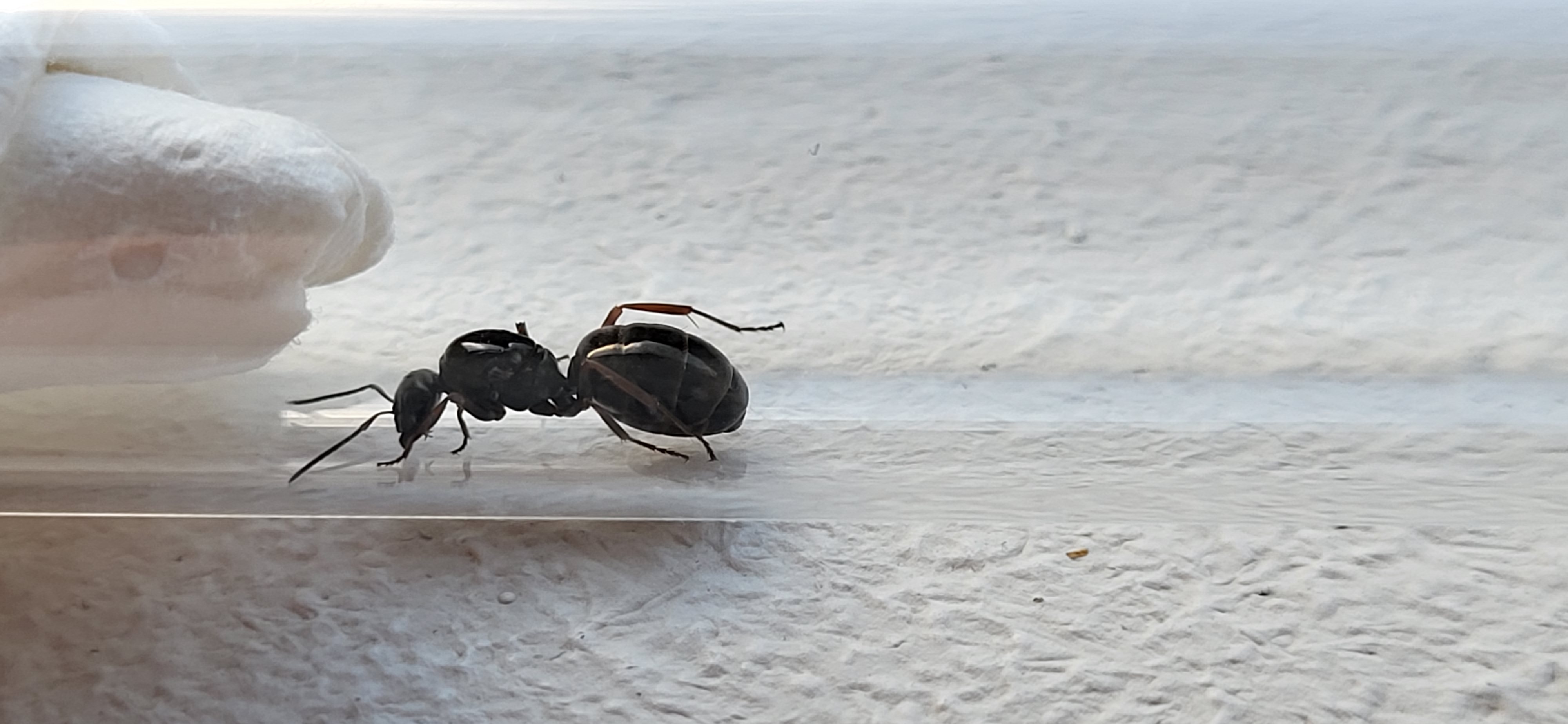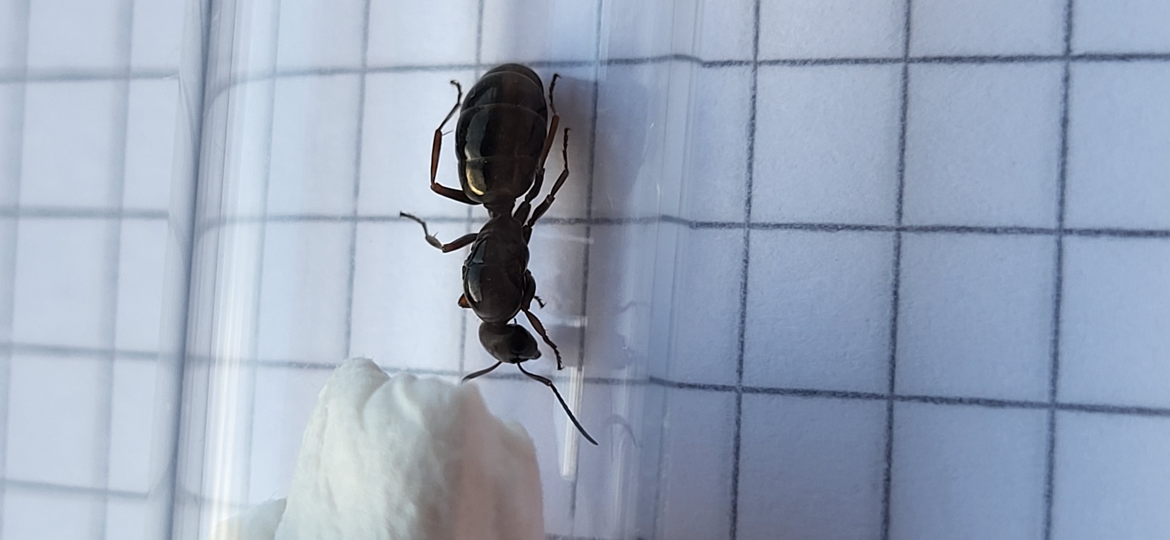 Nach meinen bisherigen Recherchen vermute ich aufgrund der Größe ( 9 bis 9.5 mm) und des Bewegungsverhaltens, dass es Camponotus piceus sein könnte. Sie lief schnell kleine Stücke und hielt dann immer inne. Generell ist sie sehr flott.