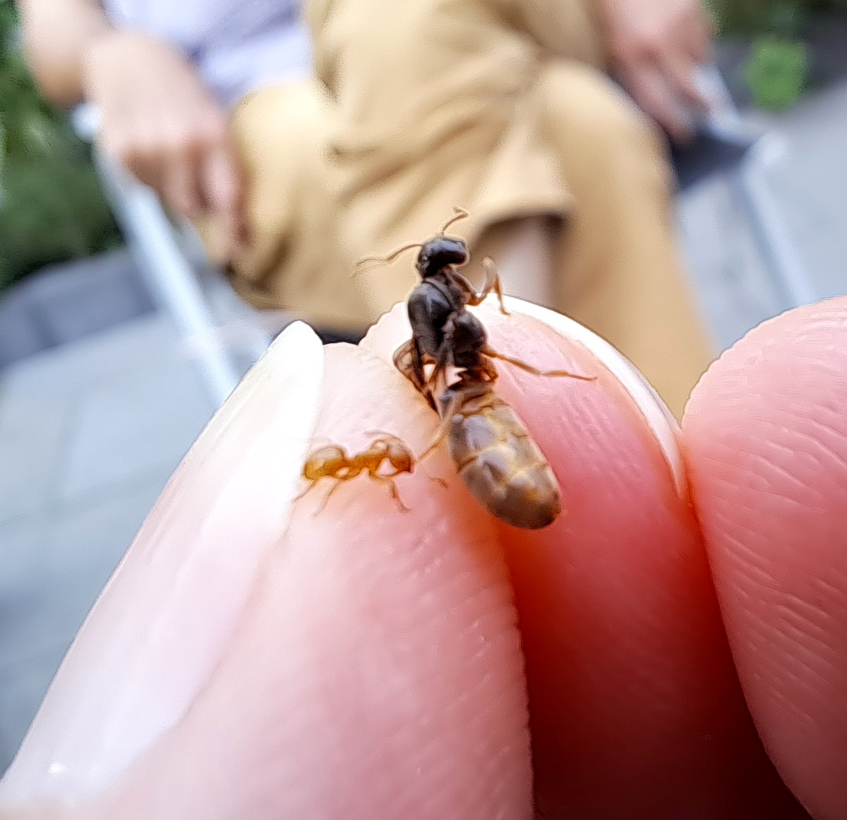 Mich interessiert nun aber der blinde Passagier, der sich an einem Bein festgebissen hatte. Die kleine Arbeiterin sieht m.E. nicht nach einer Lasius niger aus. Oder doch?