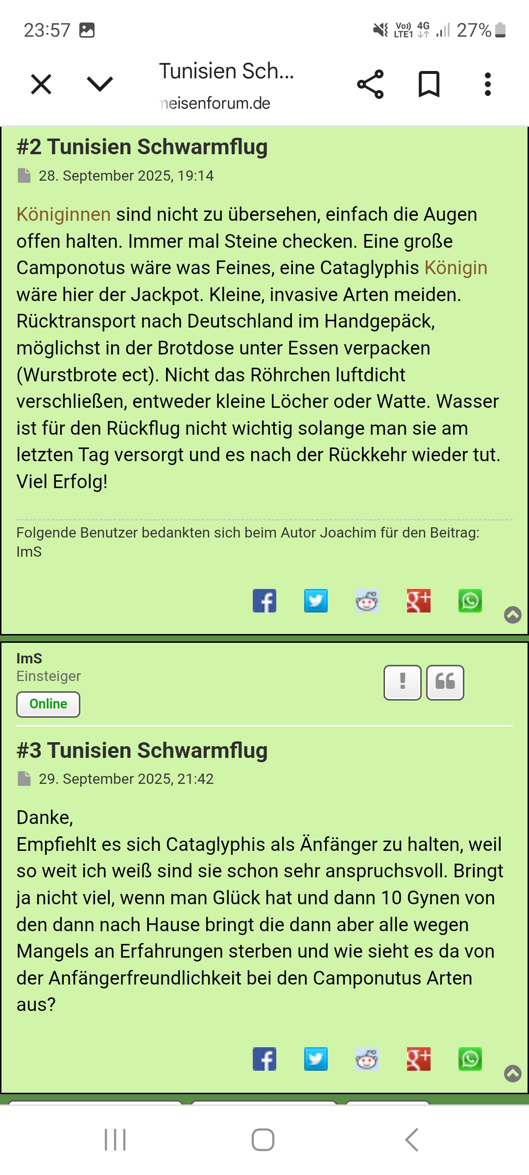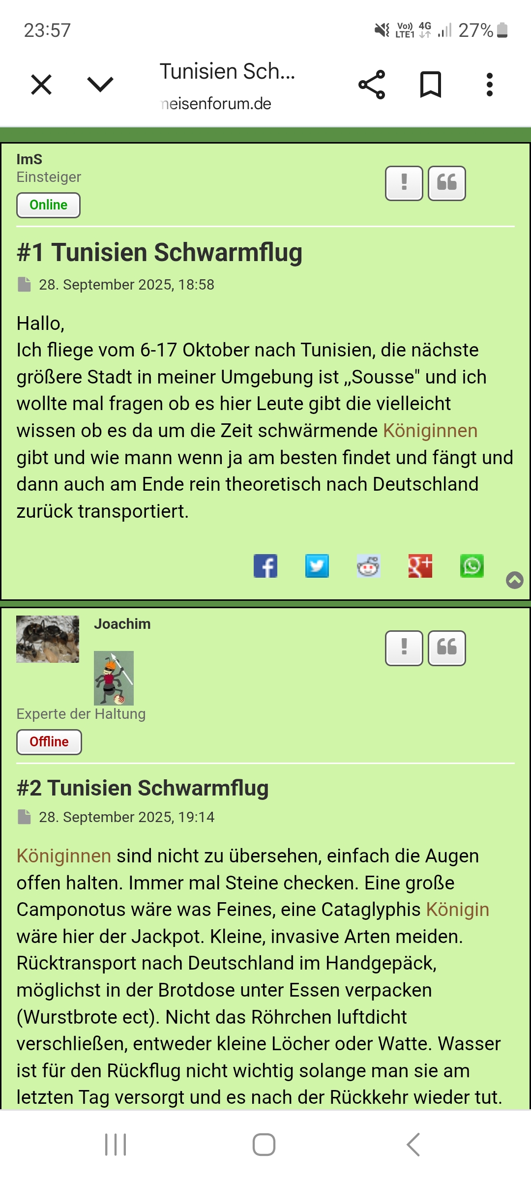 Nun zum Bericht bezĂŒglich den Ameisen hier in Tunesien fĂŒr Leute die sich dafĂŒr interessieren. Ich habe vor ein paar Wochen ja schon einmal einen Thread aufgemacht zum Thema Schwarmflug in Tunesien(werde davon ein paar Screenshots hier dranhĂ€ngen, weil ich leider nicht ganz weiĂ wie ich das hier auf dem Handy verlinken kann). Dazu kann ich schonmal sagen, dass ich keine ergattern konnte. Das hatte vorallem die GrĂŒnde das vorallem in meinem Hotel die Ameisenvielfalt sehr gering und ich auĂer der einen die ich hier fotografiert nur viele Pharaoameisen und etwas gröĂerer Ameisen gesehen habe die fĂŒr mich wir Mymrica Rubra ausgesehen haben. Das liegt wahrscheinlich daran weil die Hotels alle gröĂeren sofort bekĂ€mpfen wĂŒrden. Ich wĂŒrde auch sagen das sie sich damit auch selbst ins Bein schieĂen, weil dadurch ja die kleinen Pharohameisen keine Konkurrenz haben. AbschlieĂend lĂ€sst sich sagen das wenn man wirklich Ameisen die man hier nicht sieht beobachten oder vielleicht auch Königinnen fangen will muss man wirklich raus in die Natur, weil in den Hotels und StĂ€dten findet man laut meiner Erfahrung nichts.