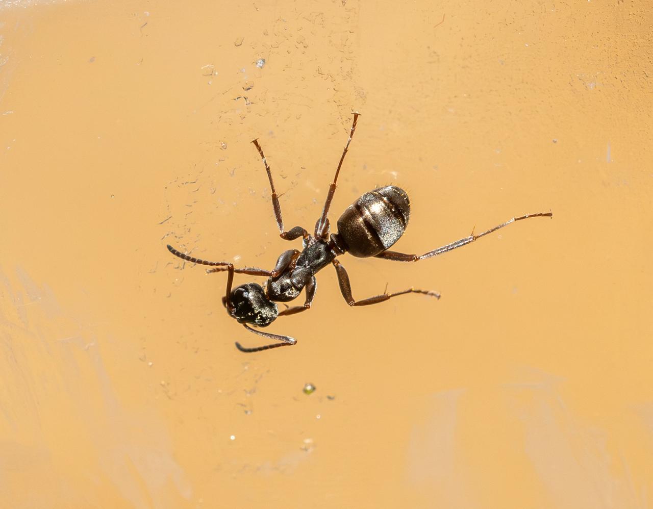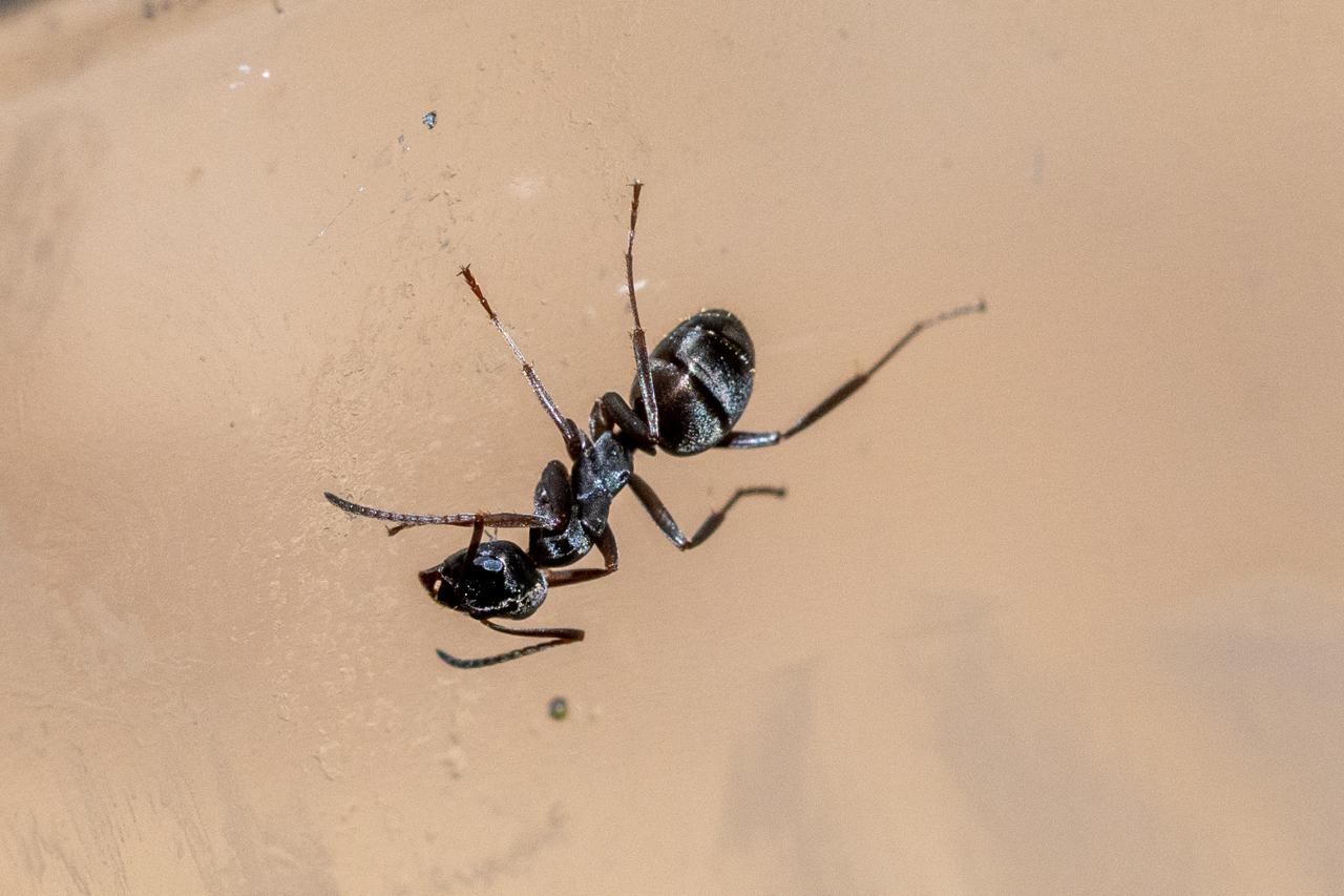 Hallo zusammen, wir wohnen waldnah in Brandenburg und haben einiges Getier im Garten. Seit ein paar Wochen nun bemerken wir in unserer Küche vereinzelte größere schwarze Ameisen mit ziemlich langen Beinen. Sie sind immer auf der Arbeitsplatte unterwegs in der Nähe der Spülmaschine. Küchenzeile grenzt an Außenwand, draußen an der Stelle ist ein Sockel aus Granitpflaster, der Hohlräume hat (waren schon mal Mäuse drin). Wie/wo genau die Ameisen ins Haus kommen konnten wir noch nicht herausfinden, die Fußleisten in der Küche über dem Parkett haben allerdings genau in diesem Bereich größere Schlitze. Hauswand Holzständerbauweise. Mit Rumpflänge 5-6 mm sind die Krabbler recht groß und heute ist es uns endlich mal gelungen, ein naschendes Exemplar zu fotografieren.