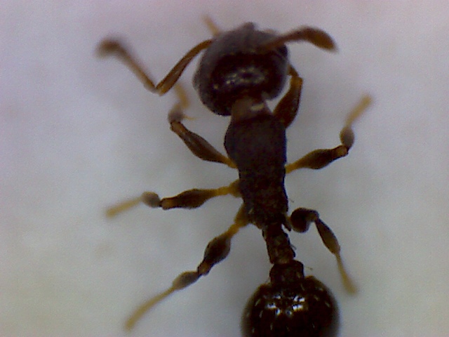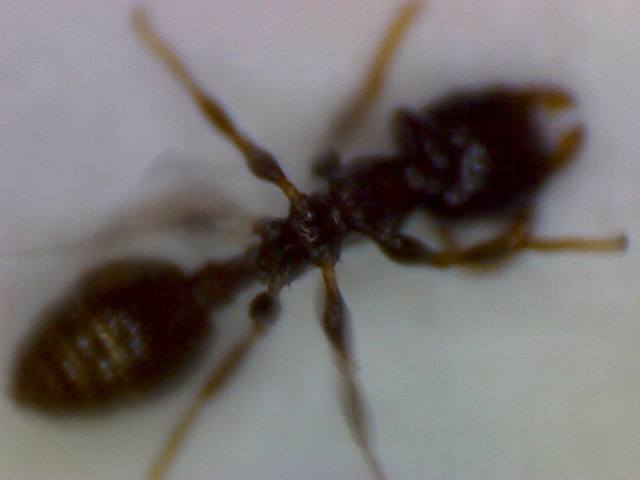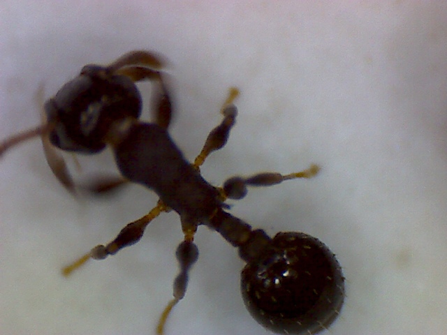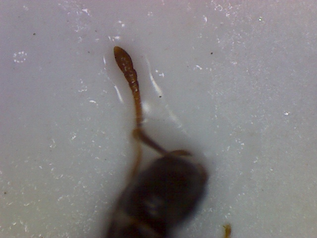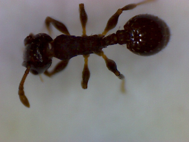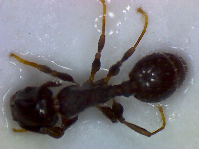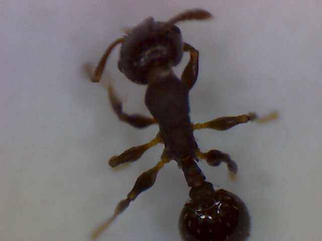 Ameise ist ca 1.5-2mm gross, rotbraun und - wie ich finde - auffallend sind ihre abgeflachten Auswulste an den Beinen.