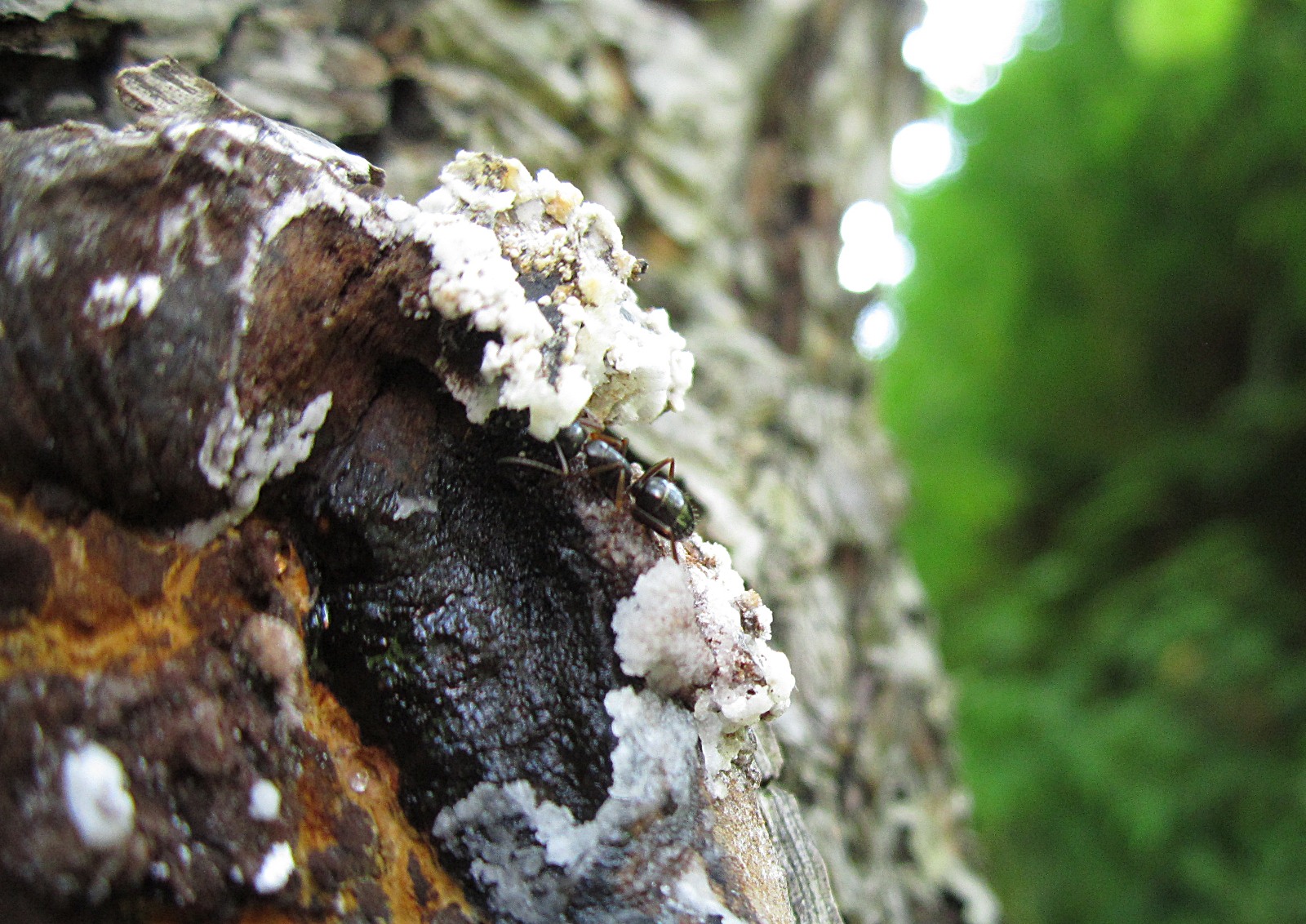 Kann es sein, dass die Art sich auch von jungen Baumpilzen ernährt? Dazu fand ich im Netz keine Angaben. Habe sie jetzt zwei Tage am Entstehungsort eines neuen Fruchtkörpers beobachtet. Oder sind sie nur auf das Baumharz aus? Leider hat meine Kamera keinen manuellen Fokus und ich kanns nur verwackelt aufnehmen.