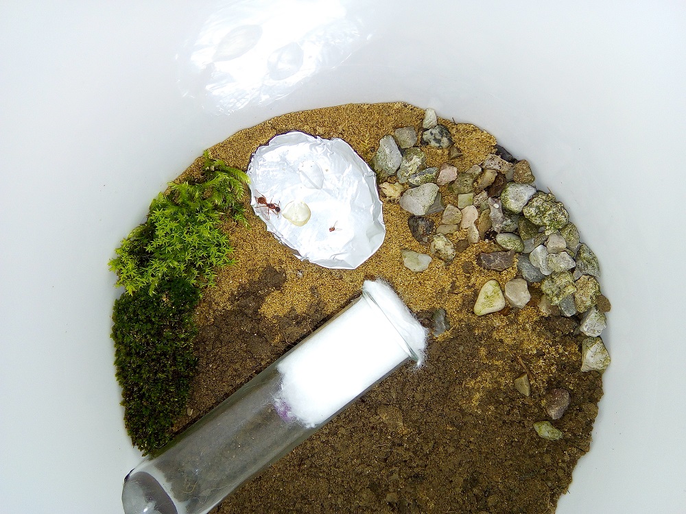 Das Reagenzglas sollte eigentlich das Nest sein... das RG ist ganz draußen, der "Eingang" zum RG ist der Ausgang aus der Arena. Auf dem Alu-schälchen sind Wasser- und Honig-Tröpfchen. Braucht sie denn ein Nest zum selber buddeln?