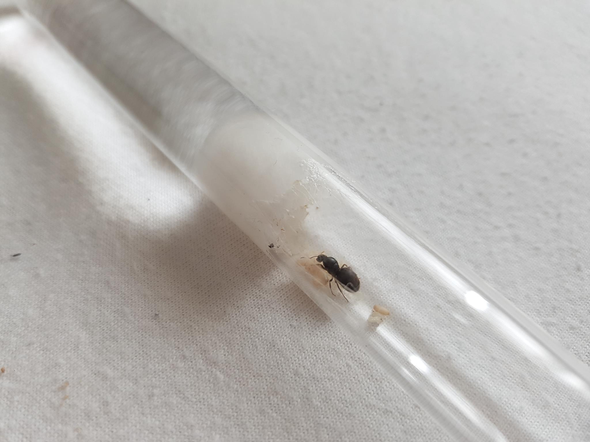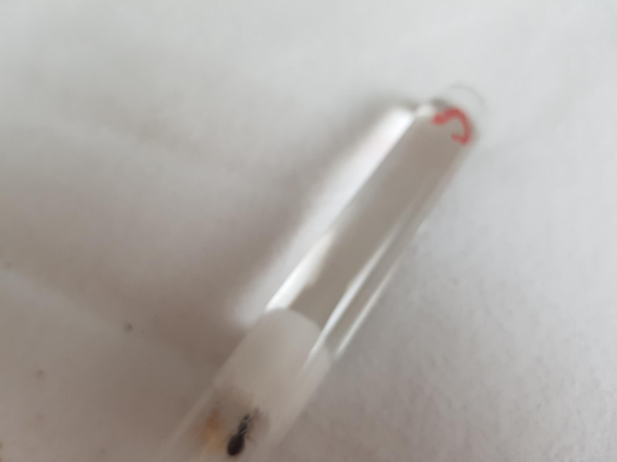 Glas Nr. 10 (ca. 15 mm, schwarz, sehr nervös, reagiert schon empfindlich auf leichte Vibrationen, Arbeiterinnen ca. 9mm)