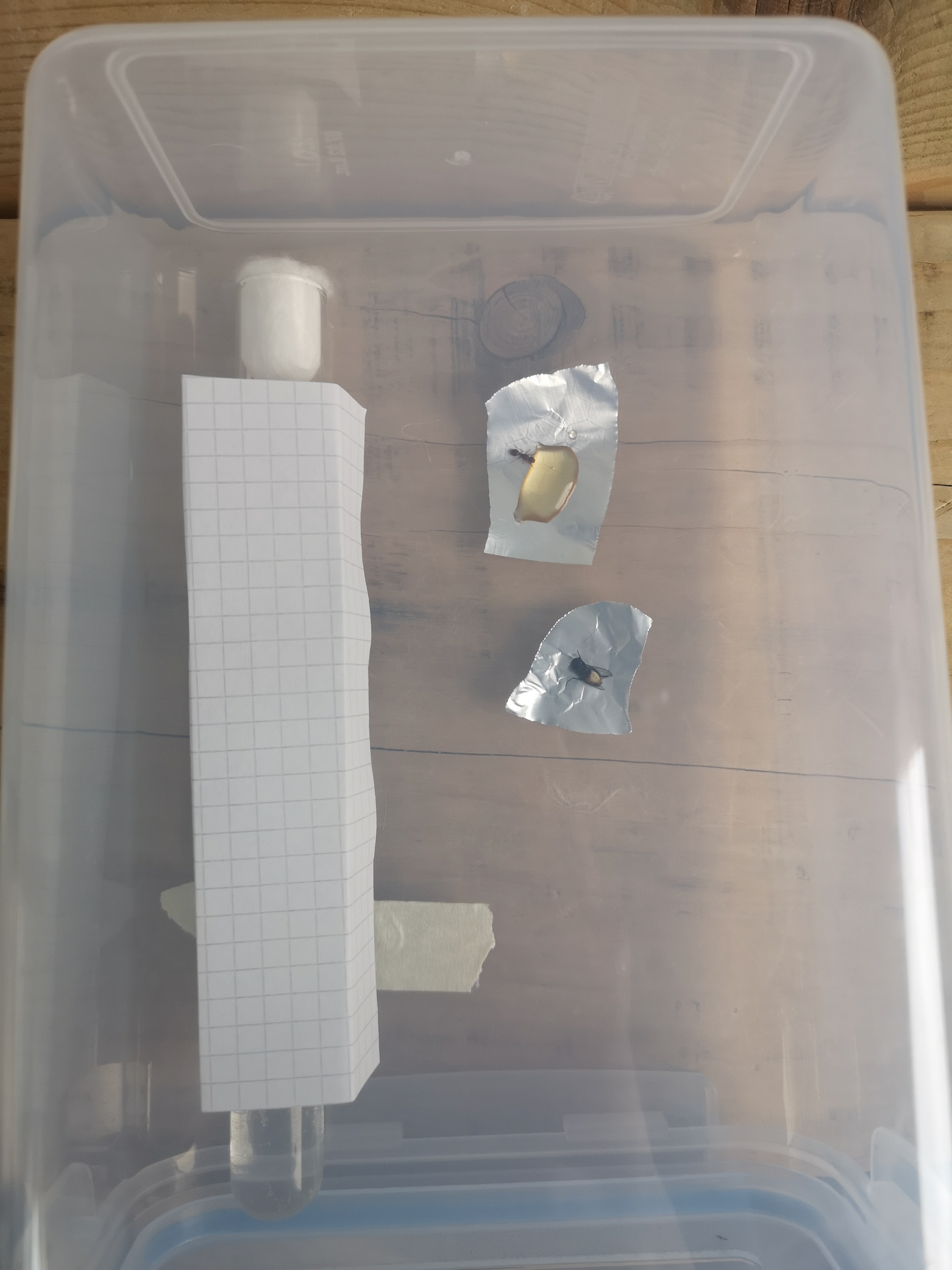 Es muss also eine Möglichkeit geben Futter auszutauschen ohne Erschütterungen zu verursachen. Wenn du bei der Alufolue ein Ecke nach oben biegst, kannst du sie mit der Pinsette leichter greifen ohne den Plastikboden zu berühren.