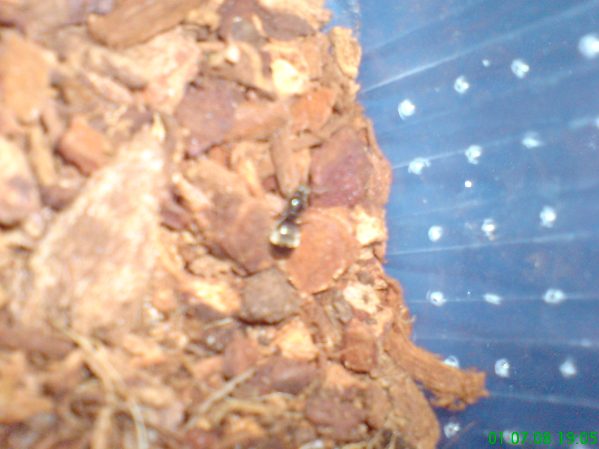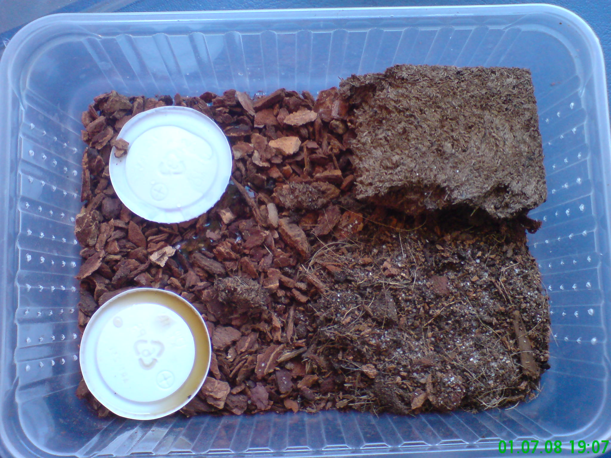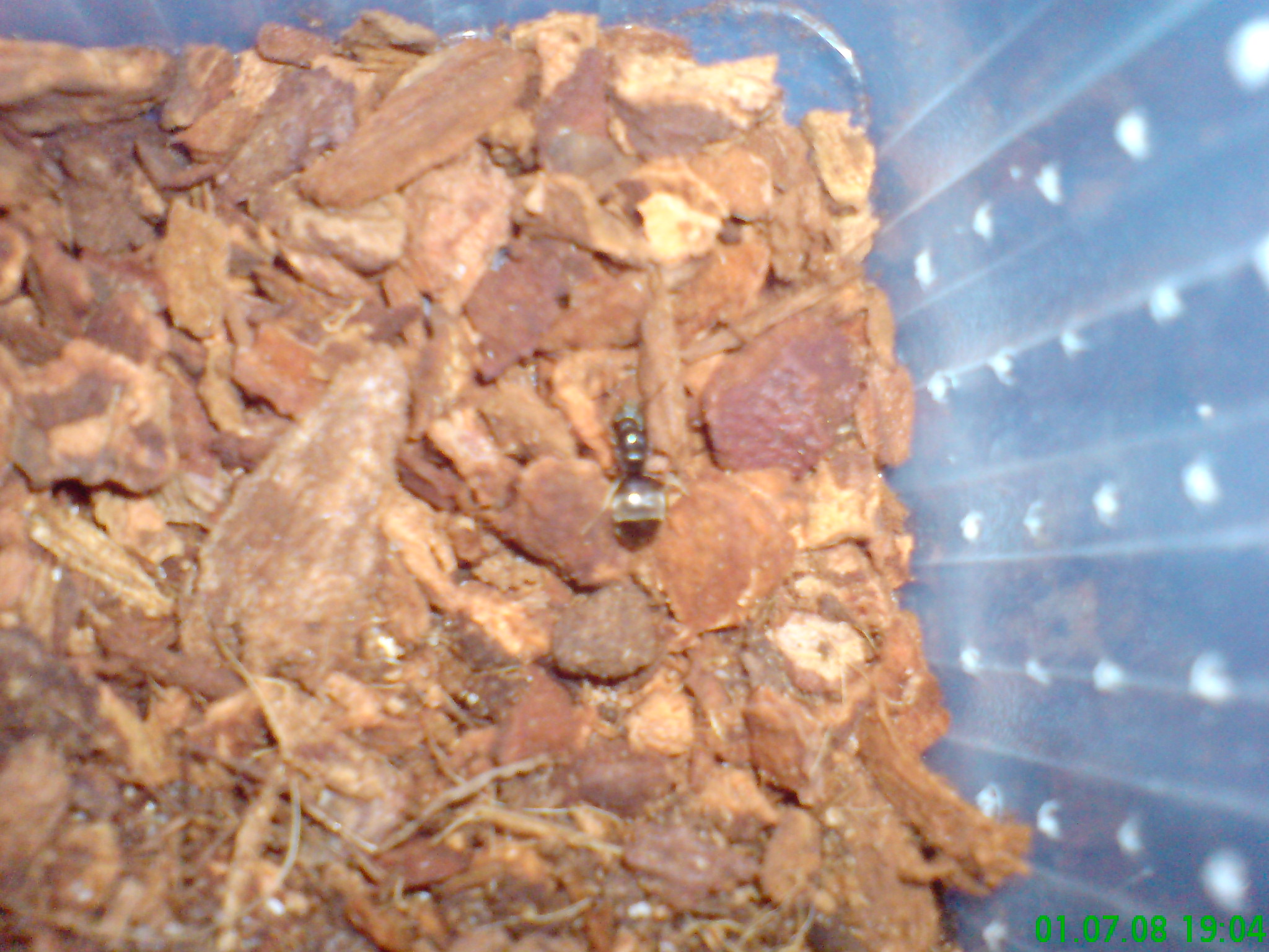Die Gyne sitzt jetzt in einem Reagenzglas, abgedunkelt durch Torf und Alufolie. Wassertank ist drin und das ganze ist mit einem Wattepfropfen verschlossen. Das Reagenzglas befindet sich in der großen Heimchenbox, weche wiederum im Schrank steht.