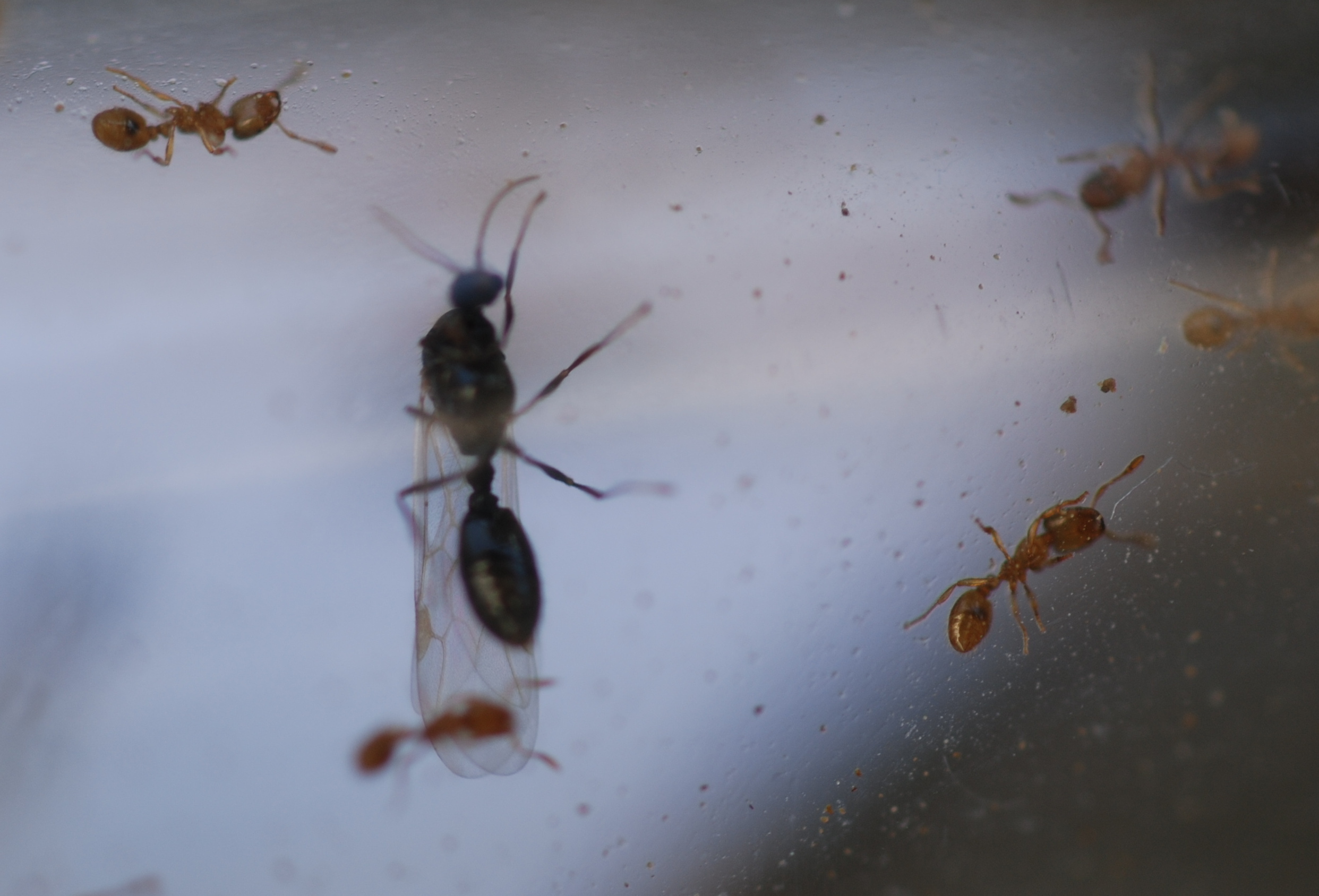 Die Ameisen sind sehr agil und sehr gute Ausbrecher. Bei dem Reagenzglas haben sie sich durch kleinste Falten in der Watte geschoben.