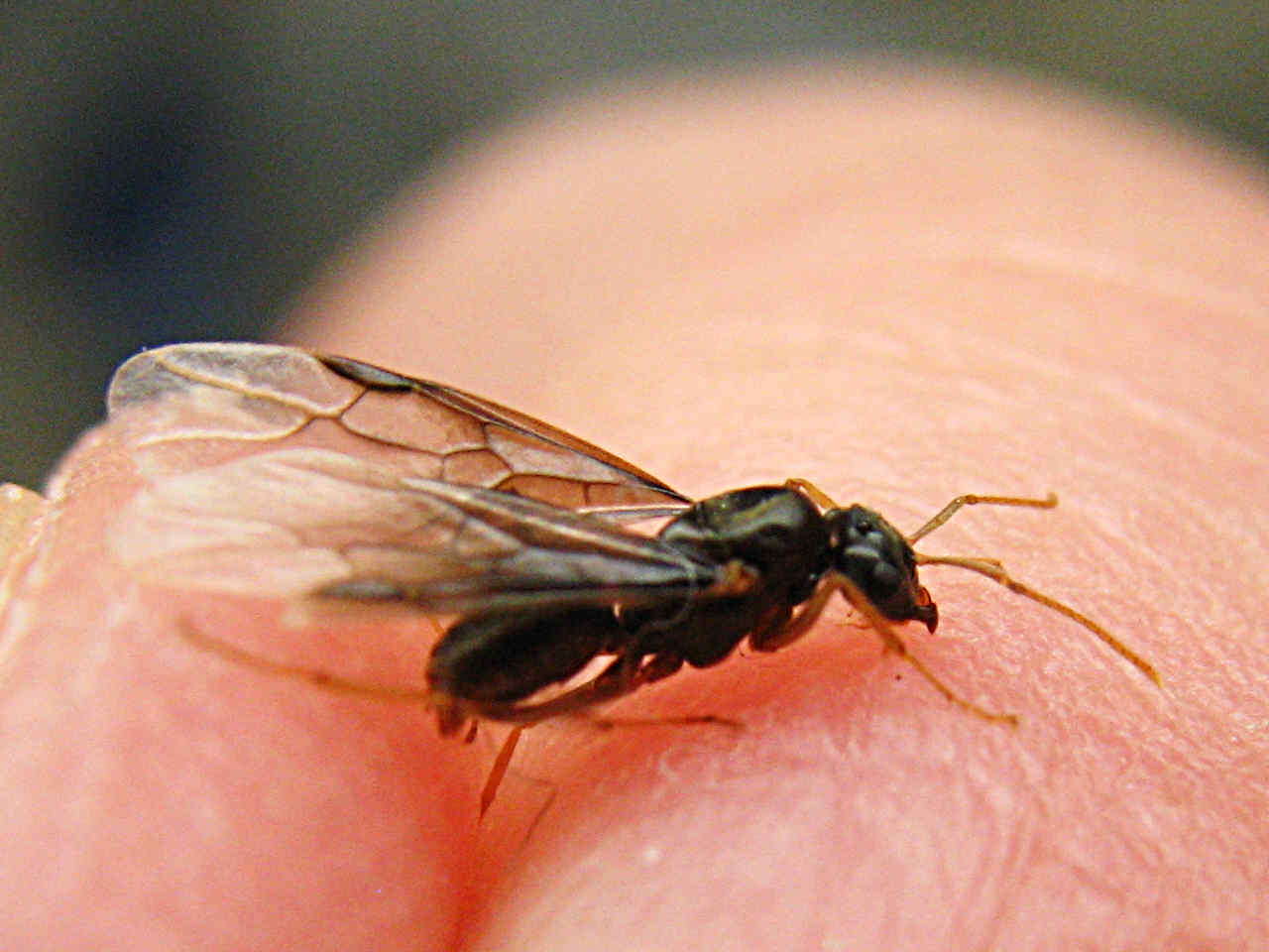 Vor meinem Fenster ist ein großer Blumentopf unter dem es sich eine gelbe Lasius bequem gemacht hat -- übrigens sehr zu meinem Mißfallen (Wurzelläuse). Unter dem Topf konnte ich eines der unbekannten Insekten inmitten der Lasius entdecken. Scheinbar konnte es sich frei bewegen und wurde nicht angegriffen. Etwa 20cm vom Topf entfernt waren unter einem Dachziegelbruchstück etwa 30 weitere lebende geflügelte Exemplare. Normale Arbeiterinnen waren dort nicht und vom Aussehen her waren sie alle gleich, also wahrscheinlich keine verschiedenen Geschlechter.