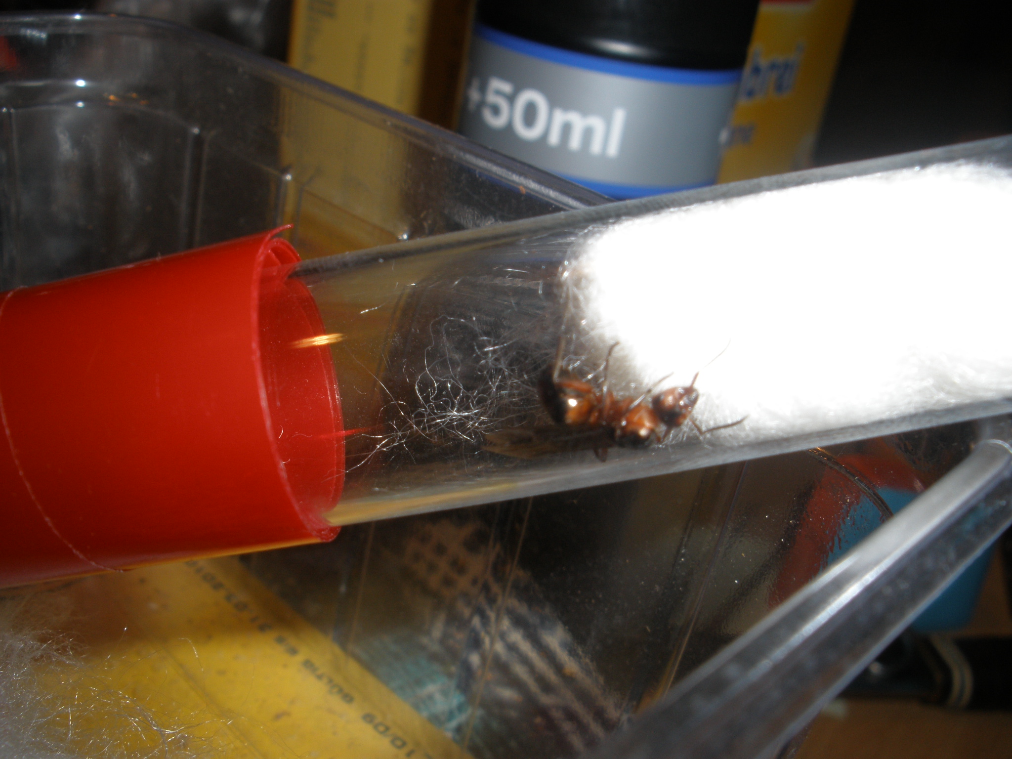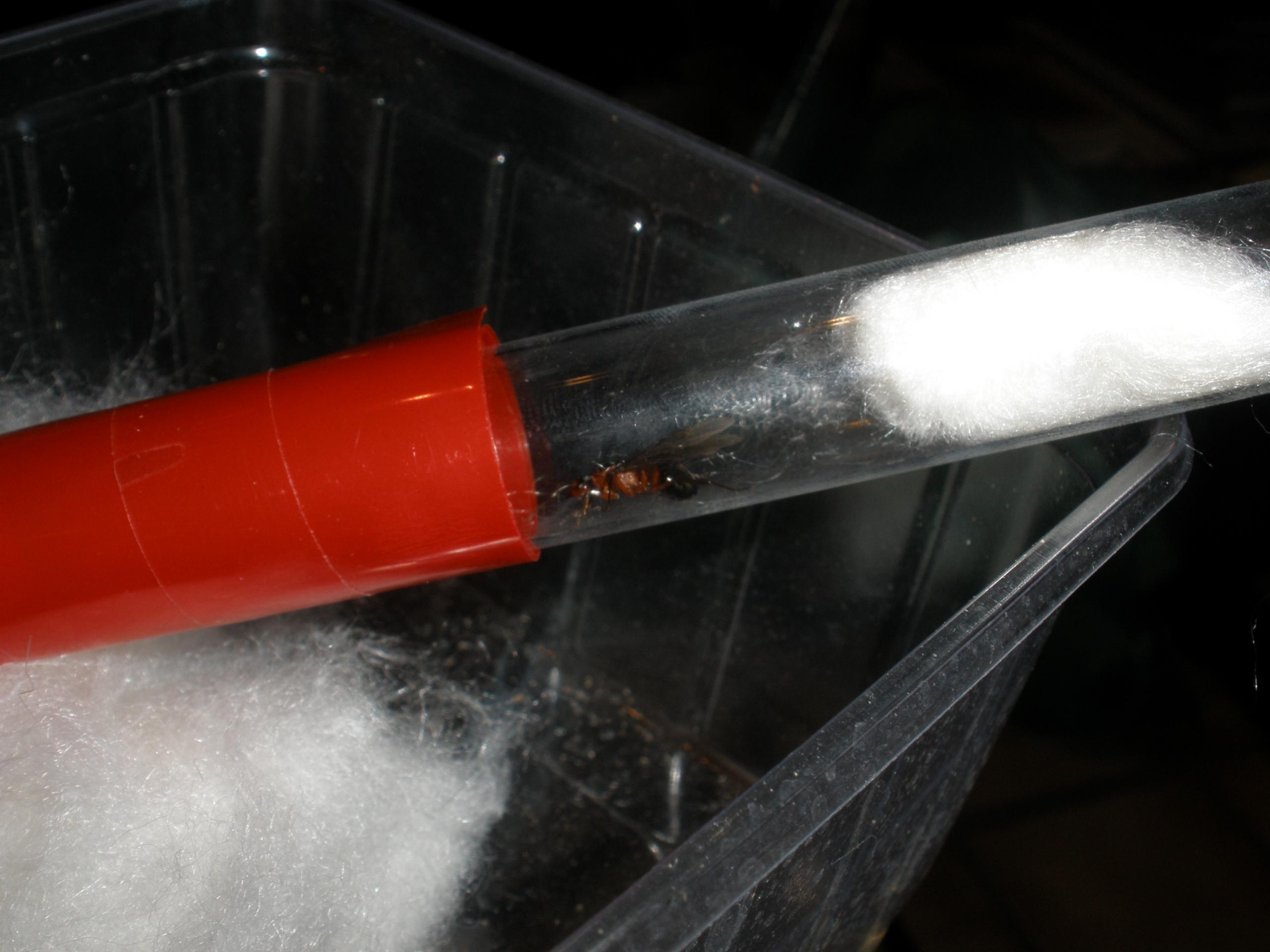 Momentan sitzt sie im Reagenzglasnest (auch mit roter Folie), scheint sich allerdings nicht im geringsten wohl zu fühlen und versucht herauszukommen.