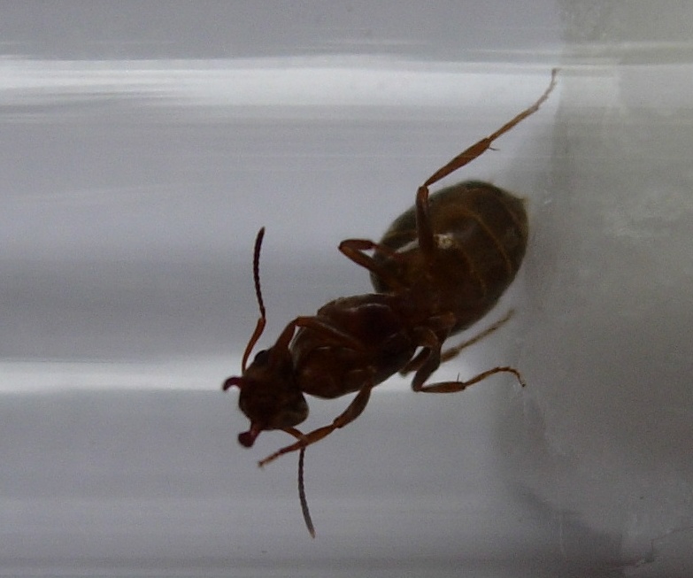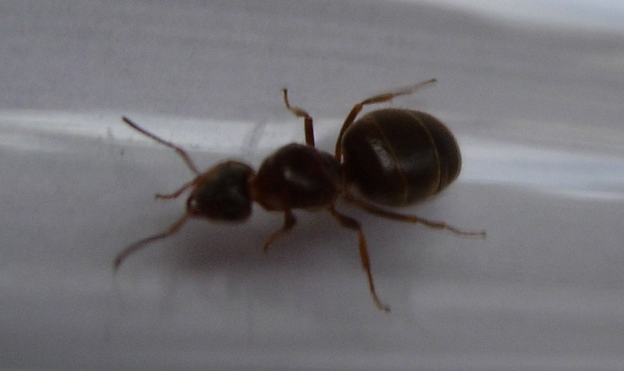 Farbe: Von oben wirkt die Königin feiner und etwas schlanker gebaut als eine Lasius niger. Die Färbung der Oberseite ist bräunlich/rötlich mit einem silberschimmer, der warscheinlich durch feine Häärchen herrührt, die Unterseite ist heller und geht ins rötlich/gelbe, die Beine sind auch bräunlich/rötlich gefärt, die Gelenke sind heller abgesetzt