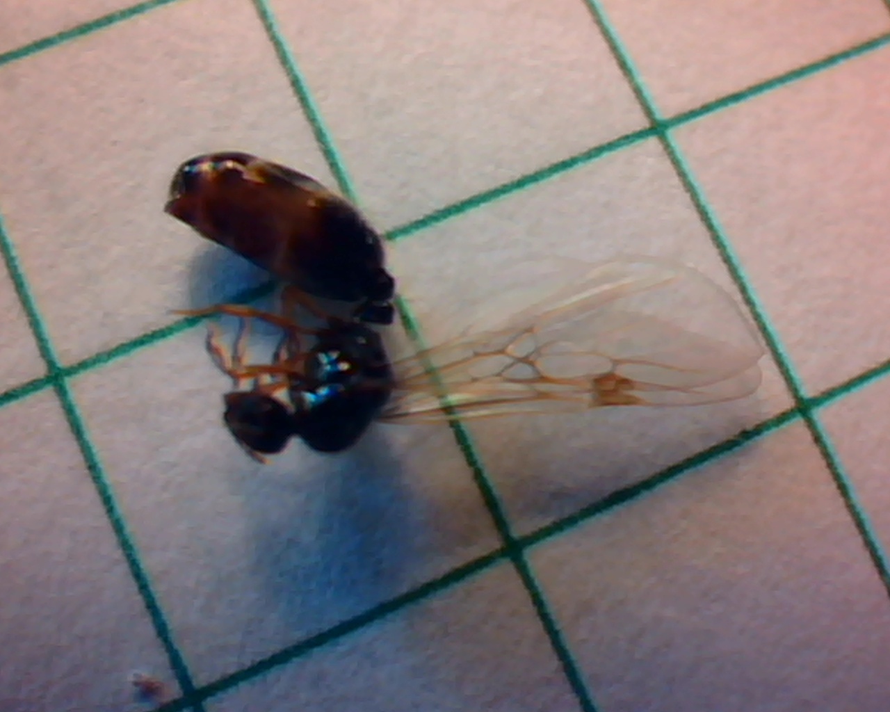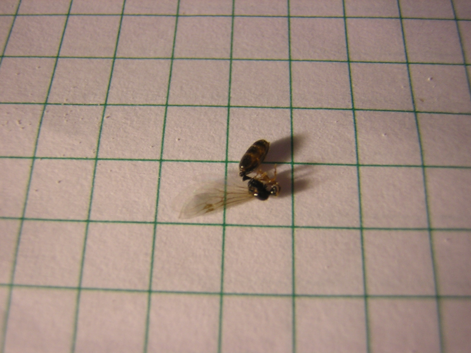 Da ich gestern einen Ytong auf meinem Gartentisch bearbeitet habe, sind einige Gynen, leider auf dem feinen Staub den ich dort zurück gelassen habe, verendet. Eine ungeflügelte Gyne konnte ich noch retten der Rest war leider schon im laufe des Vormittags gestorben.
