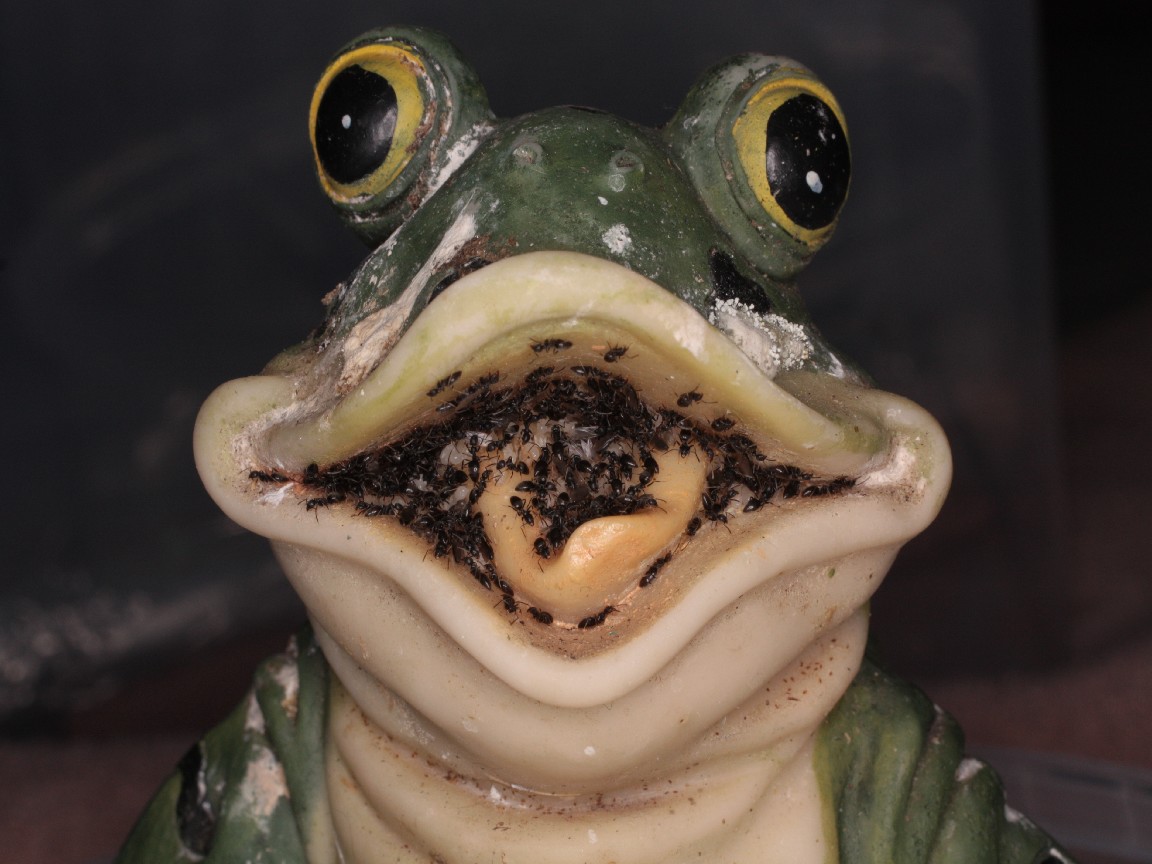 Gestern abend habe ich von einem Bekannten eine Porzellanfrosch geschenkt bekommen in dessen Mund sich eine Ameisenkolonie angesiedelt hat.