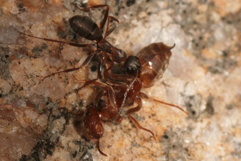 Eine Serviformica-Art (F. cunicularia od. F. rufibarbis) hat eine tote Chthonolasius-Gyne vor sich!