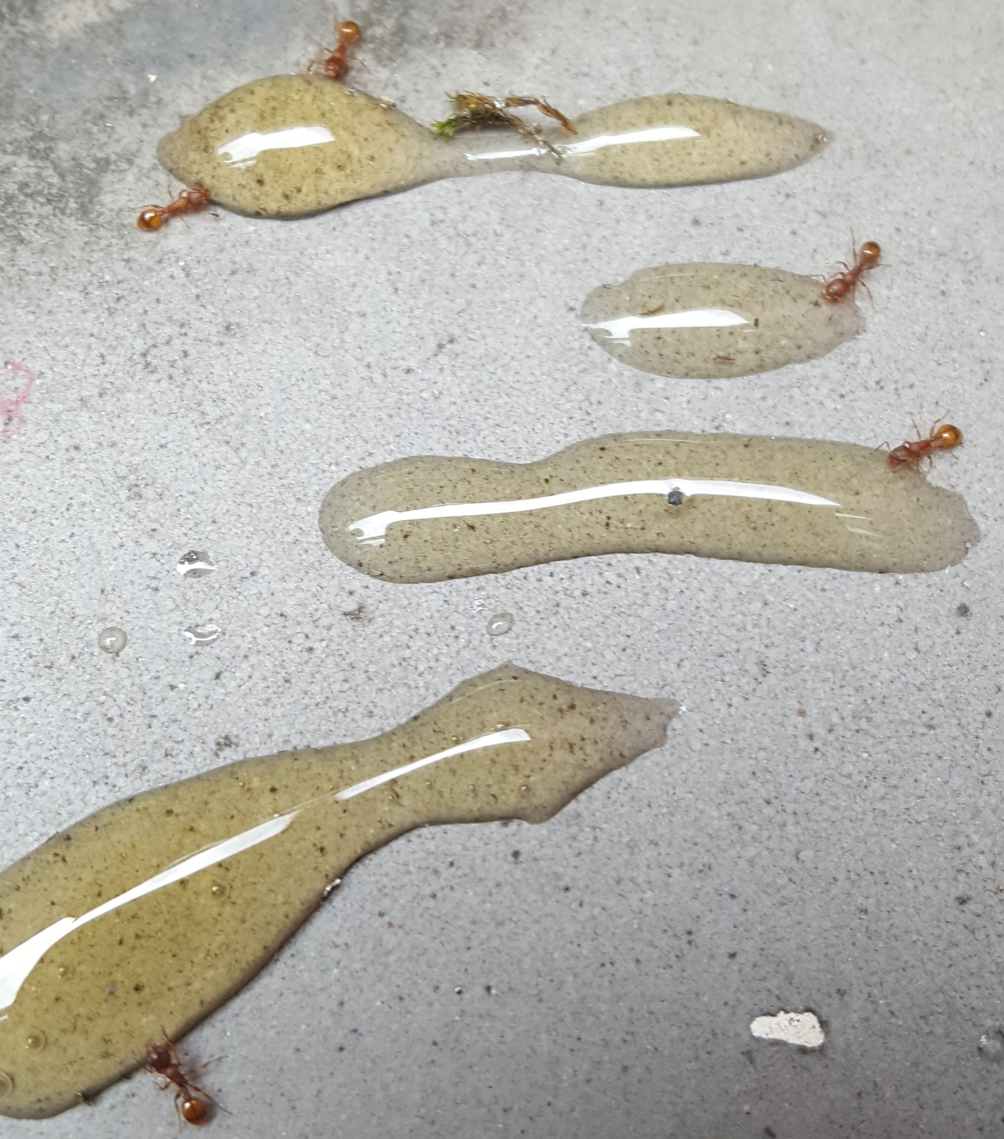 Ich bin ĂŒber diese Ameisen gestolpert, die an verschĂŒttetem Honig saugen. Da ich ein AmeisenanfĂ€nger bin, bin ich mir nicht sicher, um welche Art es sich handelt, habe aber den Verdacht, dass es Pharaoameisen sind. Bitte helft mir beim Bestimmen.